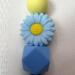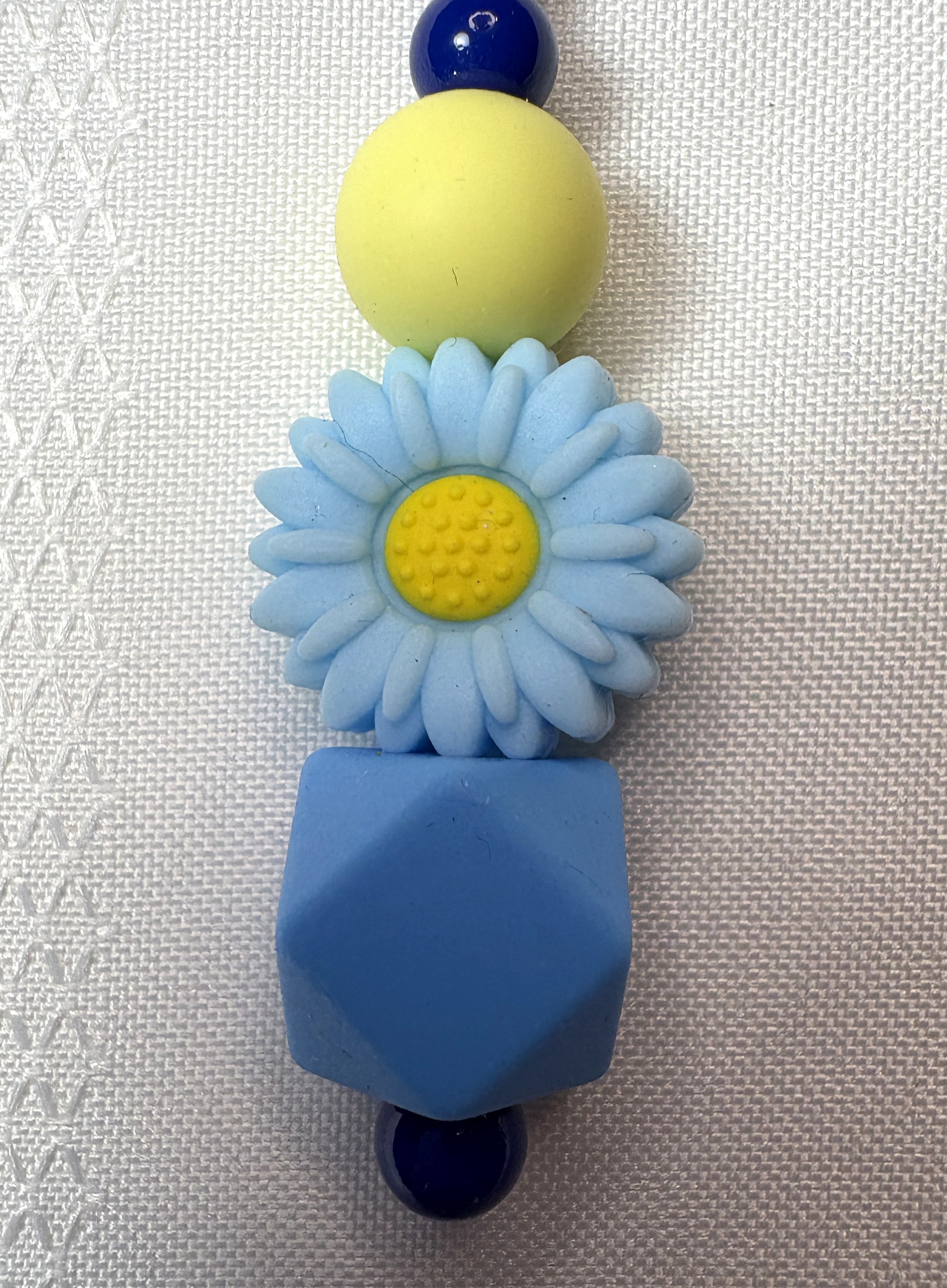 Beaded Silicone Backpack Purse Bag Keychain Charm featuring a vibrant blue daisy, complemented by blue octagon beads and cheerful yellow silicone bead! This charming accessory is perfect for adding a playful touch to your bags.