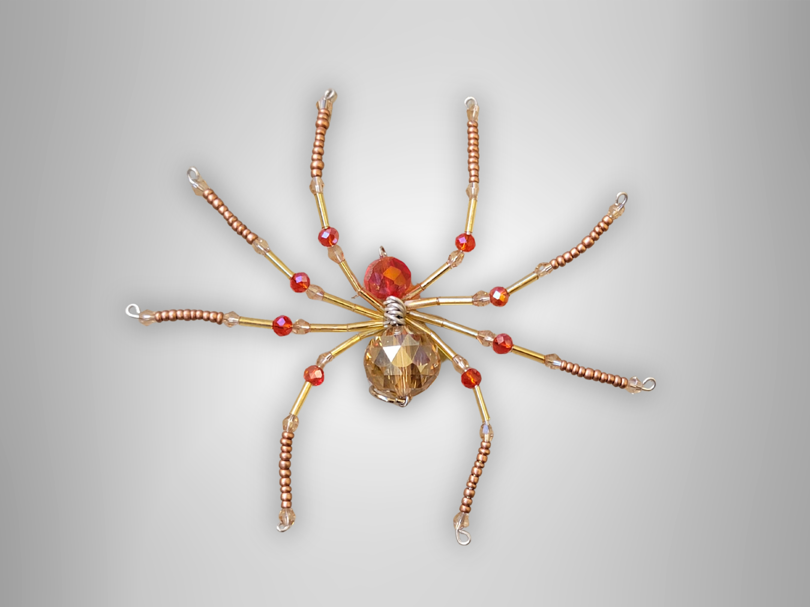Each beaded spider begins with choosing the perfect beads for the head and body. I measure and cut four wire pieces for the legs, then secure them to the main body wire (or eye pin) before deciding how to bead each leg as I go — that part is always a little creative adventure. A tiny bit of glue is added near the body to keep everything stable, and once the legs are shaped, I finish the piece with a jump ring so it’s ready to hang and enjoy.