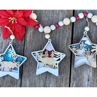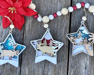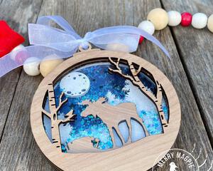 Experience the magic of a snowy night in the forest with this glitter filled layered snow globe ornament. Sealed with clear acrylic so the glitter "snow" flows around the scene as the ornament is moved and shaken. The stars cut in the back allows the lights from your Christmas tree shine through like a beautiful night in the wild.