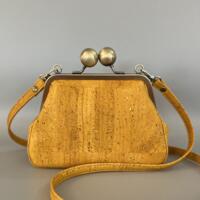 Beatrice proves you can make a big statement with a small bag. Made with beautifully unique cork leather, this bag exudes a vintage vibe that's perfect for any occasion. This adorable little bag features an oversized antique brushed bronze kisslock closure, topstitching details along the gusset, crossbody strap and multiple card slots for your ID, cards and cash. With no need for a wallet, there's more room for your essentials making this bag both functional and stylish. Best of all, each bag is individually crafted by hand in my home studio, ensuring that you'll be getting a truly one-of-a-kind piece made with the utmost care and attention to detail.