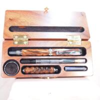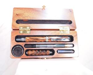 Beautiful Maple Burl Pen and Pencil Set. This set includes a roller ball style pen, and a mechanical pencil. The set is made from a figured maple burl wood. The complete set is in a handmade maple pen box. This is a one-of-a-kind set. The Pen and Pencil has a polished acrylic finish, and the pen box is finished with lacquer, and has flocking inside.