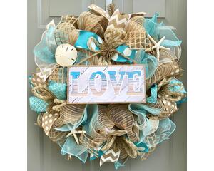 Beach Wreath, Burlap Deco Mesh Wreath with Seashells, Love Be...