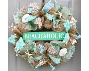 Beach Wreath, Beachaholic, Burlap Deco Mesh Wreath with Seash...