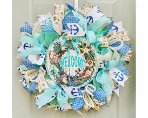 Welcome Beach Burlap Deco Mesh Wreath with Seashells and Star...
