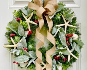 Nautical Christmas Evergreen Wreath with Starfish and Lambs E...