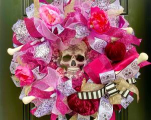 Skull Halloween Wreath for Front Door, Pink Floral Halloween ...