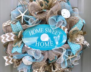 Home Sweet Home Beach Burlap Deco Mesh Wreath with Seashells,...