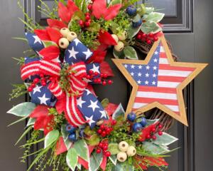 Flag Wreath, Patriotic Floral Grapevine Wreath, July 4th Wrea...
