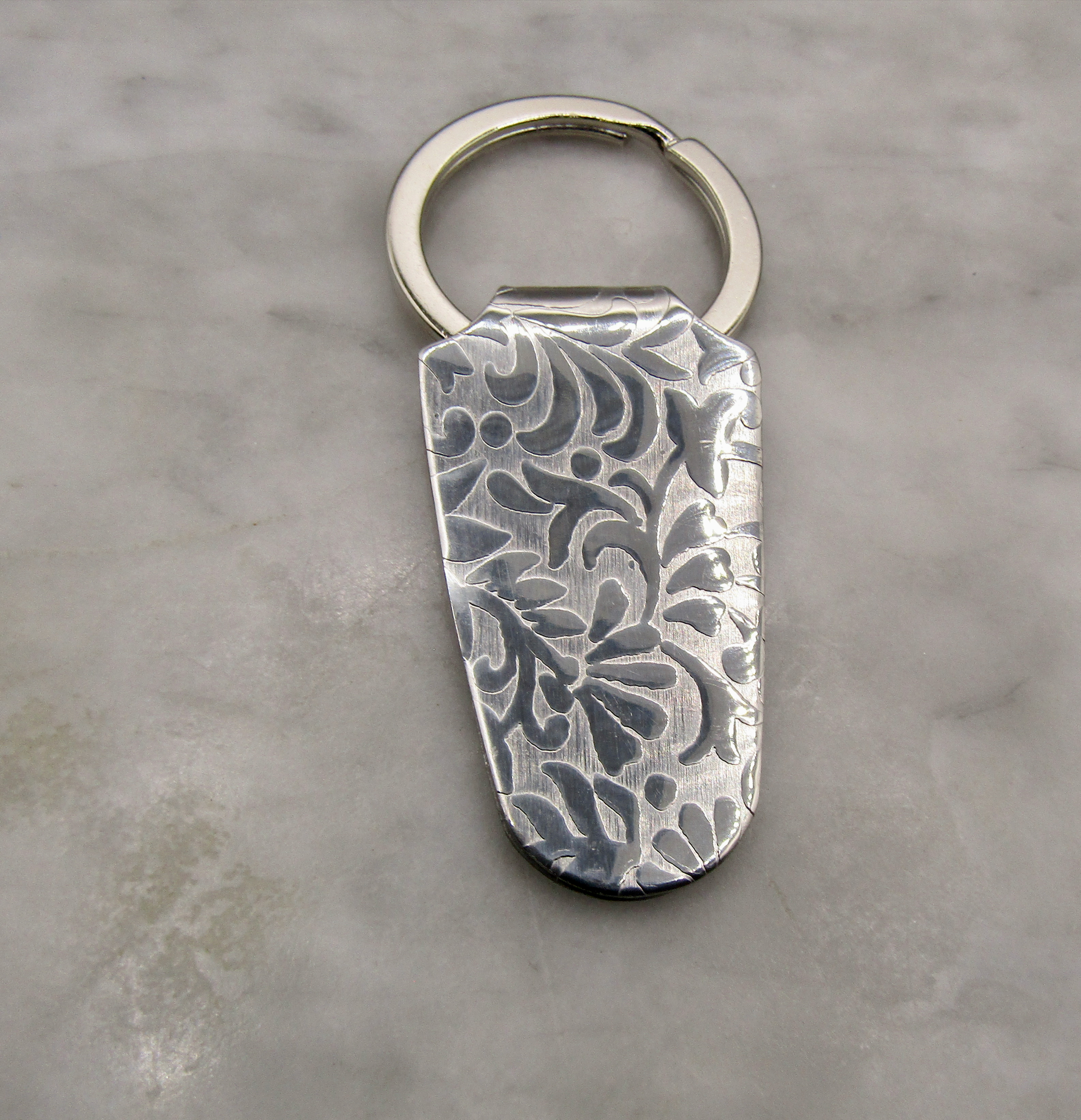 Beautifully textured lead-free, pewter keychain with a stainless steel ring. From top to bottom, the keychain is 3 1/4 inches long and 1 1/2 inches wide. It's a beautiful gift for birthdays, graduations, or anniversaries. The keychain will arrive gift-wrapped and ready to give. Pewter is very slow to tarnish and can be cleaned with the polishing cloth.