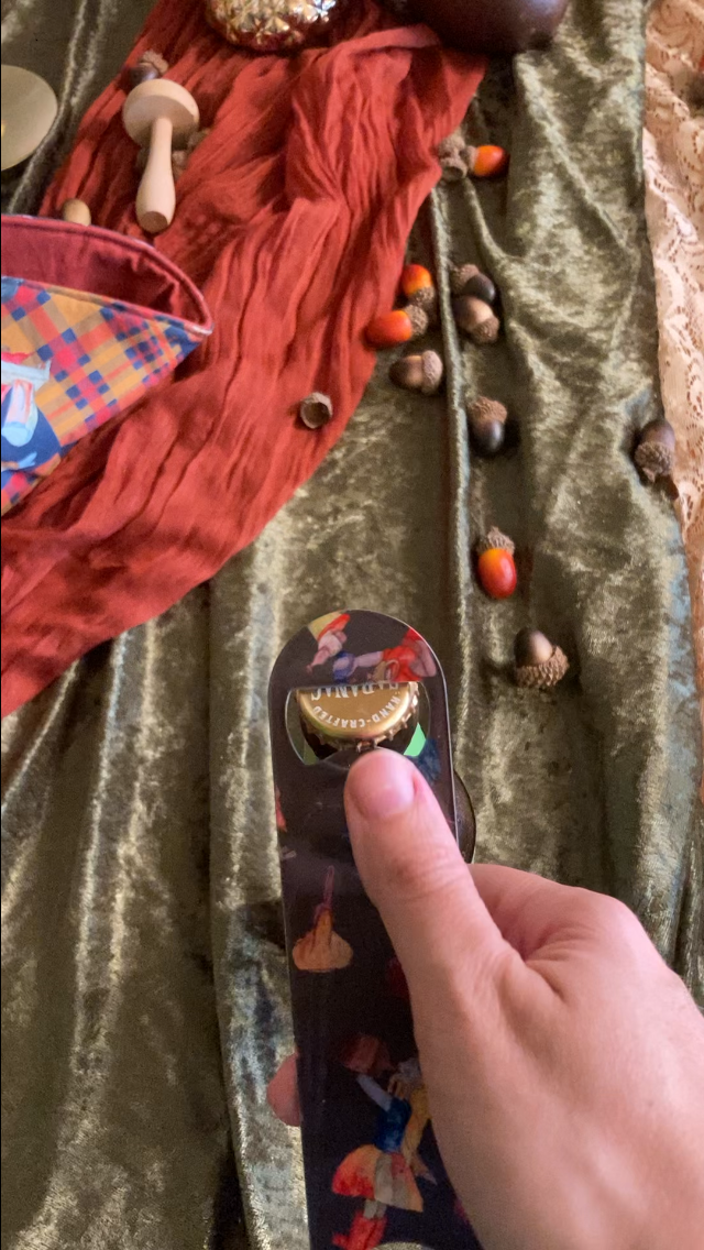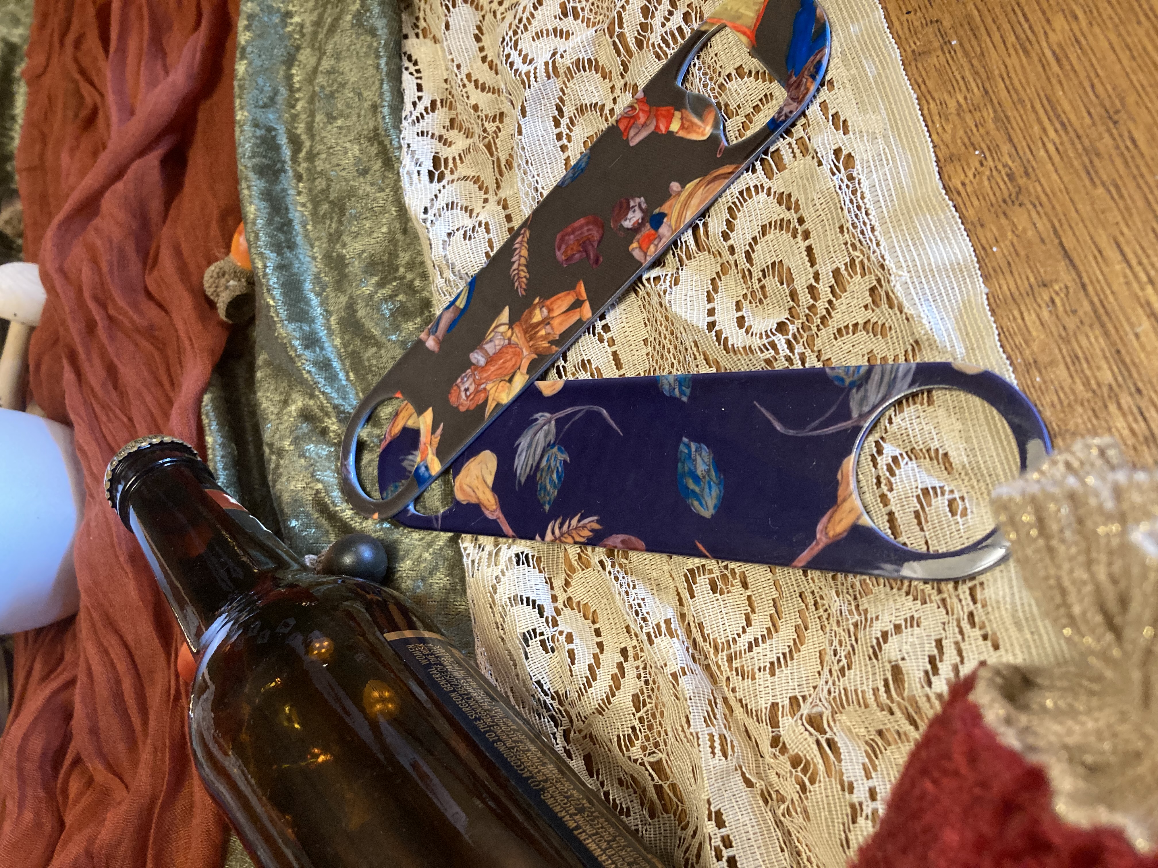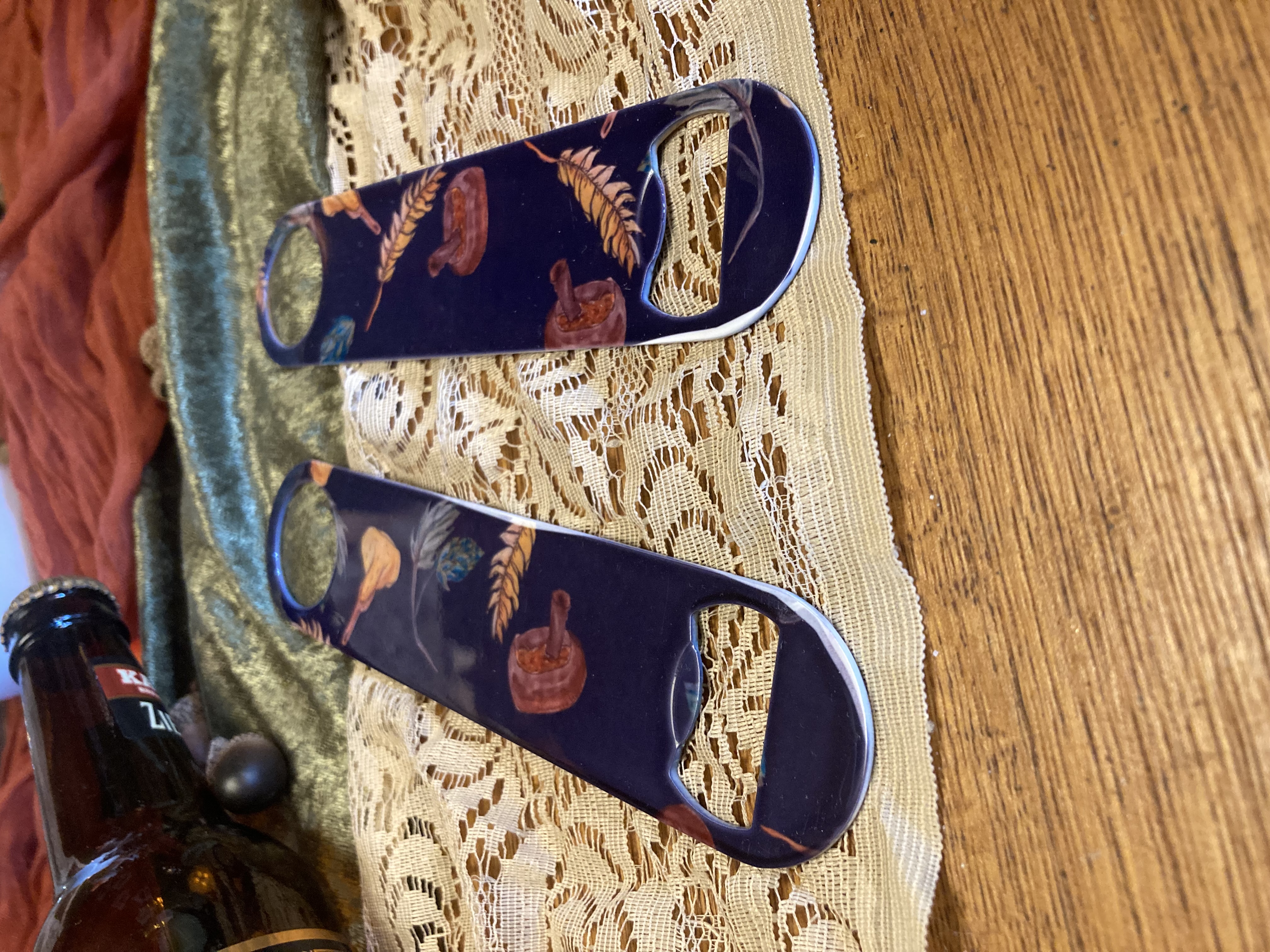 I draw and watercolor each element of the design, then digitize and arrange the images into a pattern. I then sublimate/heat press that image into the bottle opener for you.