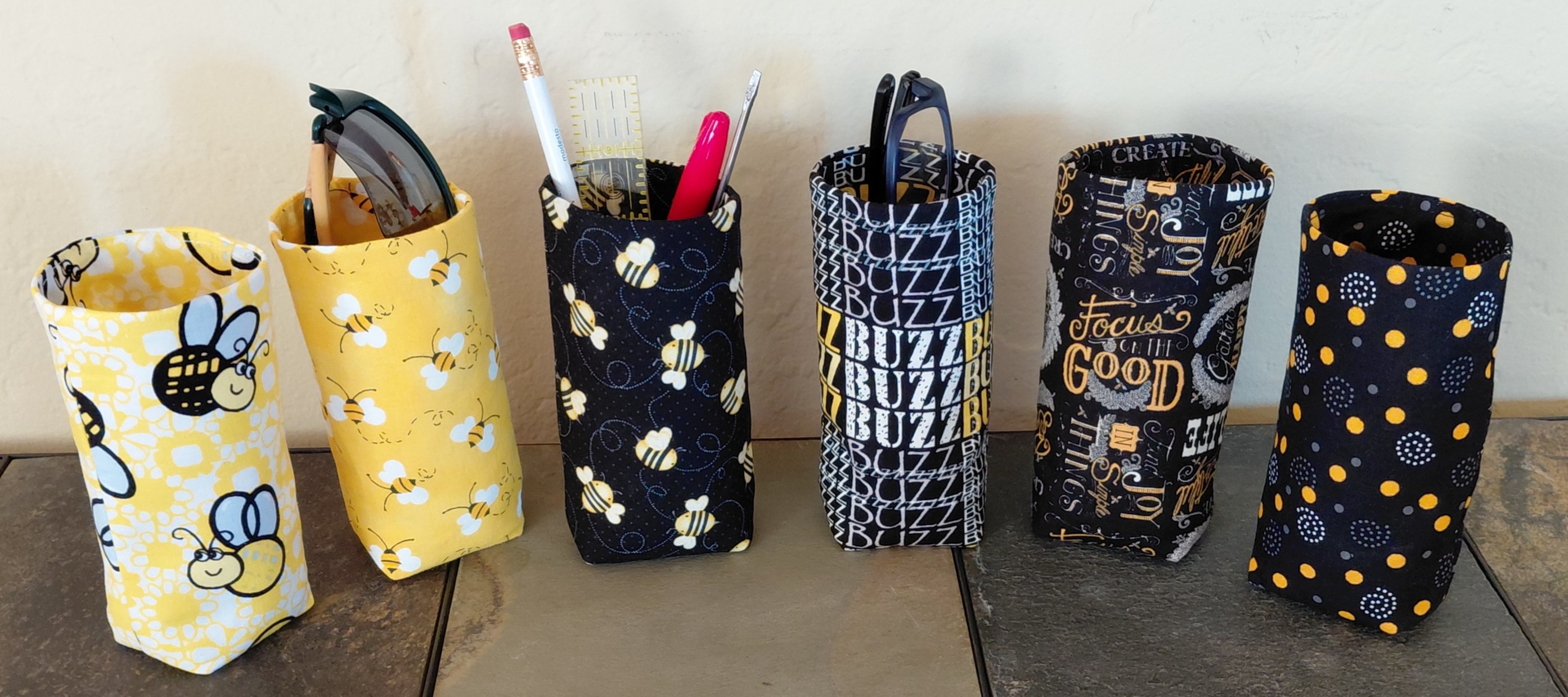 Keep your eyeglasses nearby and protected with an upright glasses pouch in a bees print or complementary black and yellow print. Simply slip your glasses in and out! The compact design takes up little space, and the weighted bottom keeps it upright. Reduce clutter on your end table, desk, workbench, counter, nightstand, etc. Use in the office, kitchen, craft room, living room, bedroom, patio, car, RV, at home or at work!