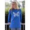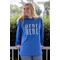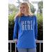 This is a high quality 300 PPI mockup image on a Bella+Canvas 3512 Unisex Hooded Long Sleeve Tee in Heather True Royal color. This is a digital photograph of the actual product, *NOT* AI generated. The model is wearing a size LARGE for a more oversized fit.