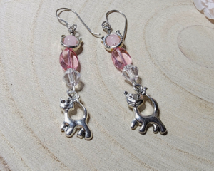 Handmade Cat Earrings with Pink Beads and Silver Kitty Charms...