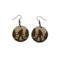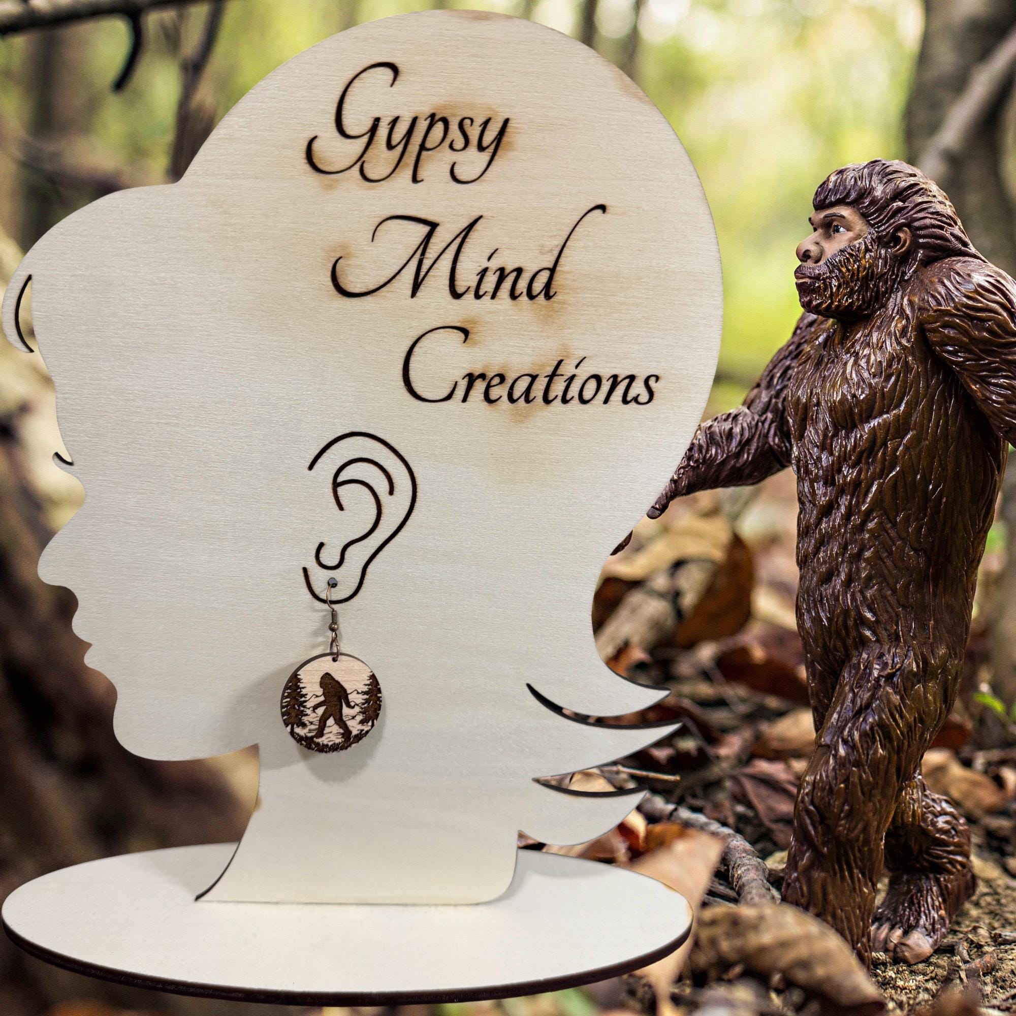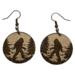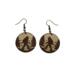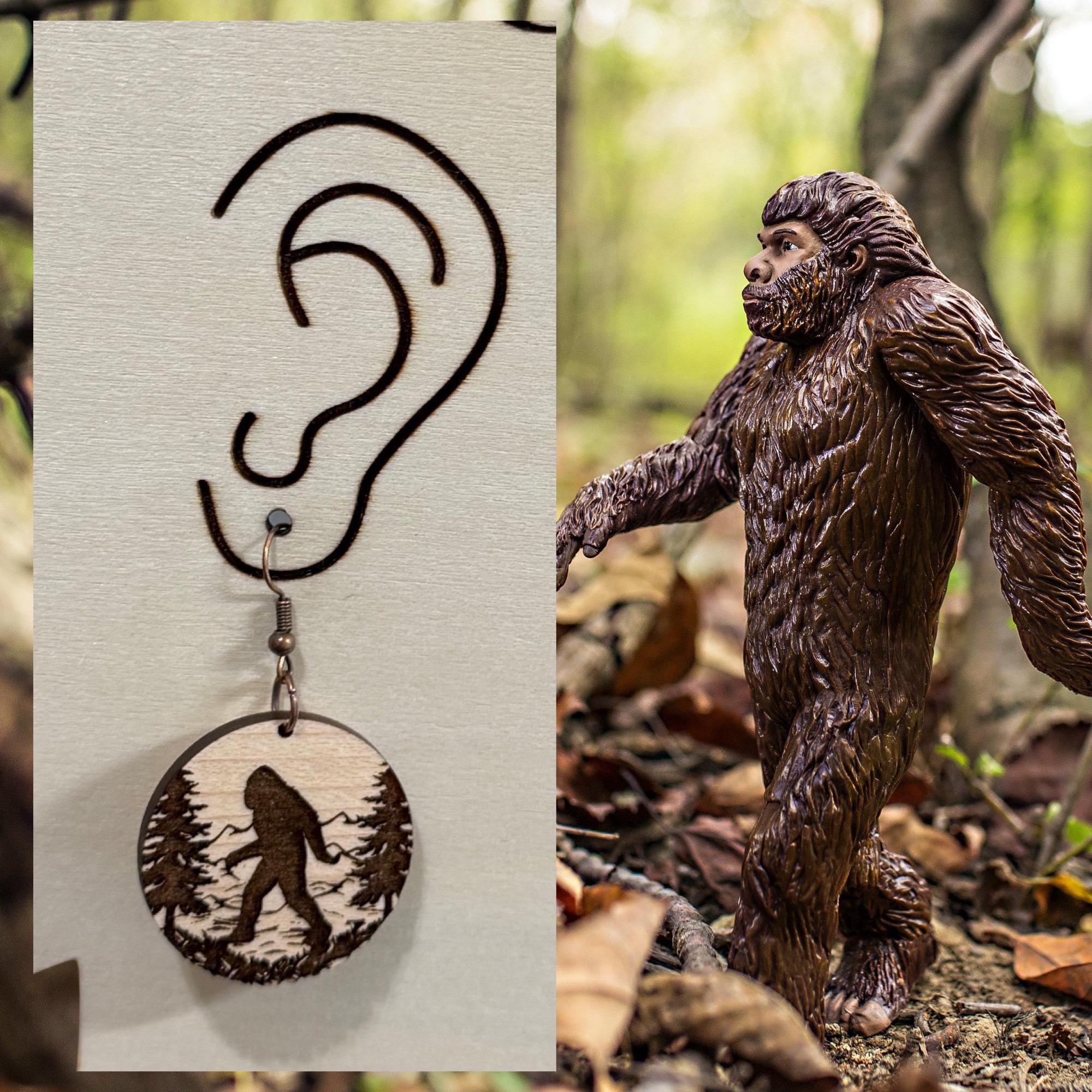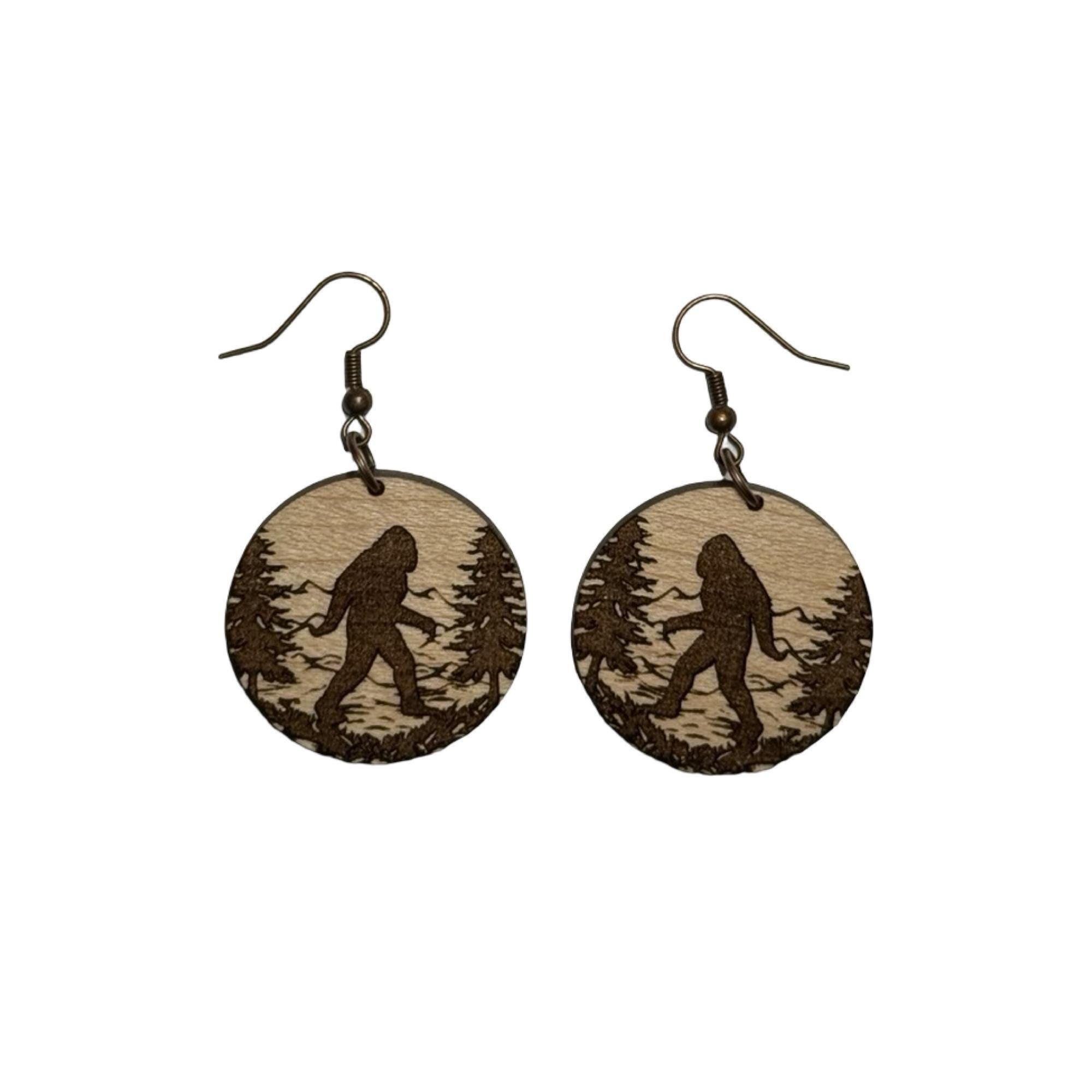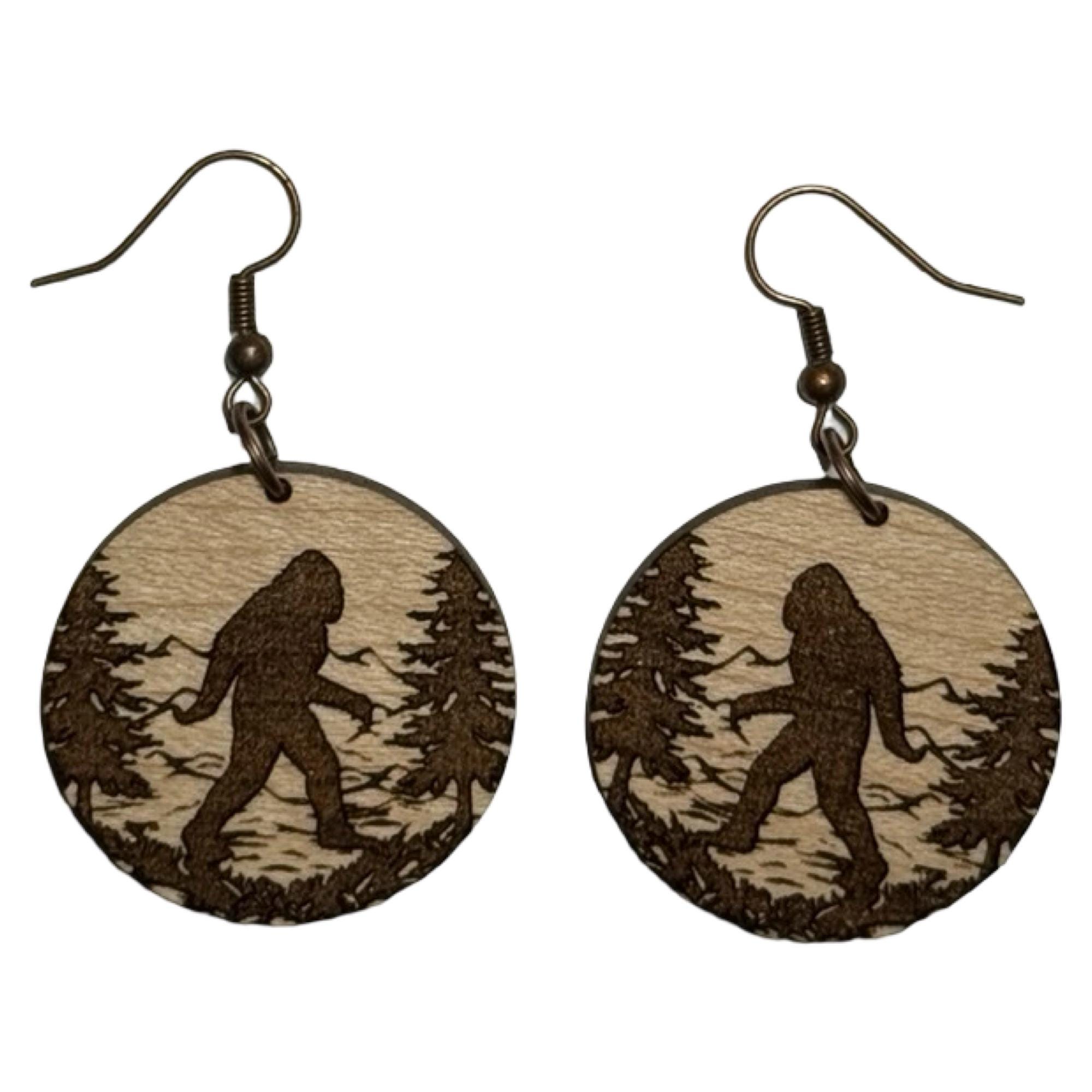 These are a pair of laser cut lightweight Bigfoot walking wood dangle earrings. There is no design on the back. They are made from 1/8 in thick medium maple hardwood. They are on ear wires. All metal components are silver, gold, or brass plated, or black alloy, nickel & lead free, and hypoallergenic. They are approx. 1” in long. Backs not included but available upon request.