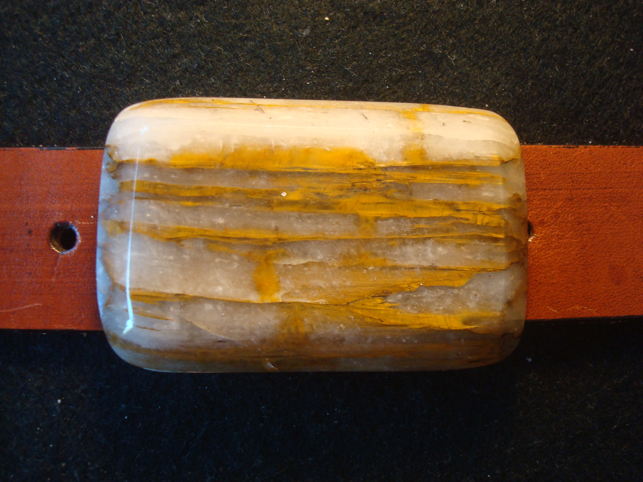 This mineral is found in Crow Wing County, Minnesota and is known by the names Binghamite,Silkstone and Cuyunite. This buckle is formed in the bevel edge design and the stone is supported with my handmade German Silver backing . The backing is signed and dated along with the stones name. This buckle will accept a belt up to 1 1/4" in width and it measures 2" 3/4" by 1 3/4" and is approx. 1/4'" in thickness. Note that German Silver is not silver but an alloy comprised of nickle ,brass and zinc.The reasons that I choose to use it is because it's stronger, less expensive and it doesn't tarnish as does silver.