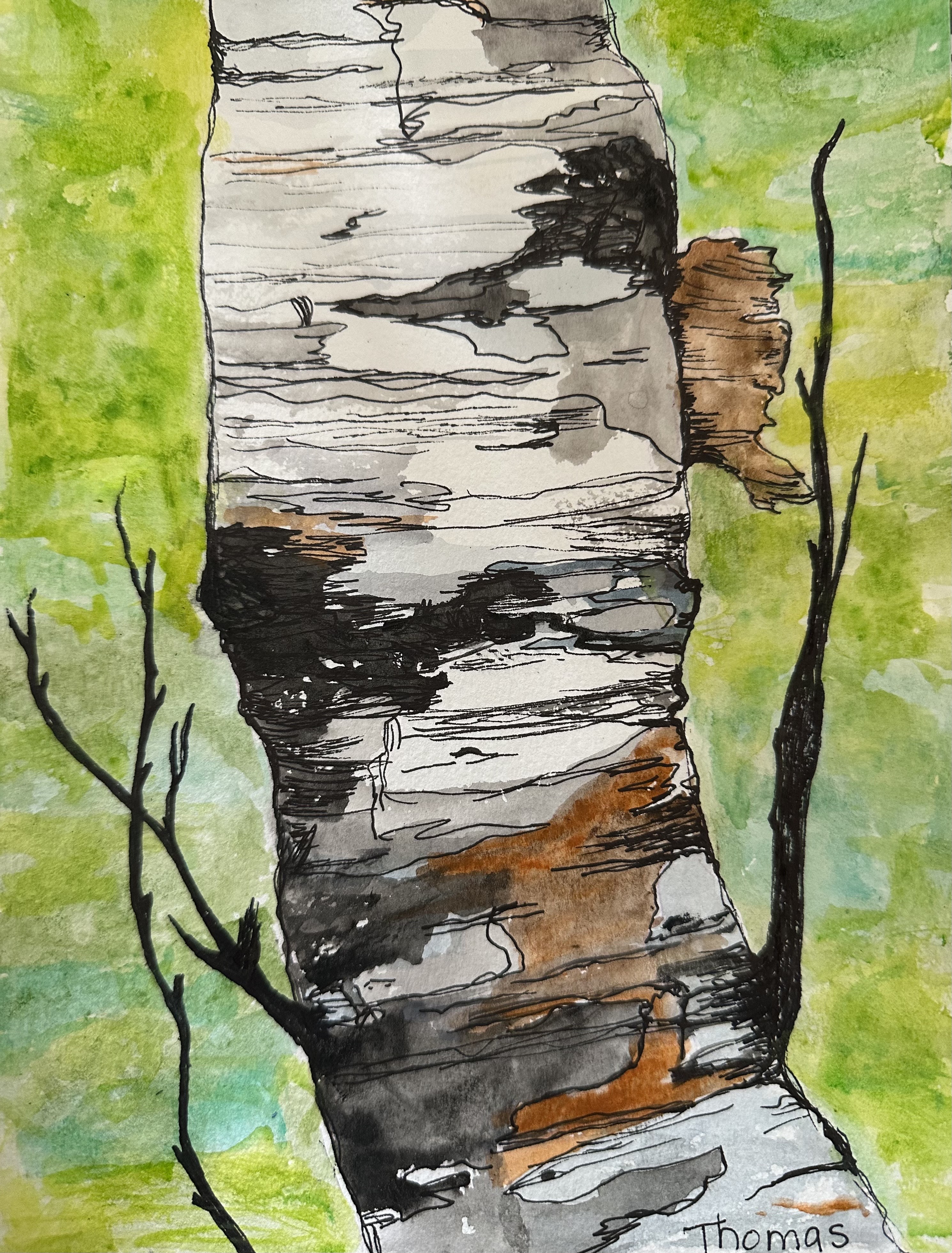 Bright green background showcases this beautiful birch tree. Watercolor paint and ink on a 140 lb white paper size 7x10 inches.