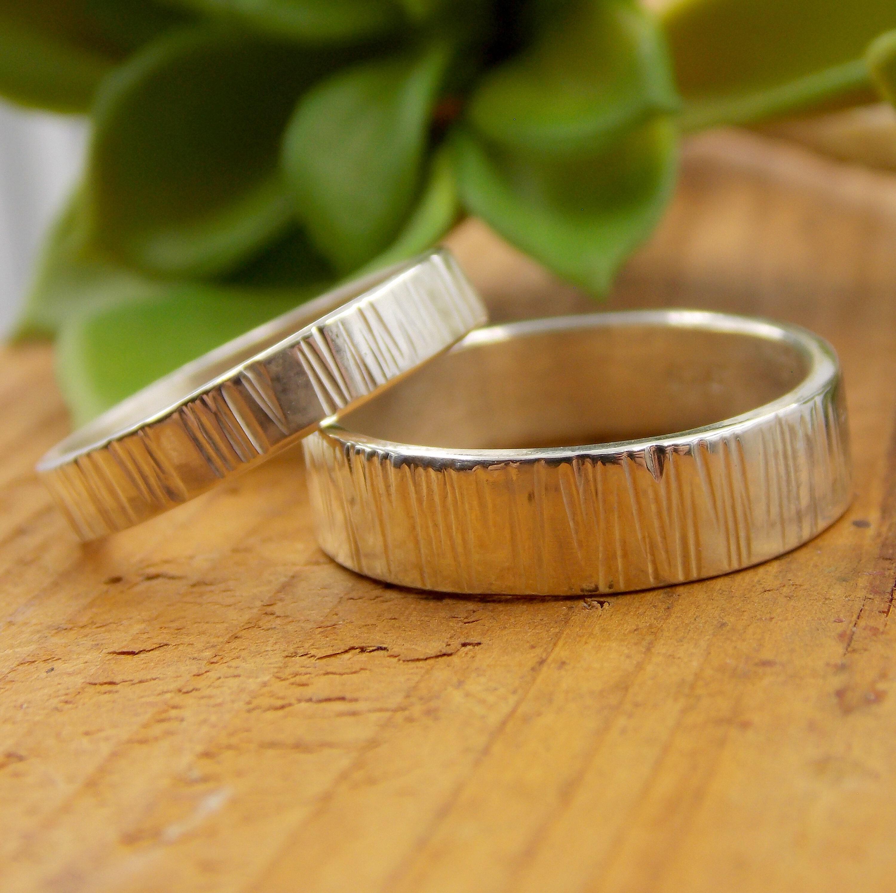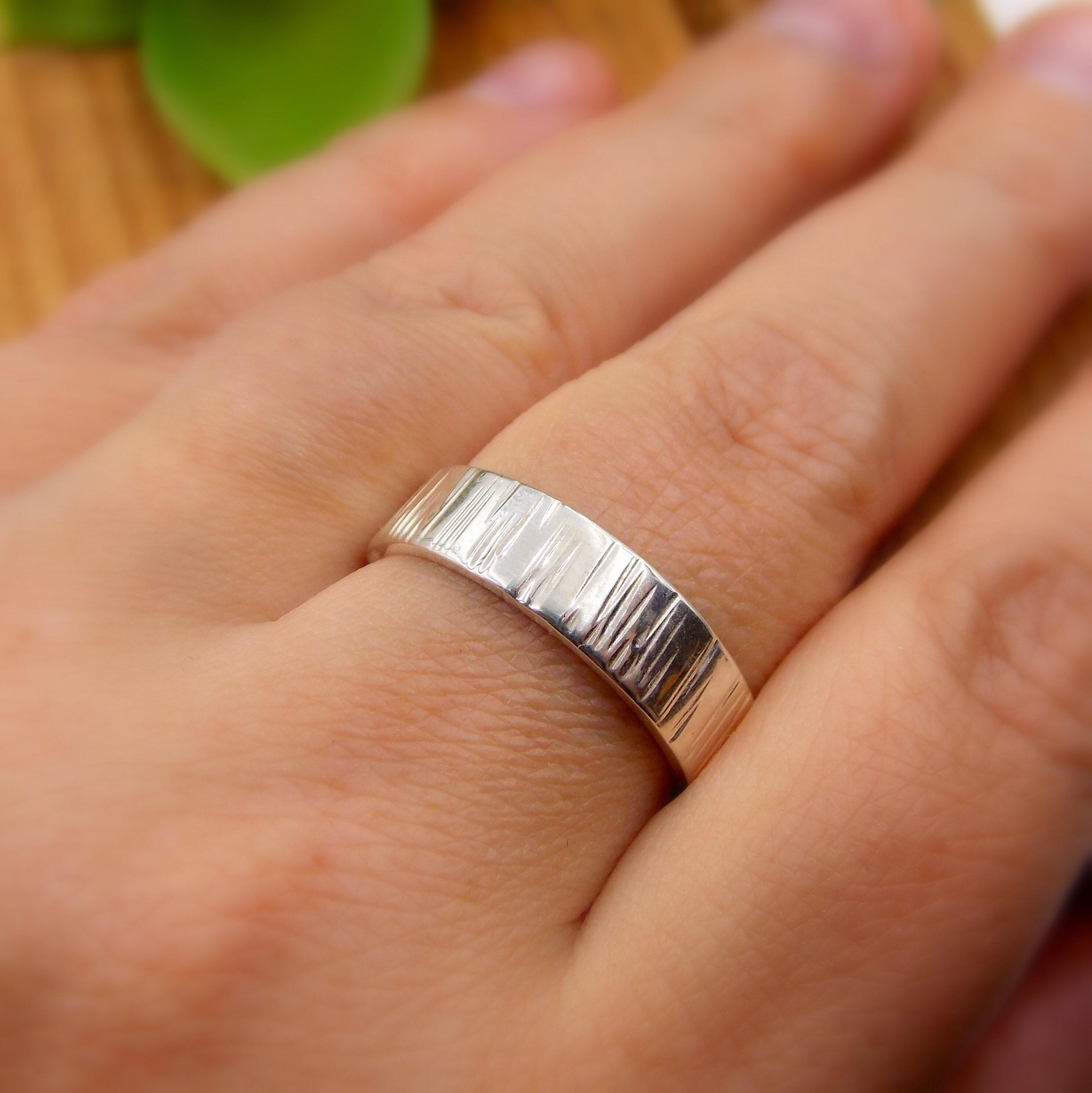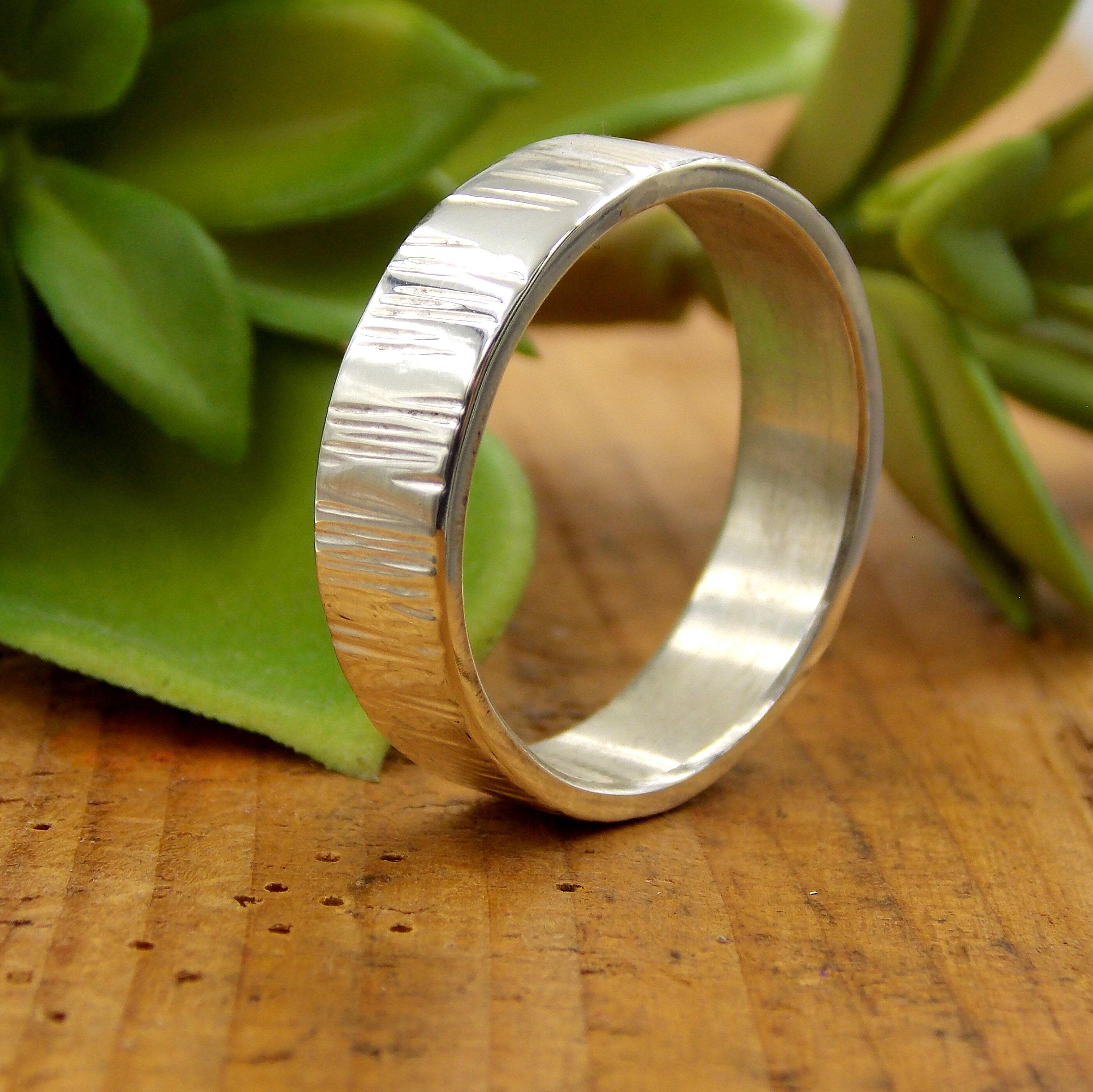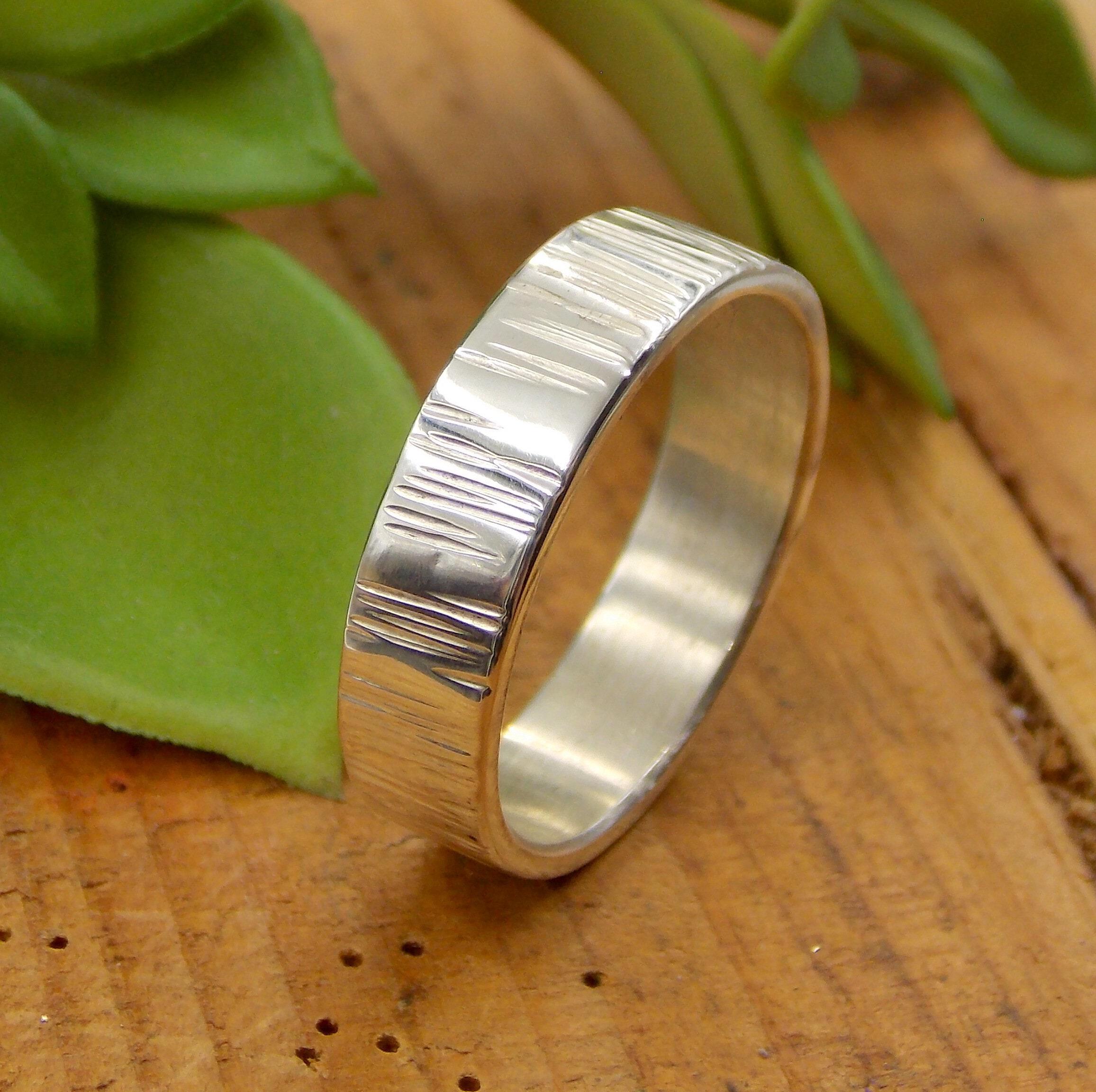 --As featured on Wedding Chicks-- This Birch Tree Bark Wedding Band is made from 6mm wide sterling silver. The ring is given a rustic tree bark texture by hand before polished to a shine or given a black patina finish. The hatched pattern is modern and creates a minimalist alternative ring that is great for everyday wear. -