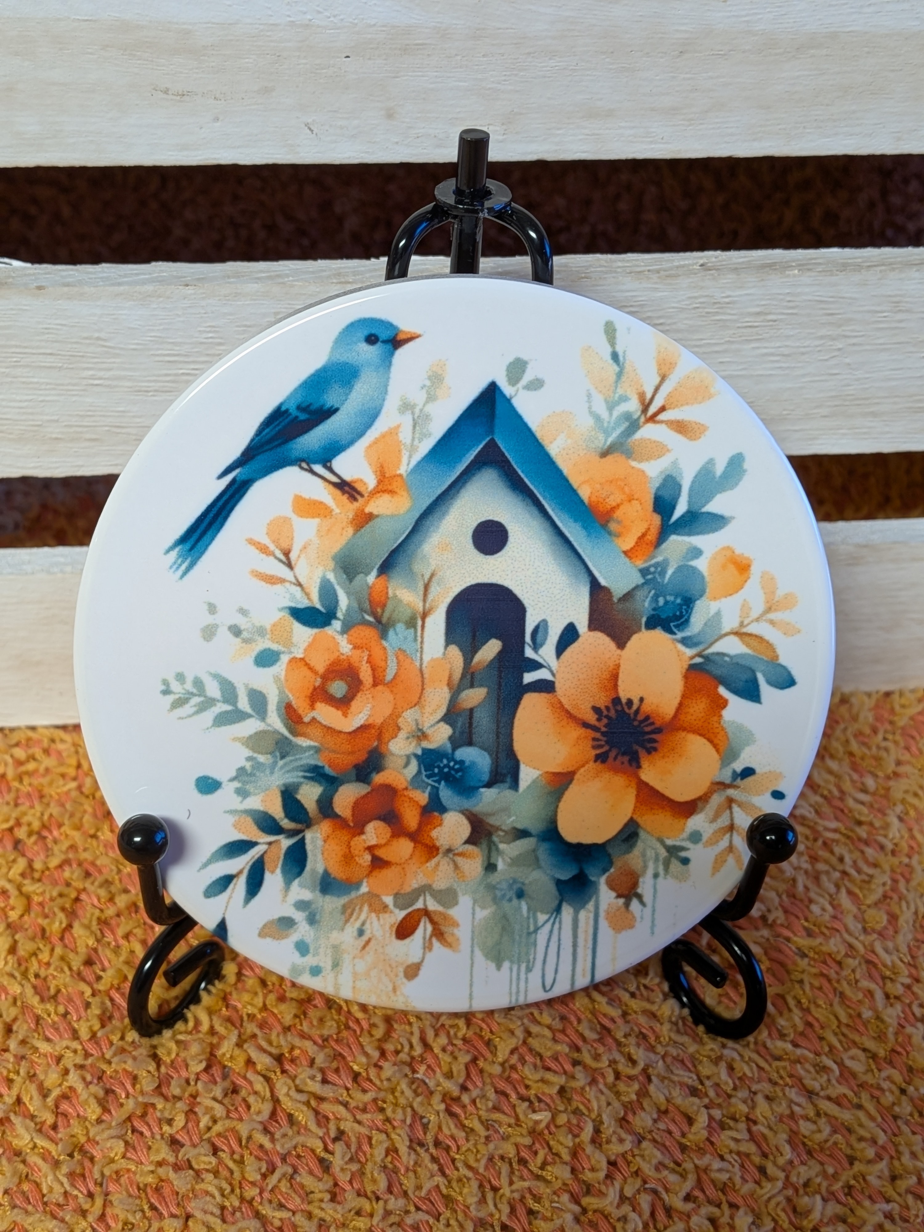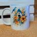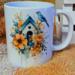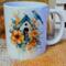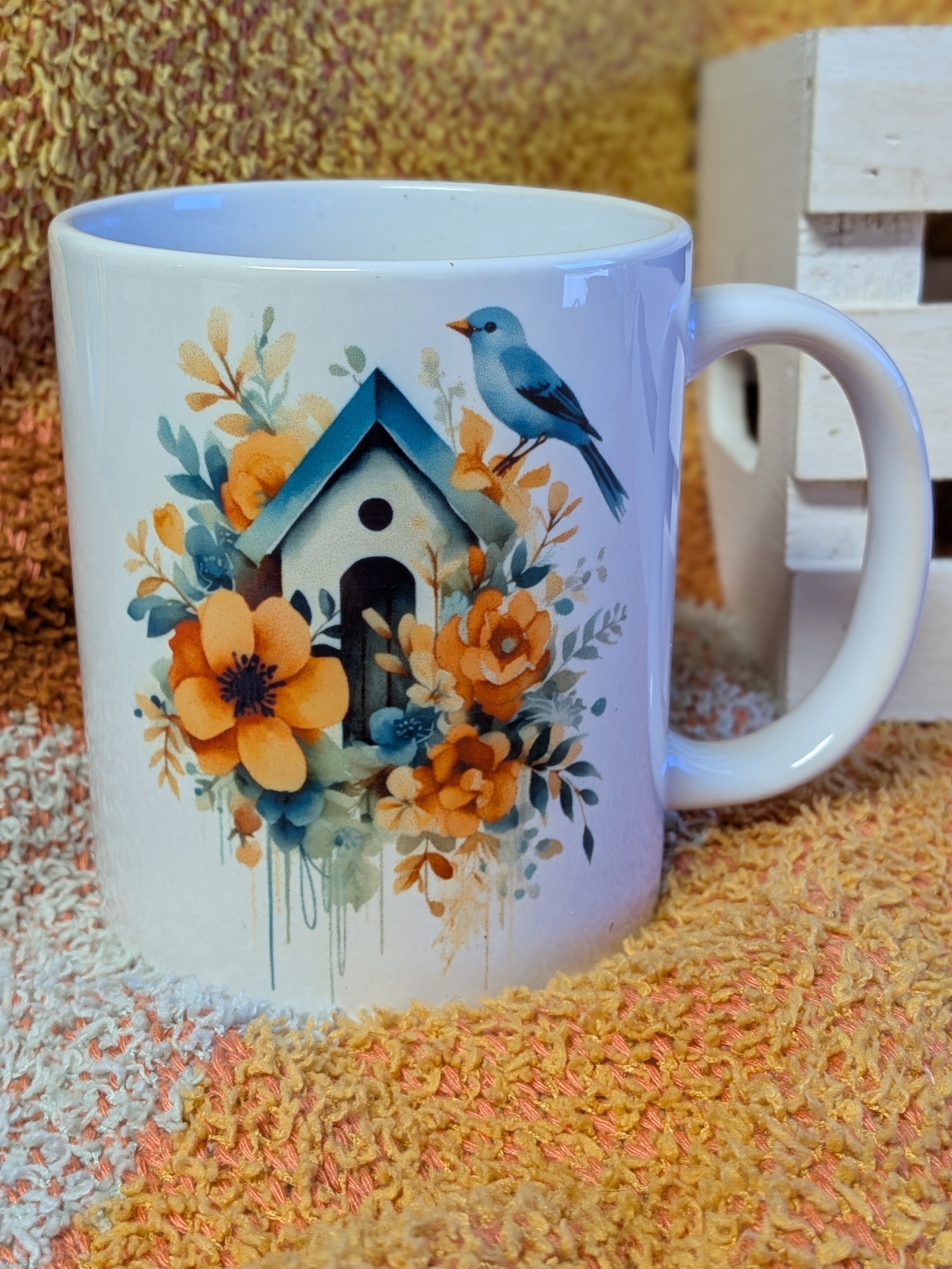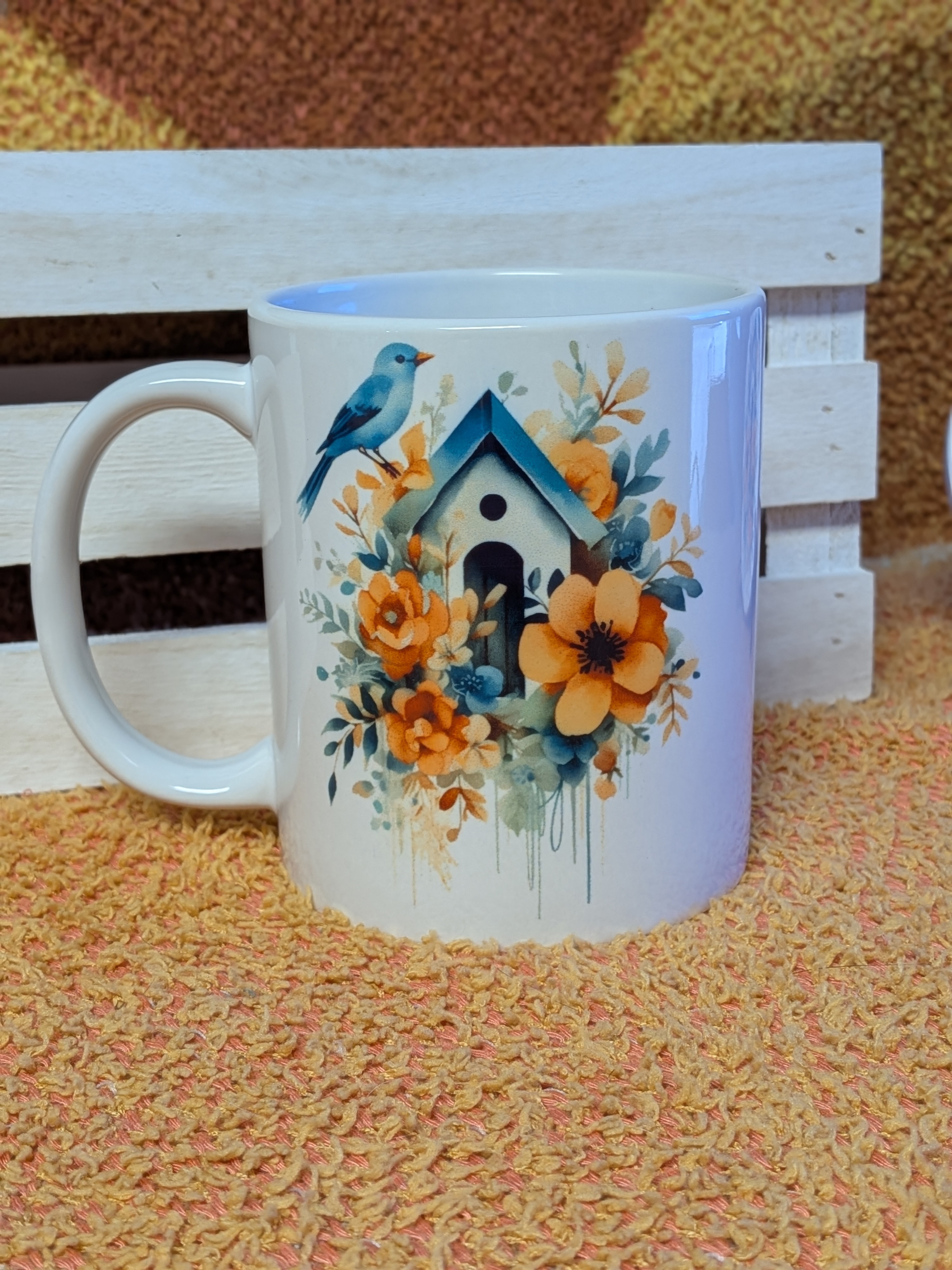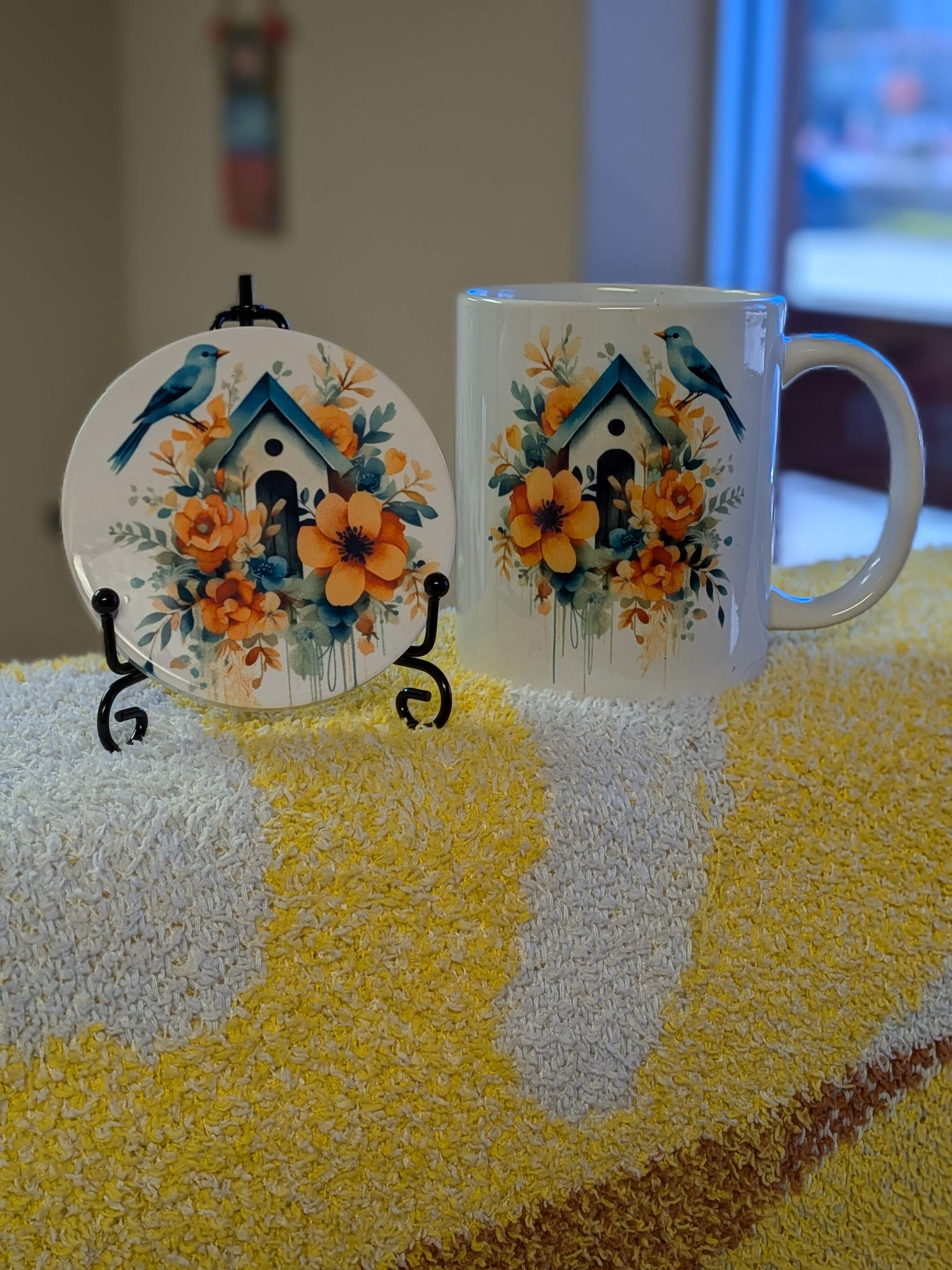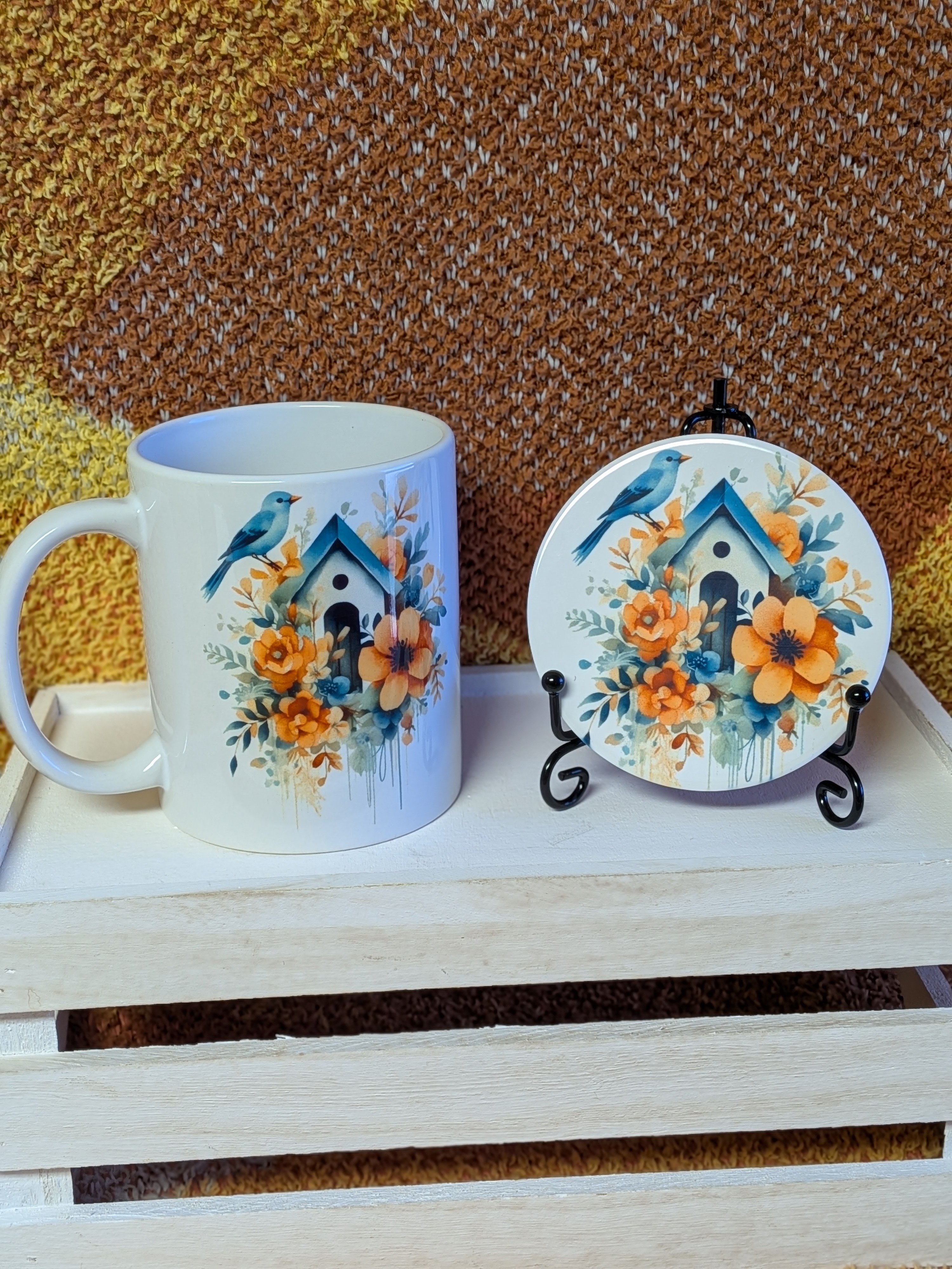 Beautiful watercolor floral Birdhouse mug and you also have the option to add a round square or round ceramic coaster.