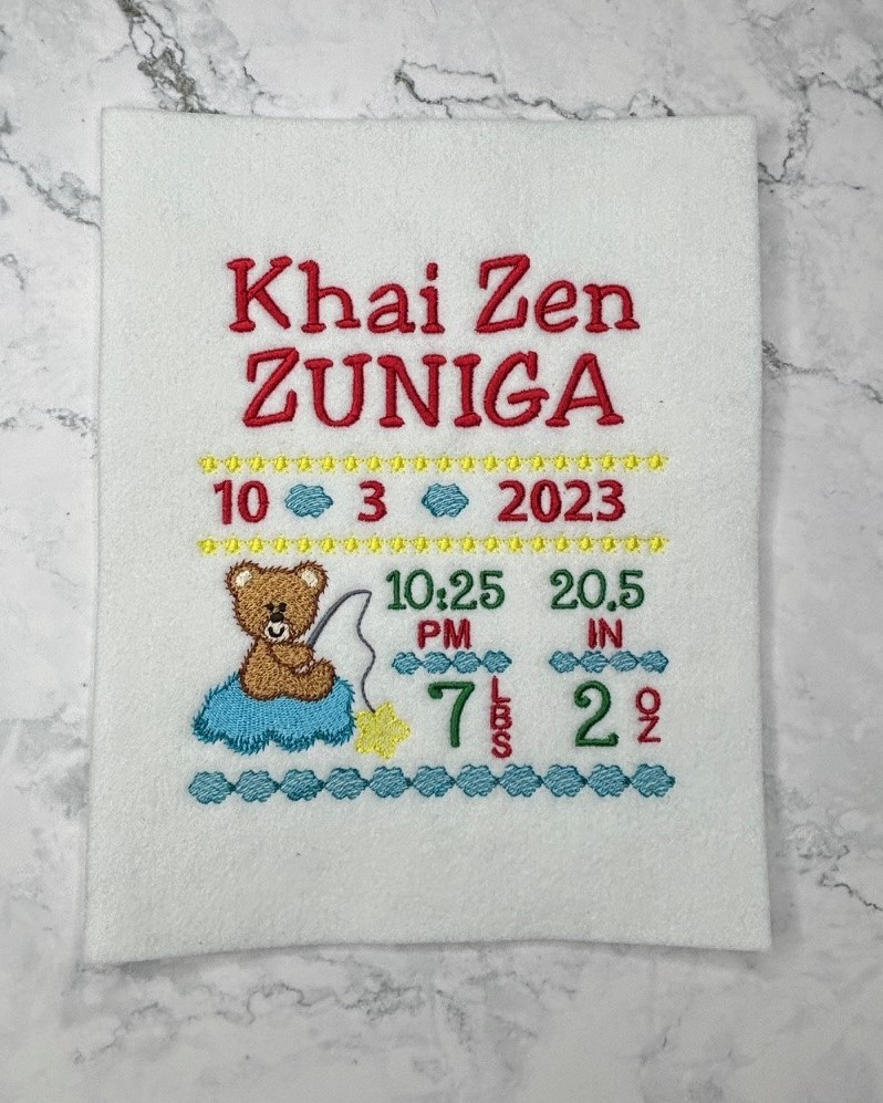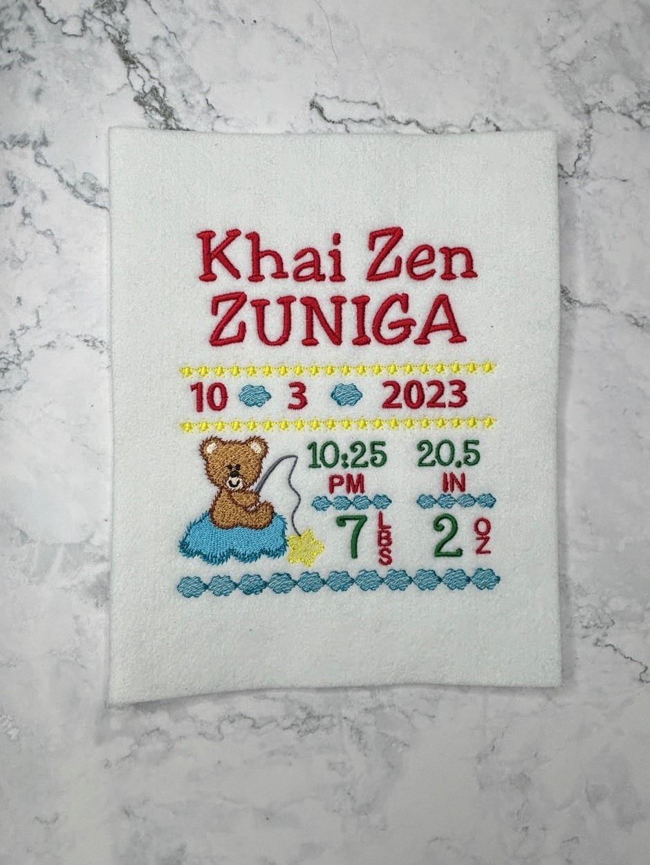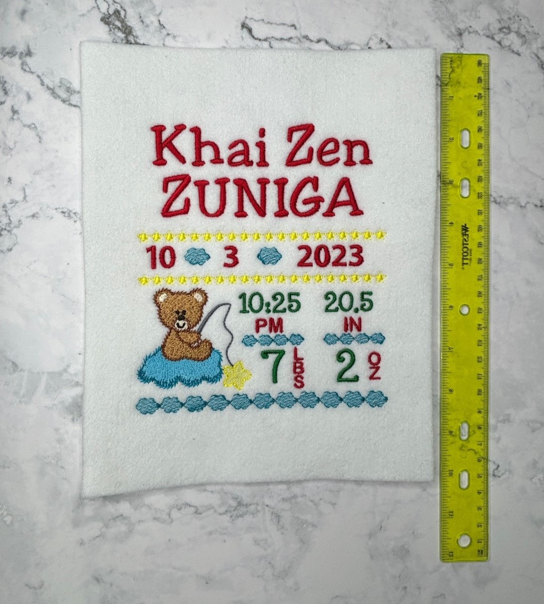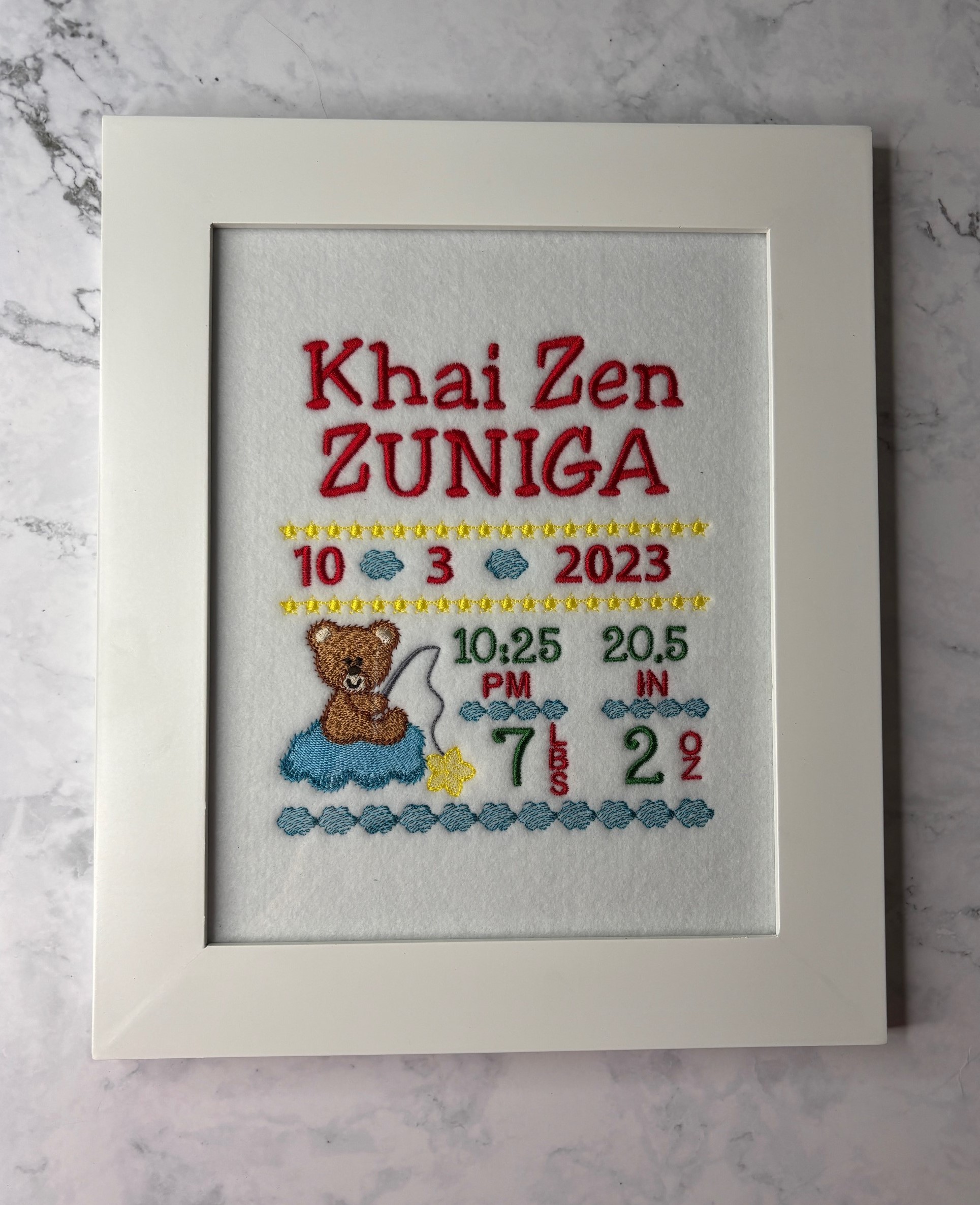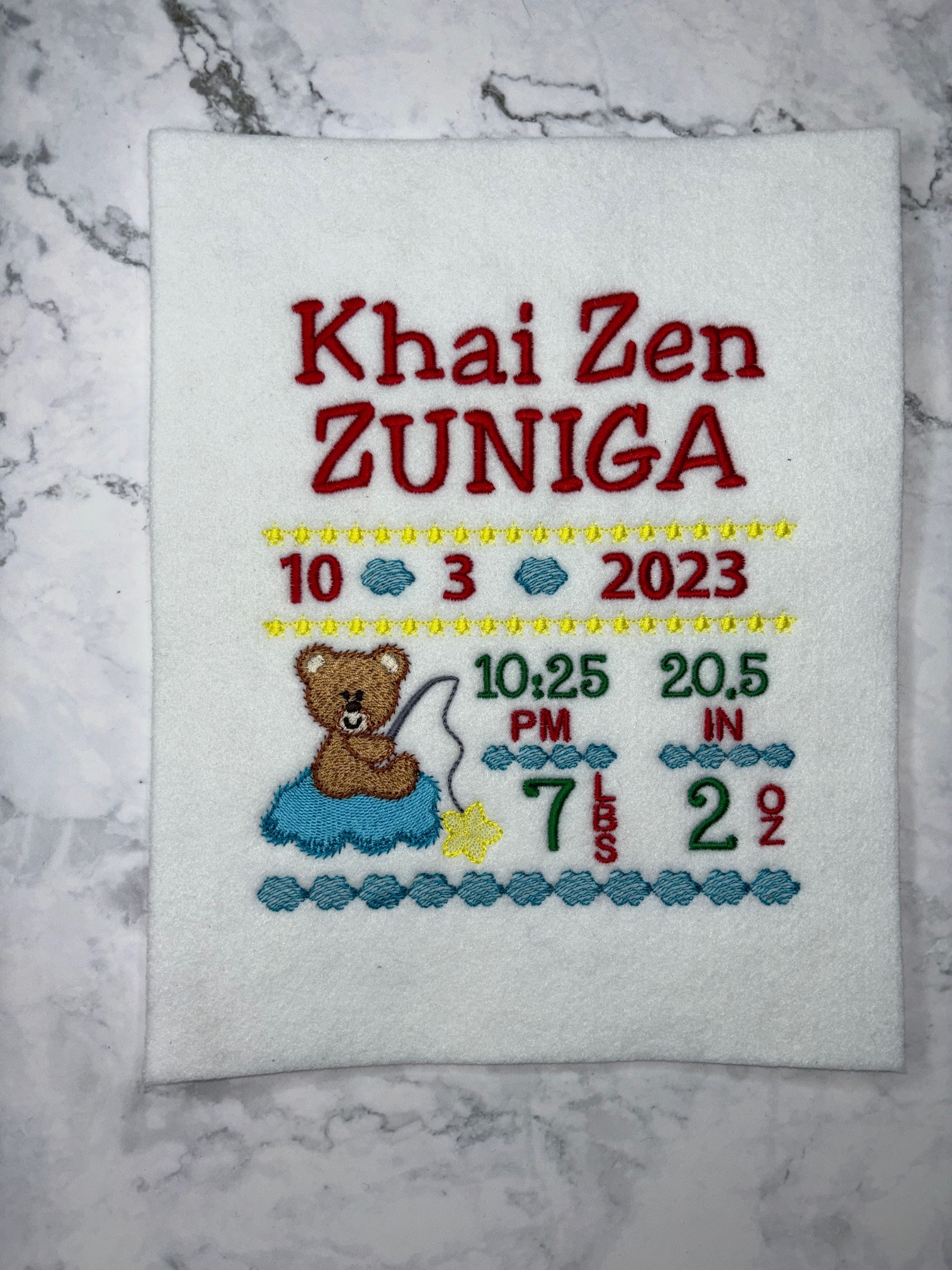 Custom Embroidered Birth Announcement – Perfect addition to any nursery. Embroidered Bear on a Cloud Birth Announcement, Birth Statistics