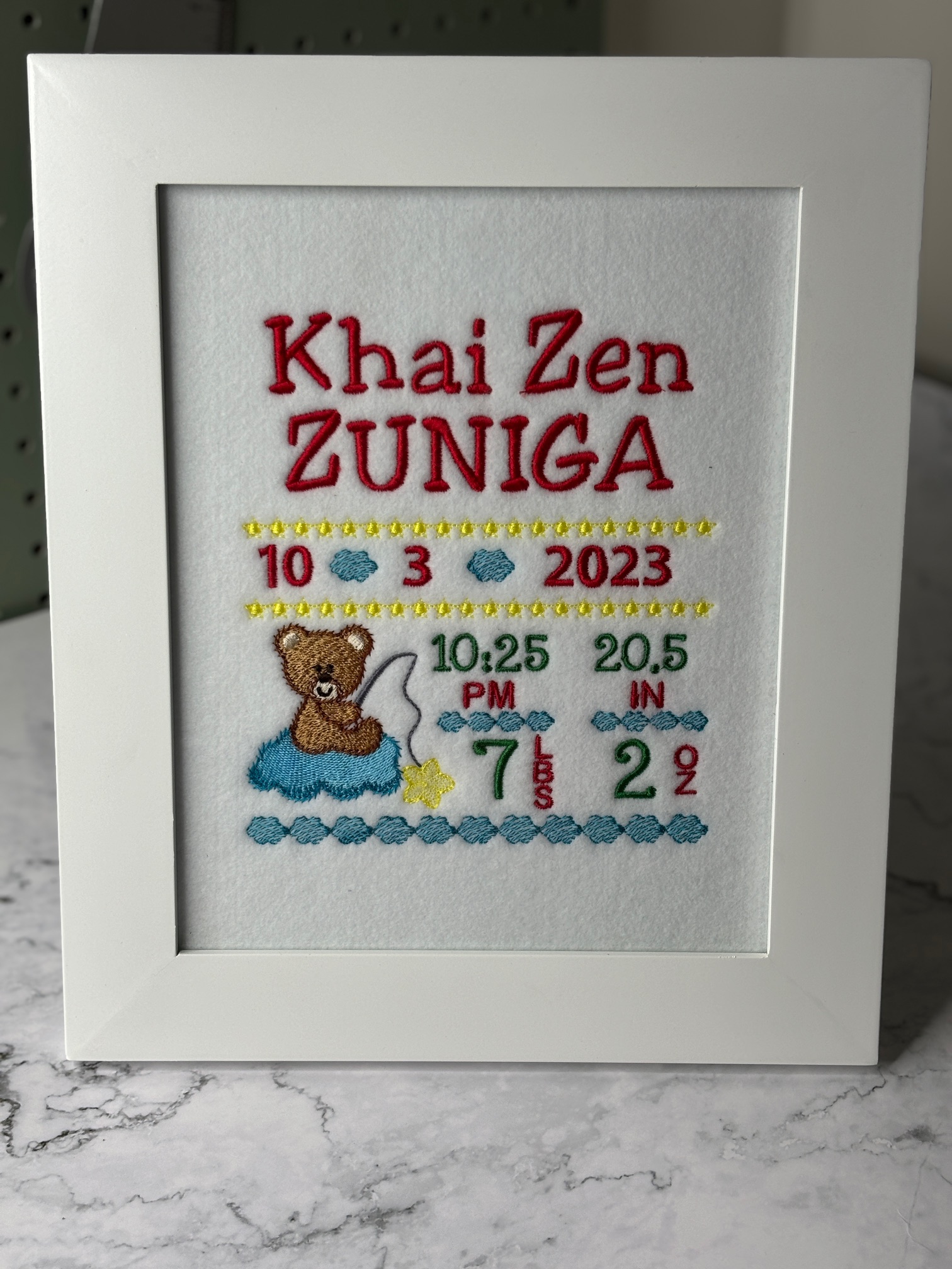 You will receive one 8"x 10" machine embroidered birth announcement ready to frame. Item does not include frame or any other props in photos.