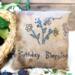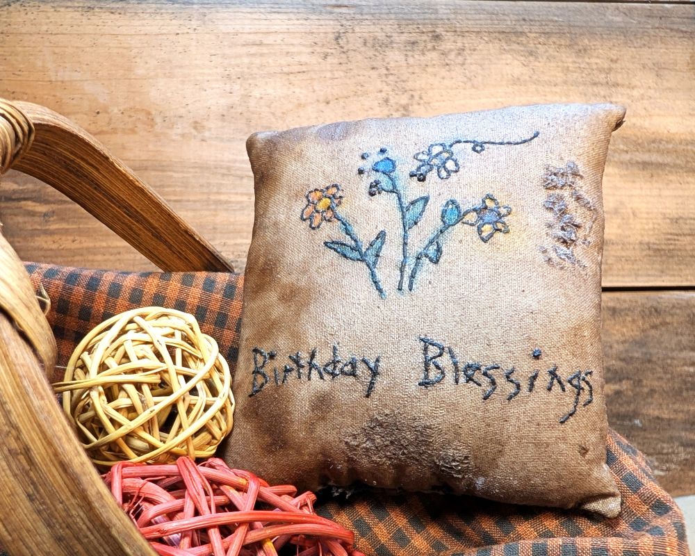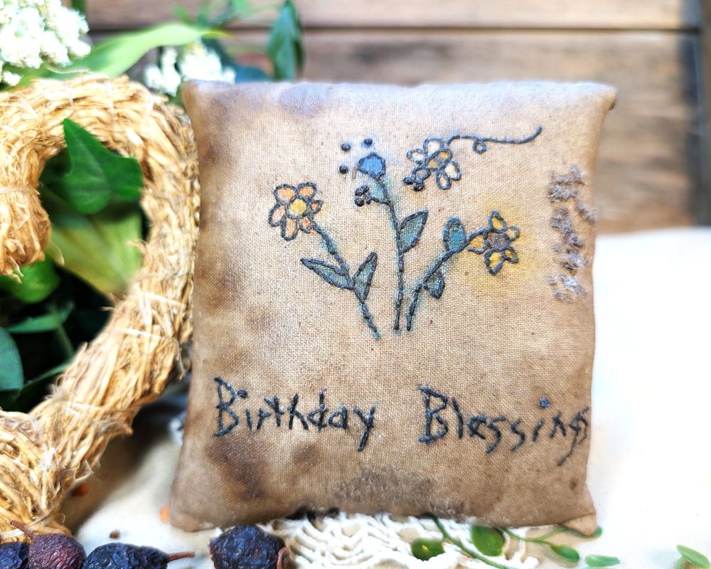 A primitive handmade floral Birthday Blessings 4-inch square pillow. It has been embroidered, painted, stained and tattered to look vintage and used. It can be fa gift for you or for someone else having a birthday, and it is something that can be displayed every year as a reminder that this is a special day.