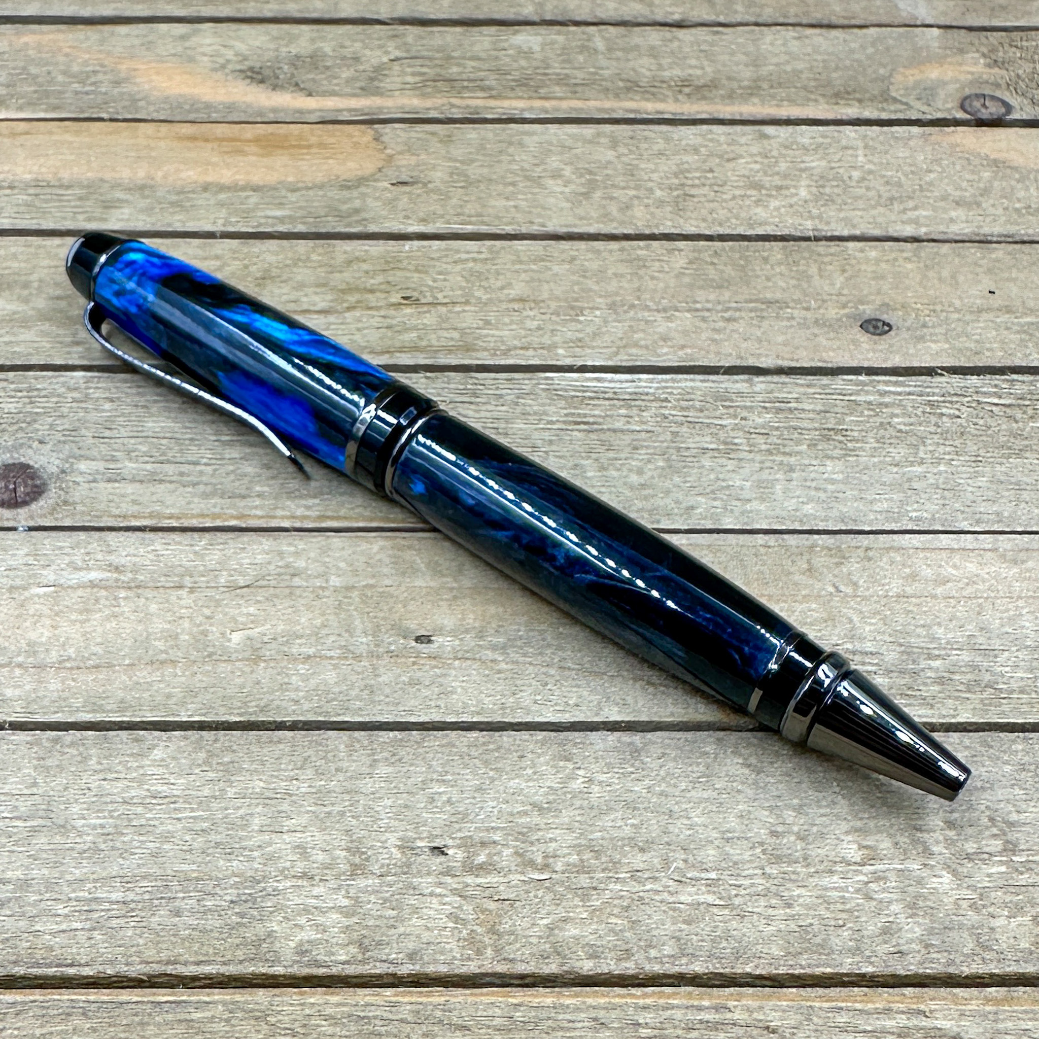This custom handmade pen, like all my other pens, was personally handcrafted by me in my woodshop. These are not mass produced pens and each one is handcrafted by myself so you are getting a craftsman's touch and love of their craft with each pen. Each pen I craft has subtle differences making it a truly one of a kind pen. First, I take a custom blank I made, in this case a black and blue blank, and prep it for pen making by drilling and gluing in the inner tube hardware. Second, it is meticulously turned down with my lathe to fit the gunmetal cigar pen components taking proper care that it transitions to the pen hardware perfectly. Finally, the pen is wet polished to a very high gloss which gives the pen a lot of depth and really brings out the color. All of my pens have already been produced by me so you know you will be getting the pen pictured in the listing. This eliminates the guess work on how it will look like once made and my pens are ready to ship without long waiting times.