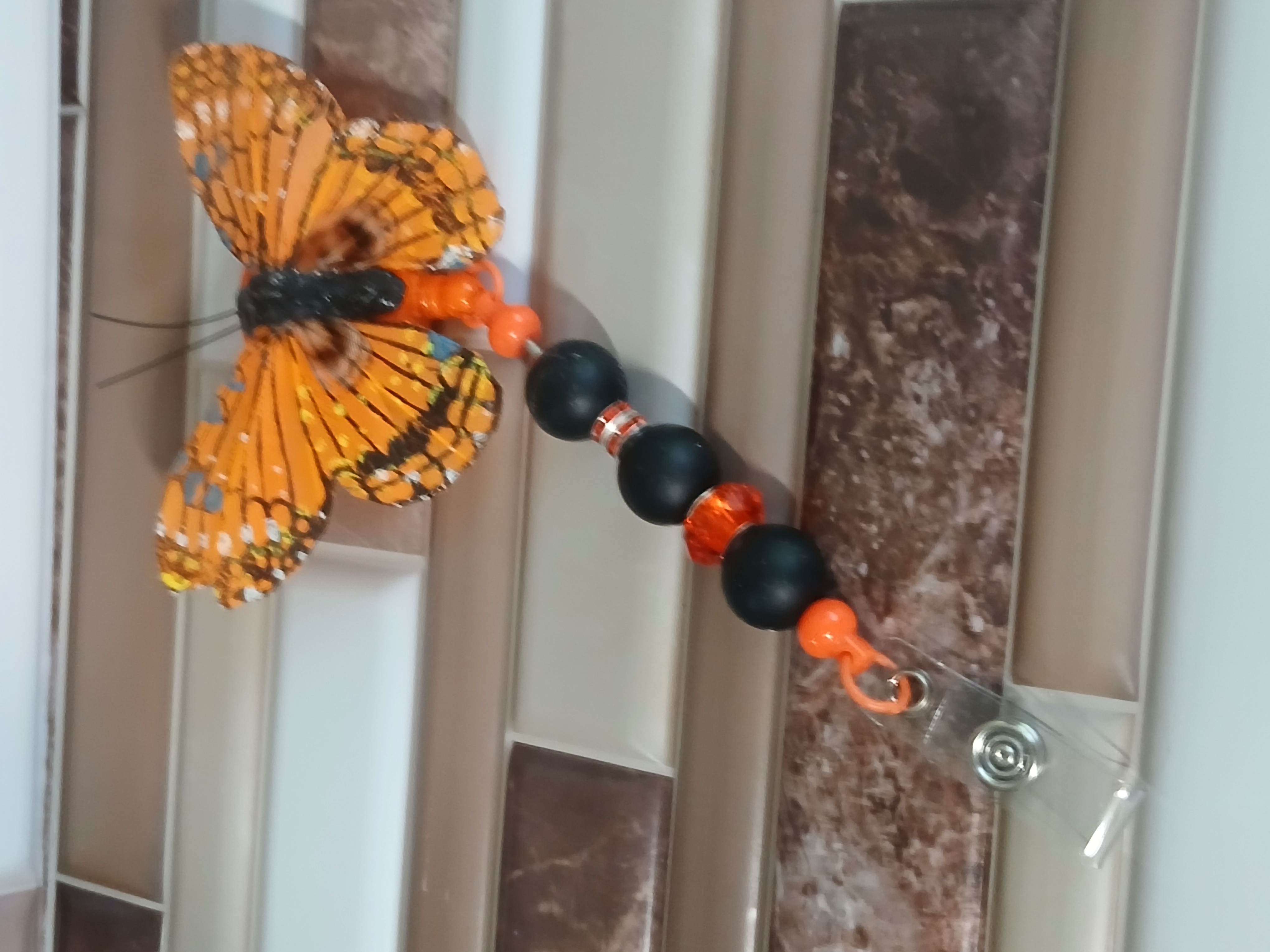 There is a large black and orange butterfly on the top of a black and orange beaded badge holder. If you love butterflies and have to have a badge or card key this is for you
