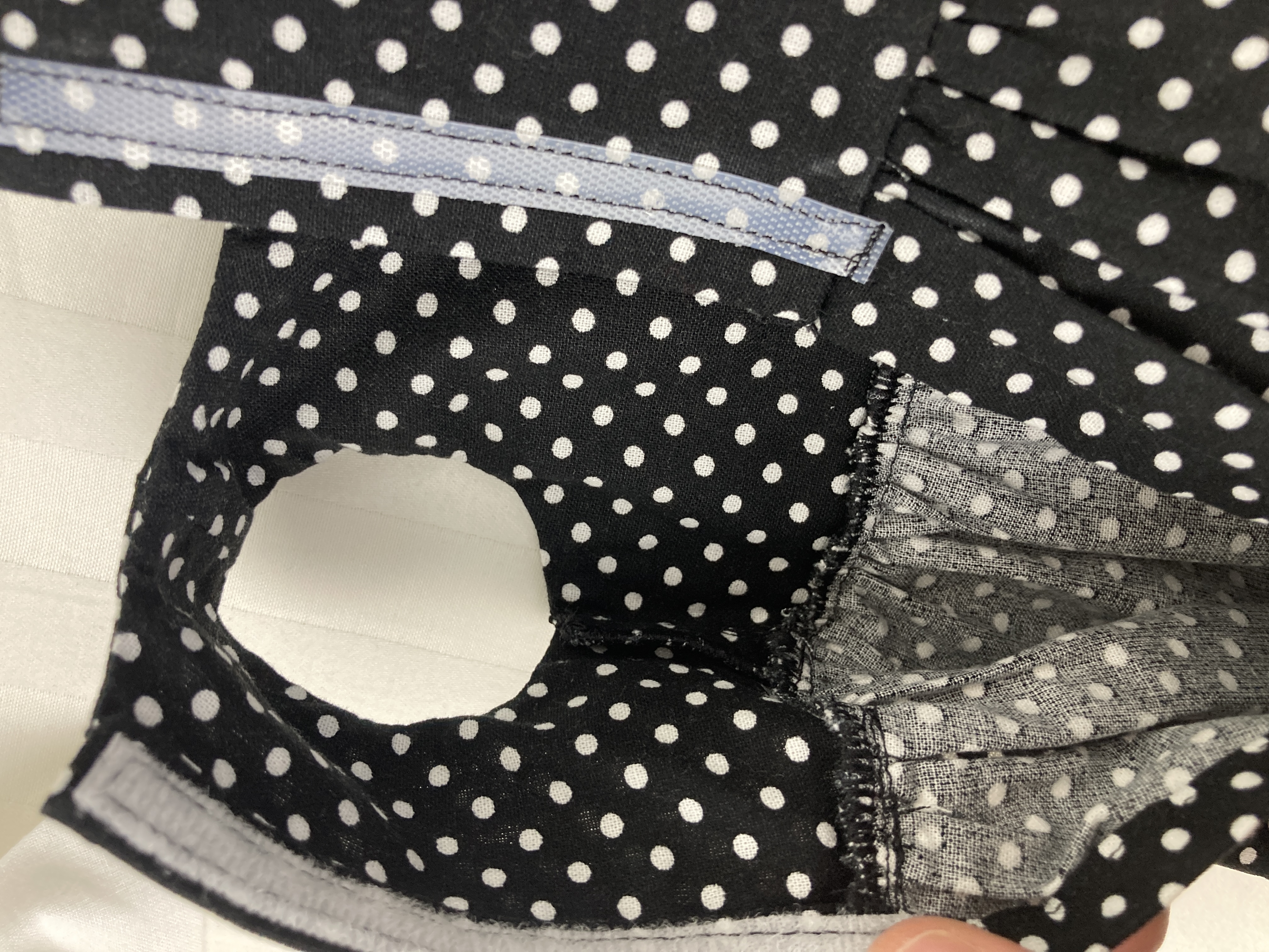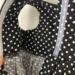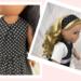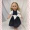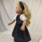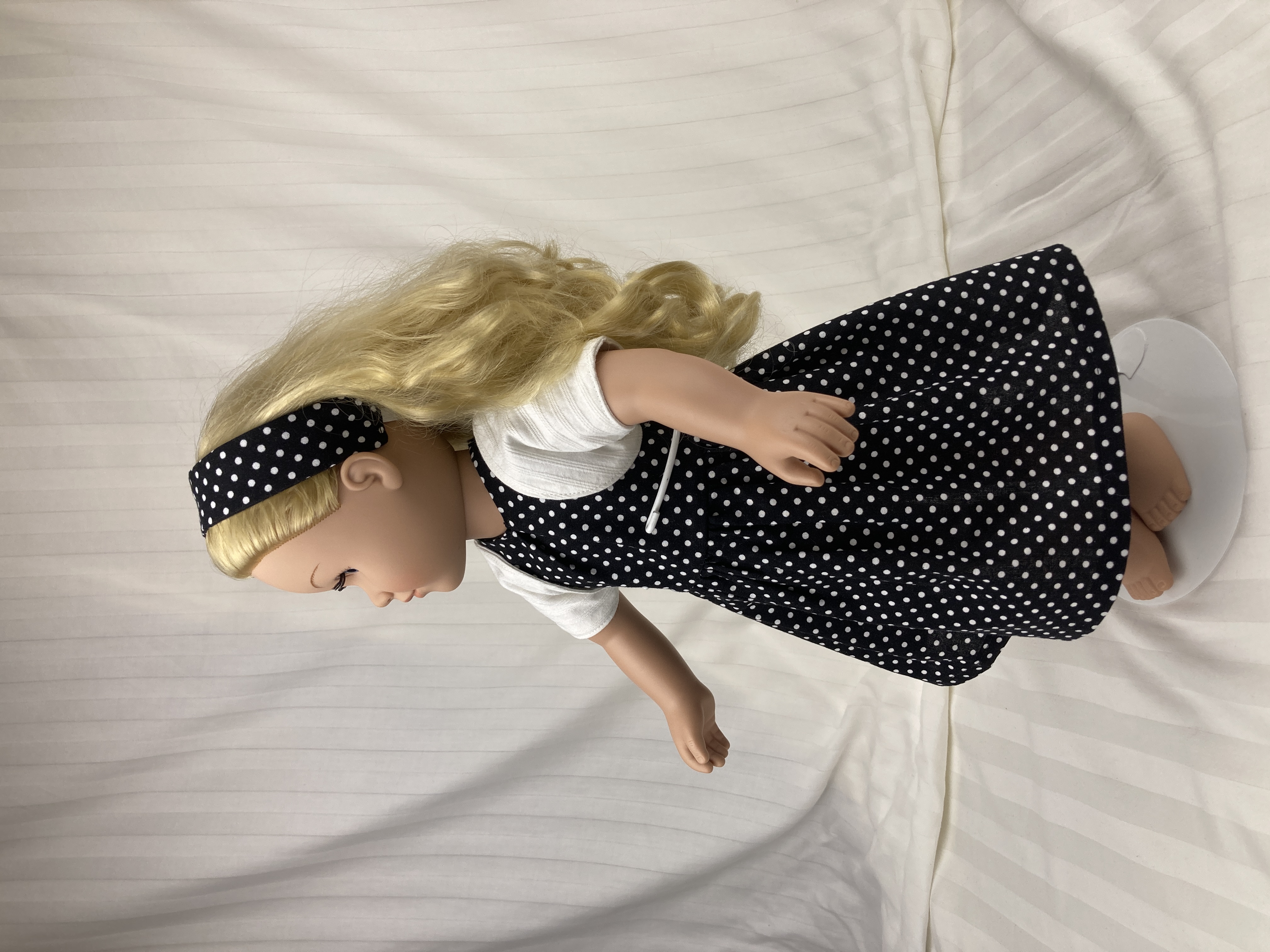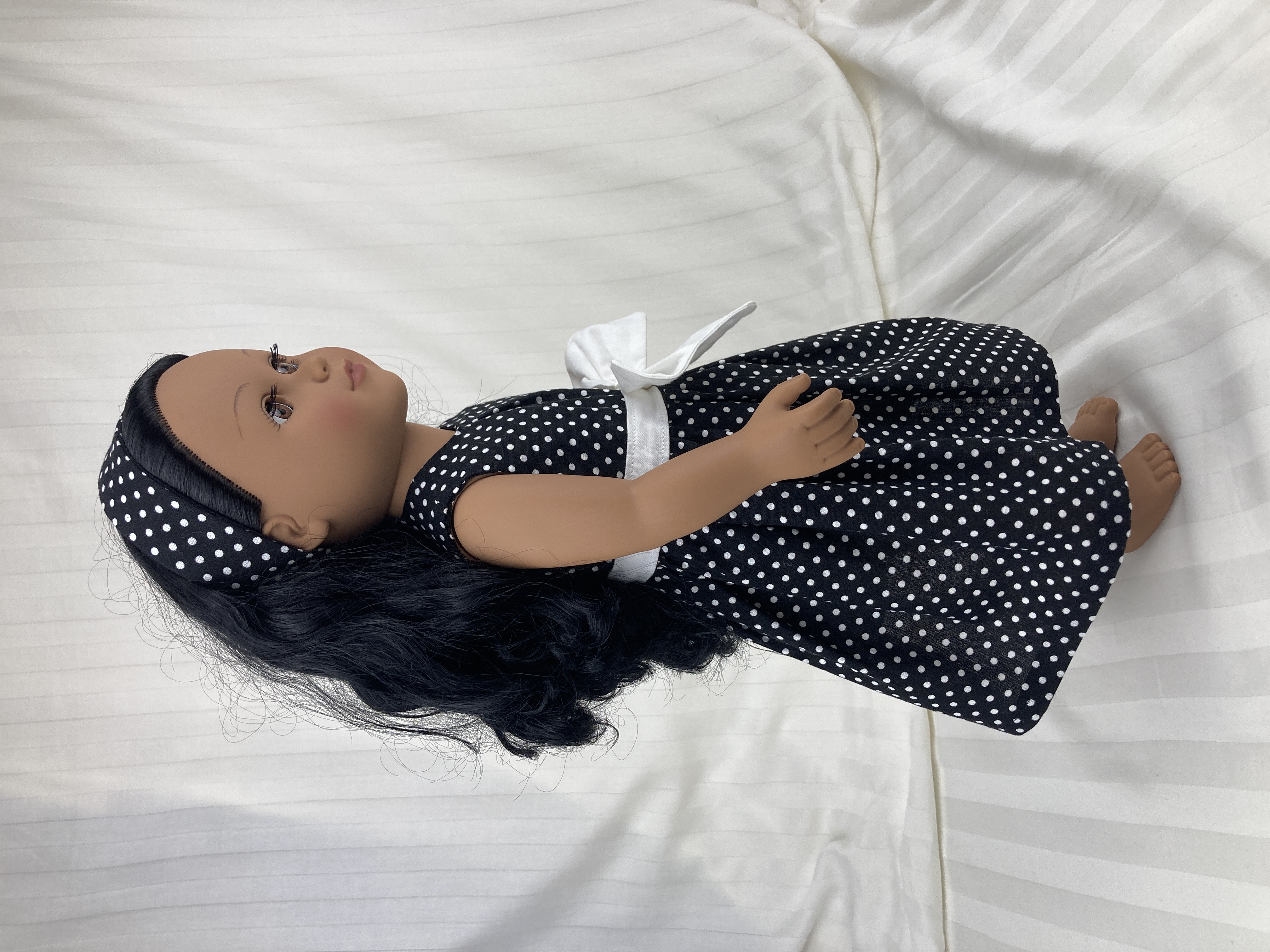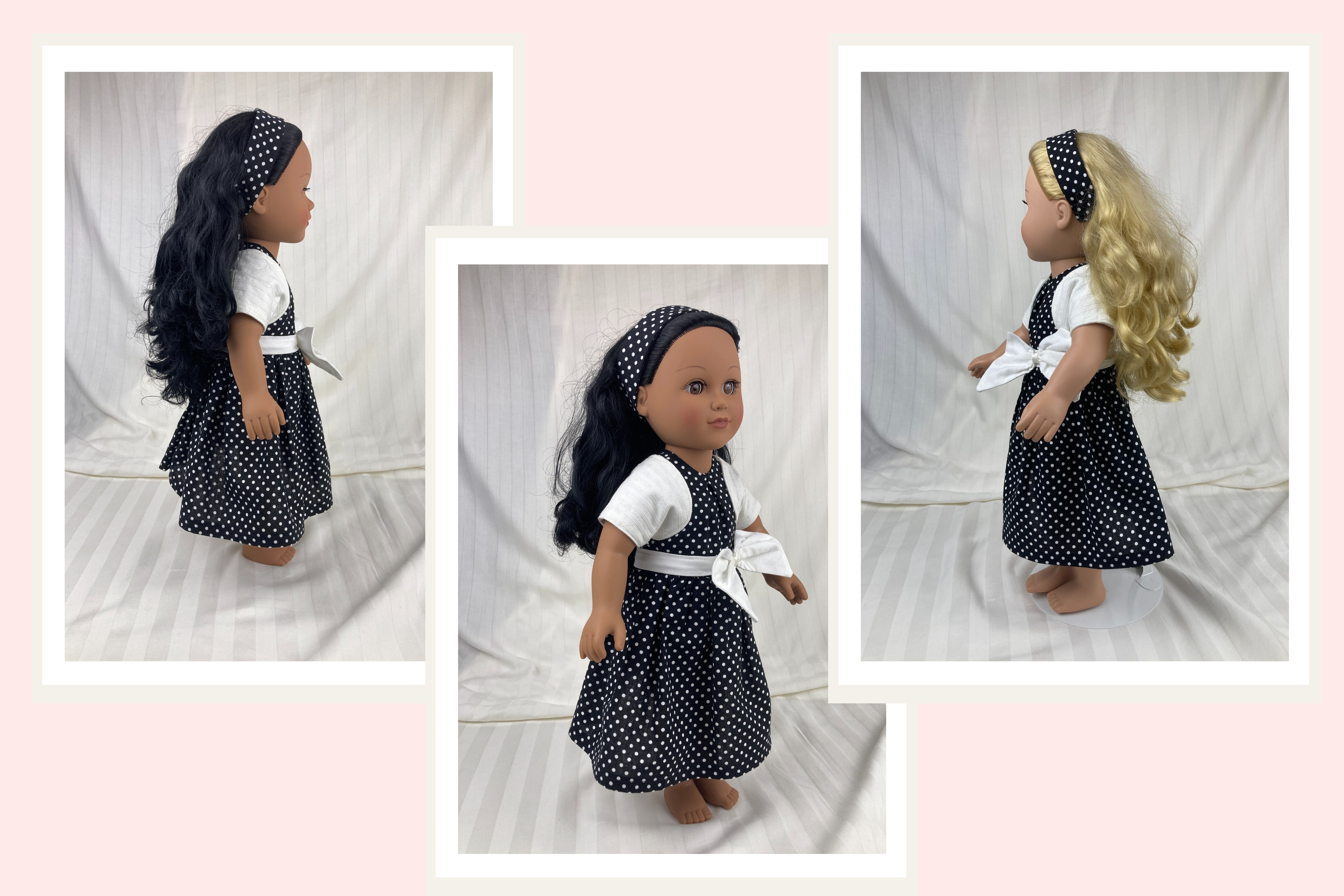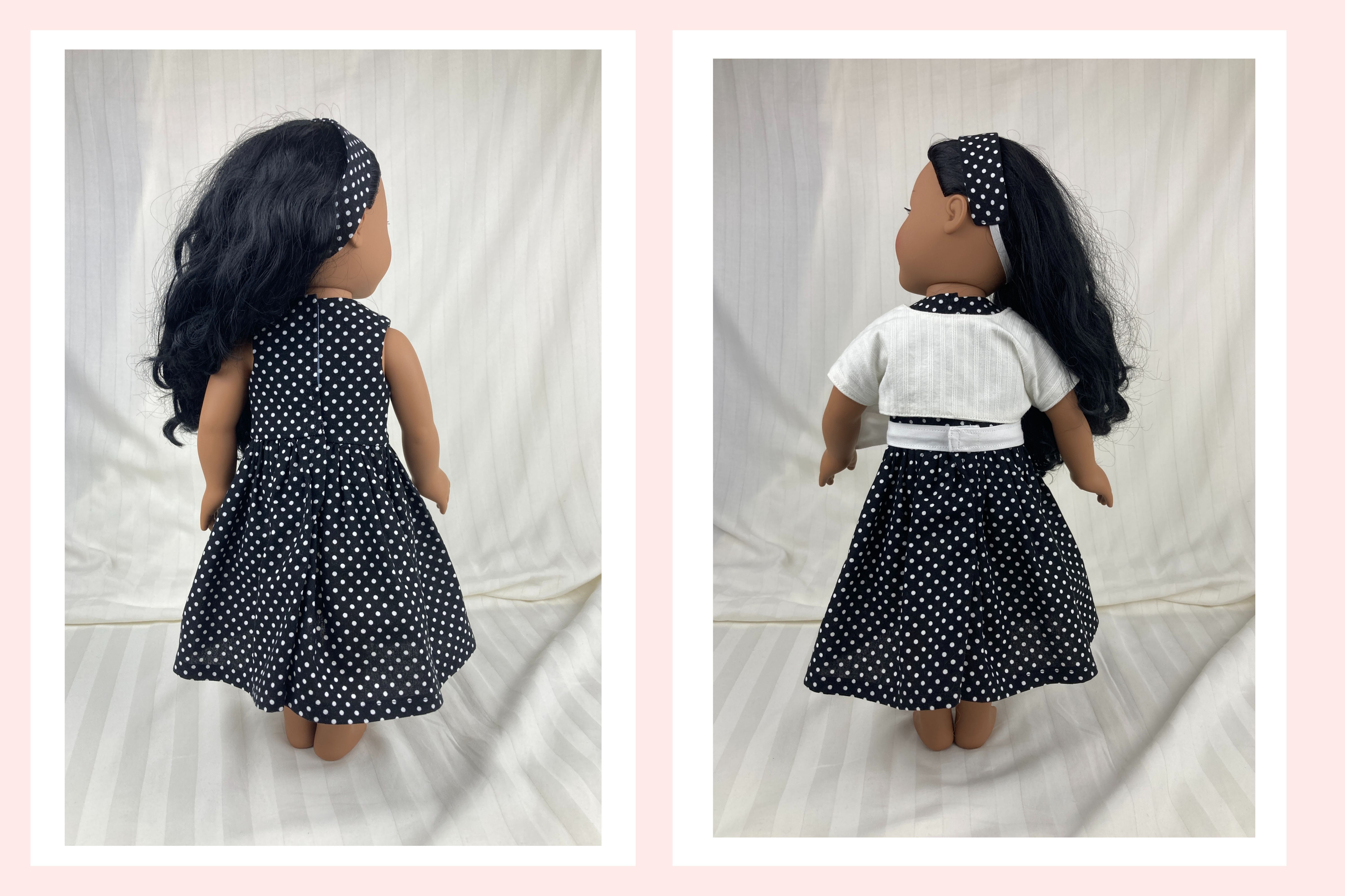 The sleeveless dress is made from cotton black and white mini polka dot fabric. The lined bodice has an inverted pleat in front and the skirt is full and gathered, falling well below the knees. The lined short sleeve bolero jacket is made from a textured, woven in, white on white stripe cotton fabric. The sash is made from white cotton fabric and features a large bow in front. The headband is made from the same black polka dot fabric as the dress. Dress and sash have hook and loop back closures.