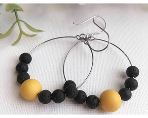 Stainless Steel wire 2” hoops with a matte yellow glass bead surrounded by 6 black lava stones. Wear as is, or apply your favorite essential oils to the lava. Big, but simple, hoop earrings with a bright yellow pop of color. Unique and lightweight, comfortable for everyday wear or a night out.