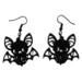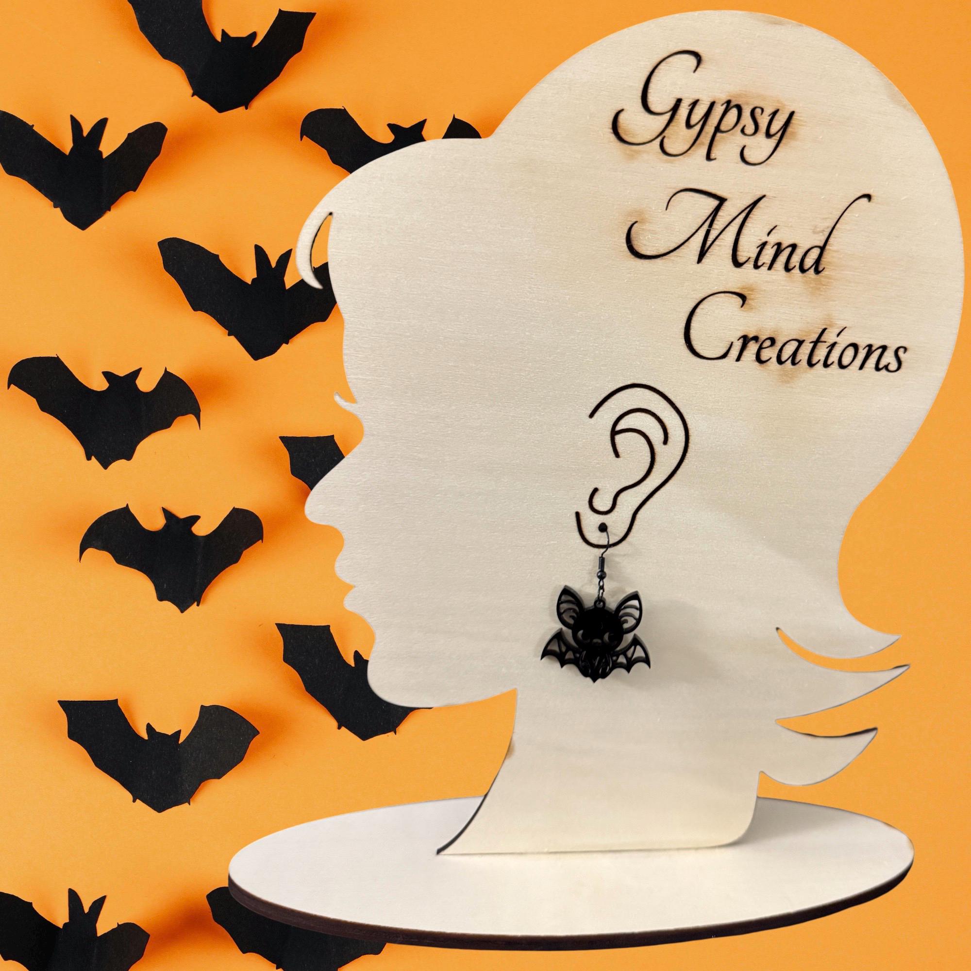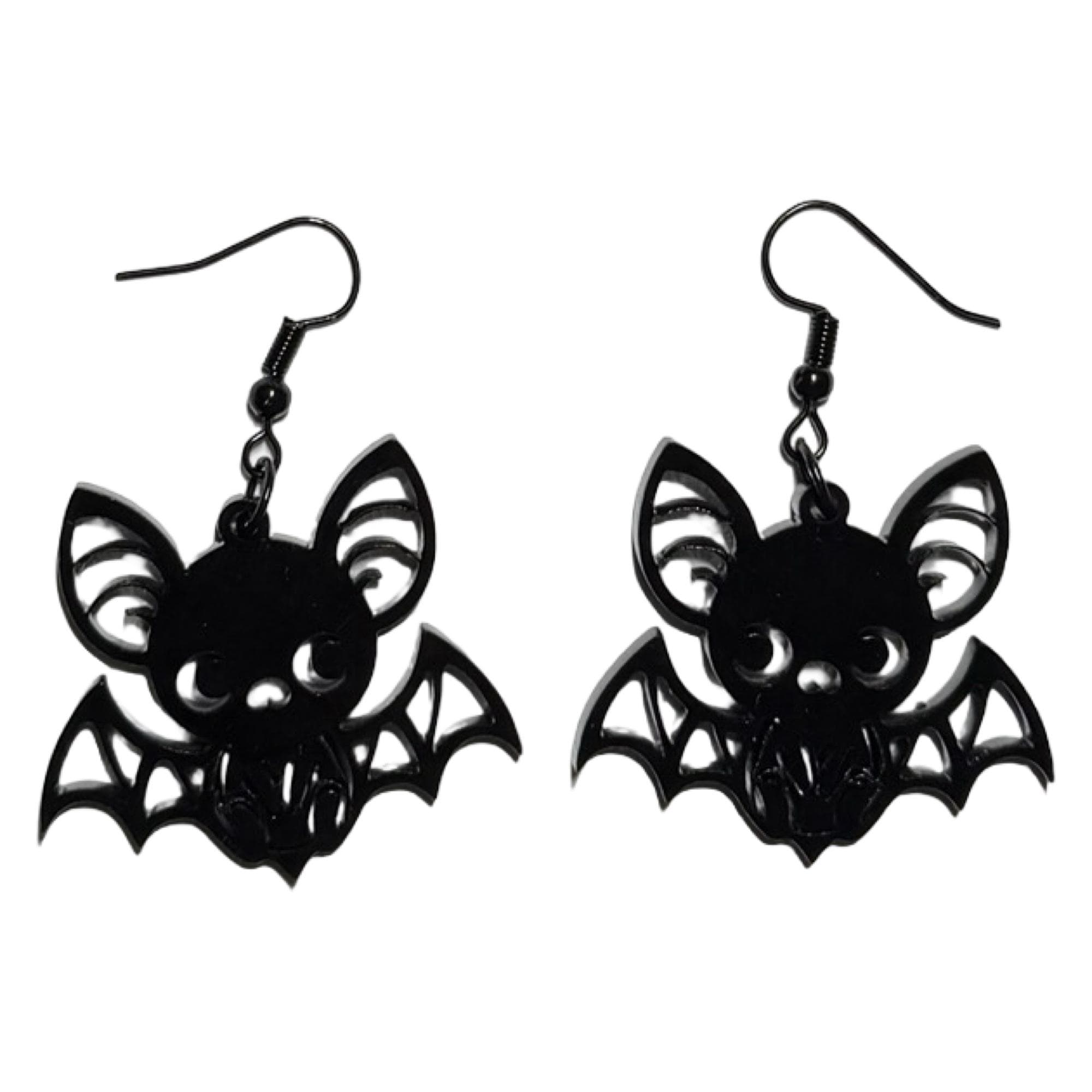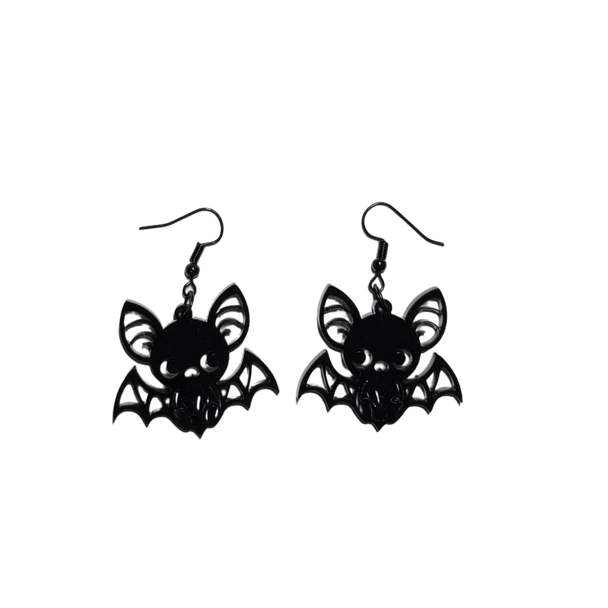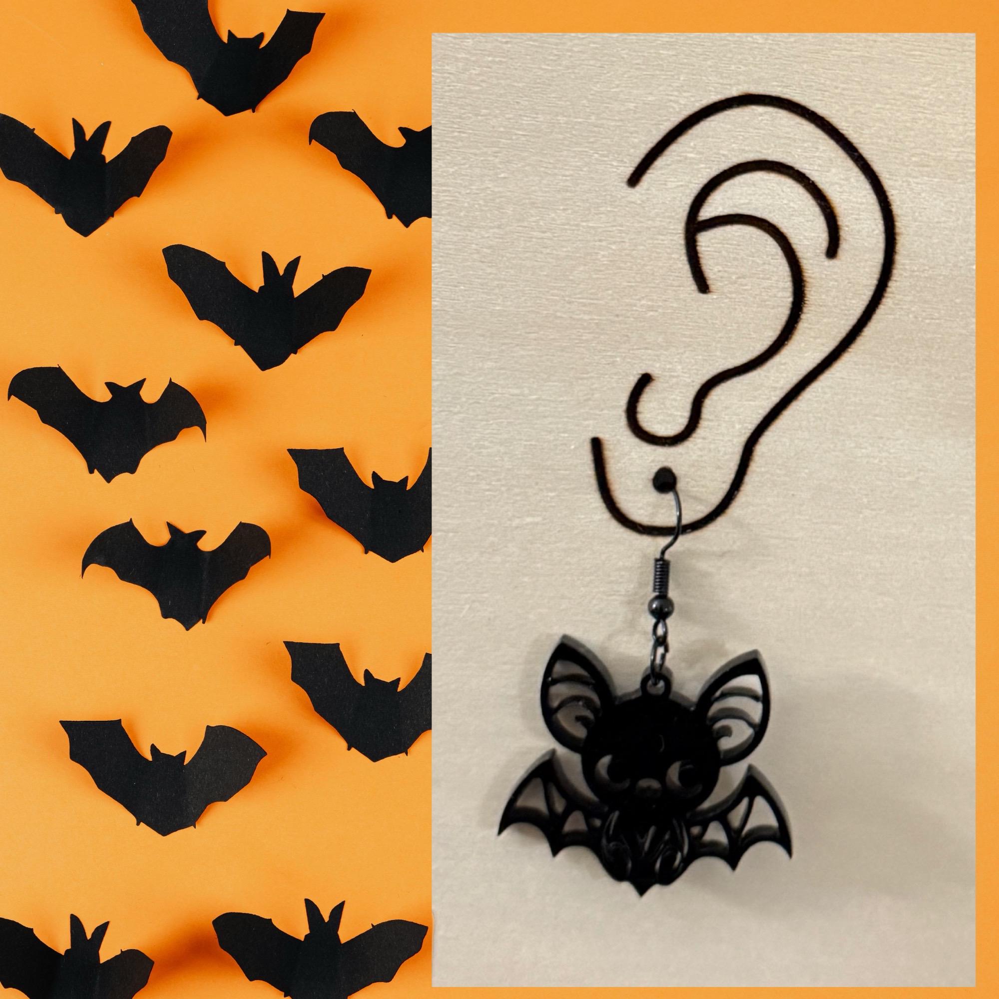 These are a pair of cute black bat laser cut lightweight acrylic earrings. They are made from 1/8 in thick medium black acrylic. They are on ear wires. All metal components are silver, gold, or brass plated, or black alloy, nickel & lead free, and hypoallergenic. They are approx. 1.25" long. Backs not included but available upon request.
