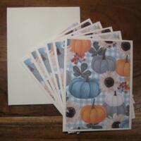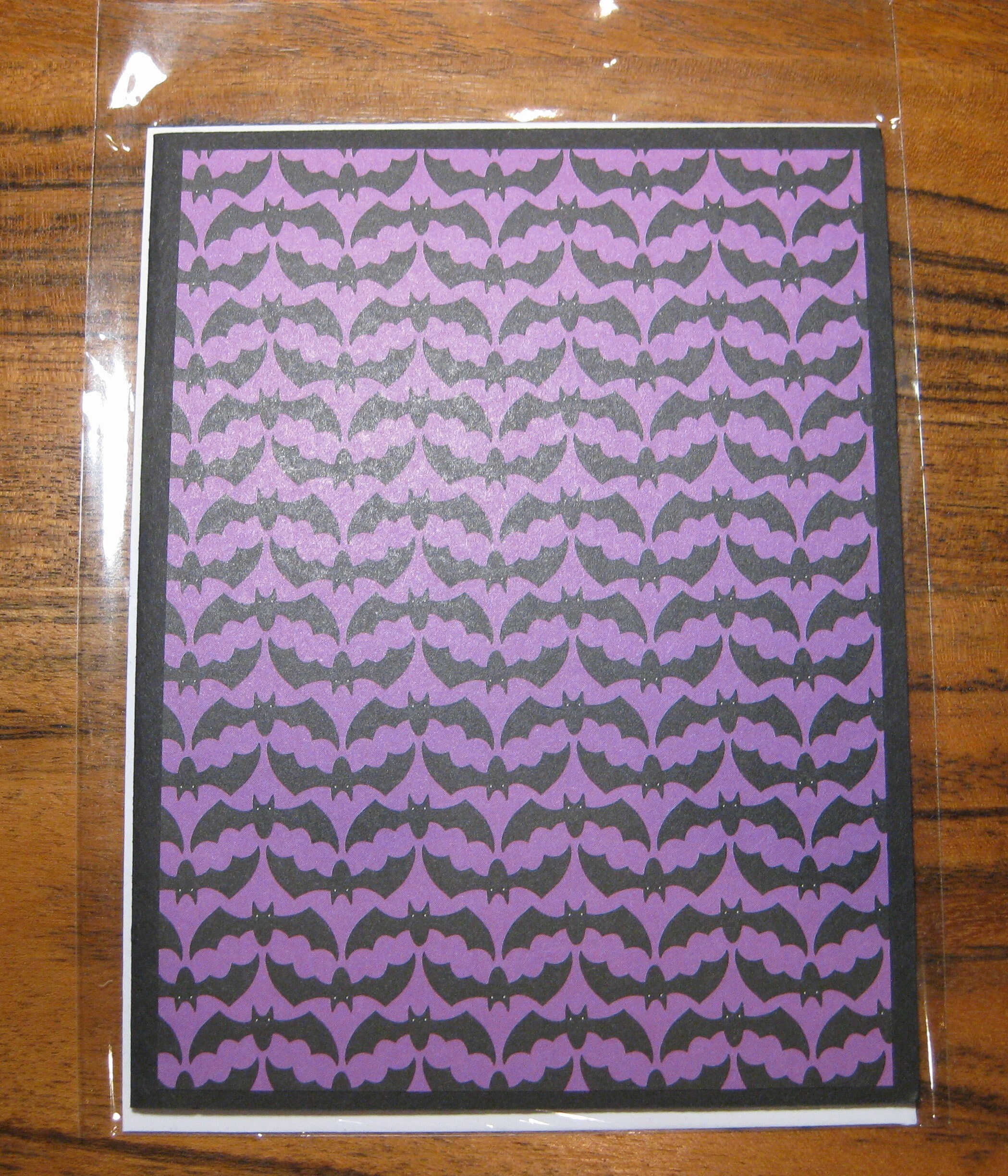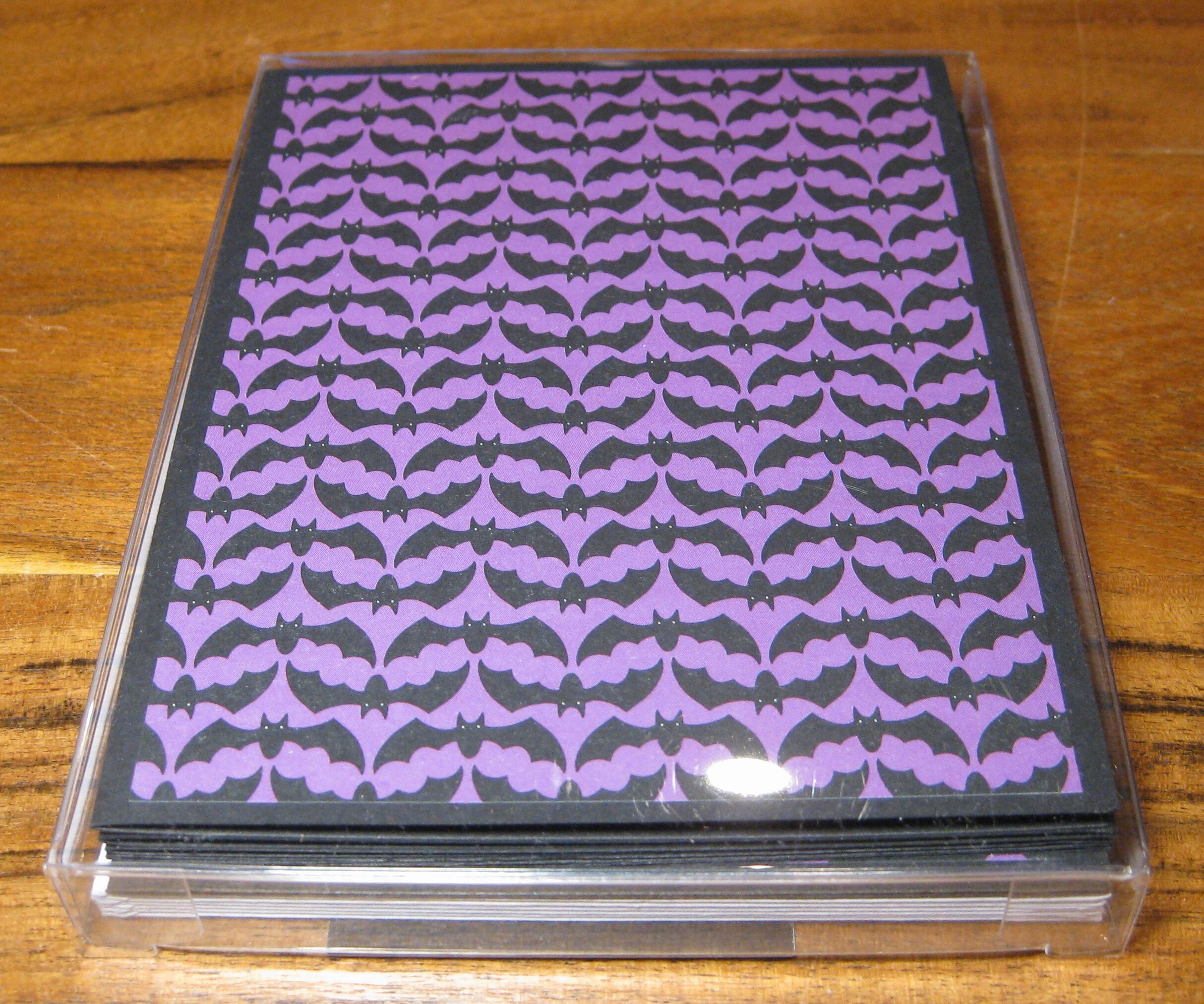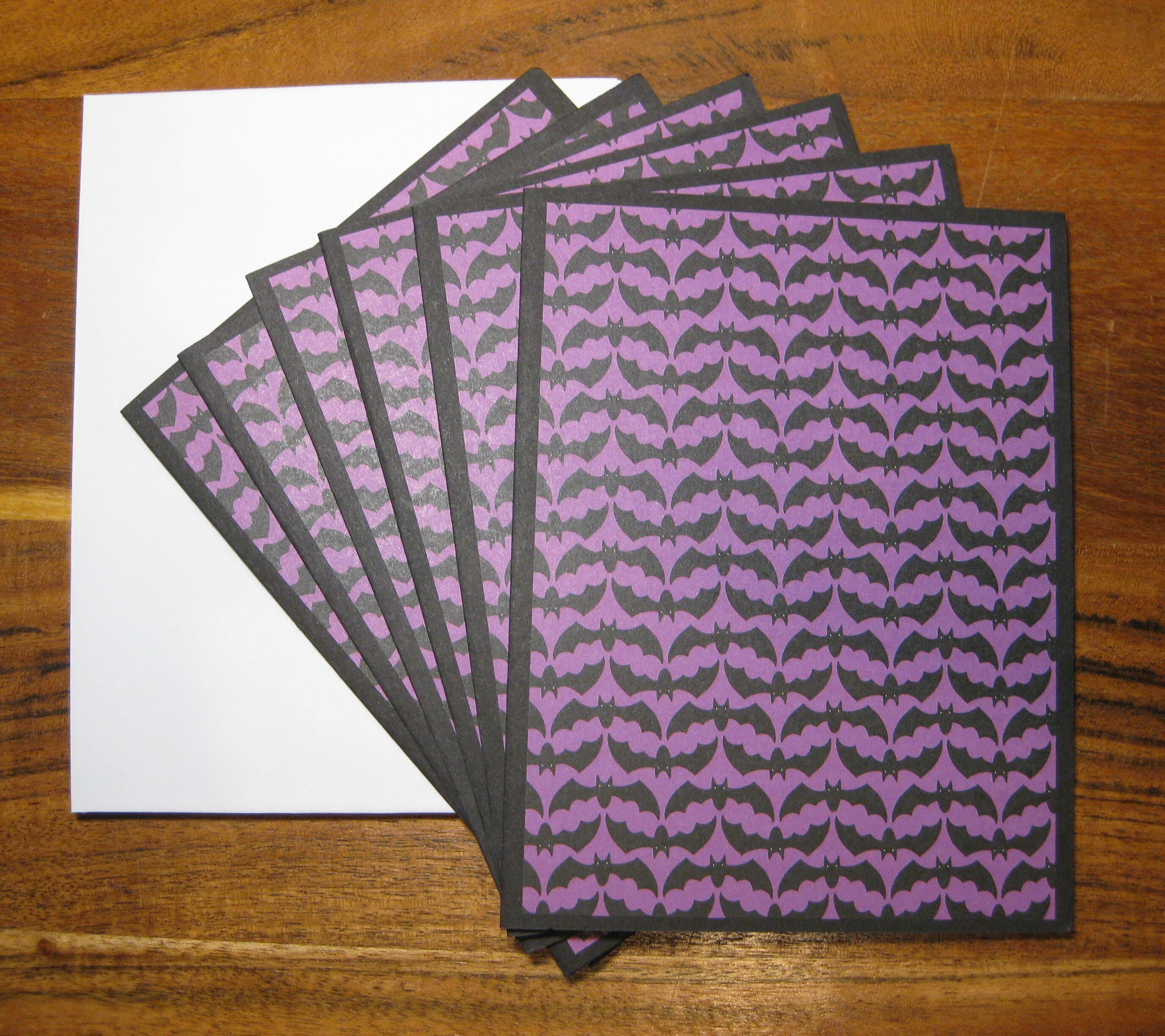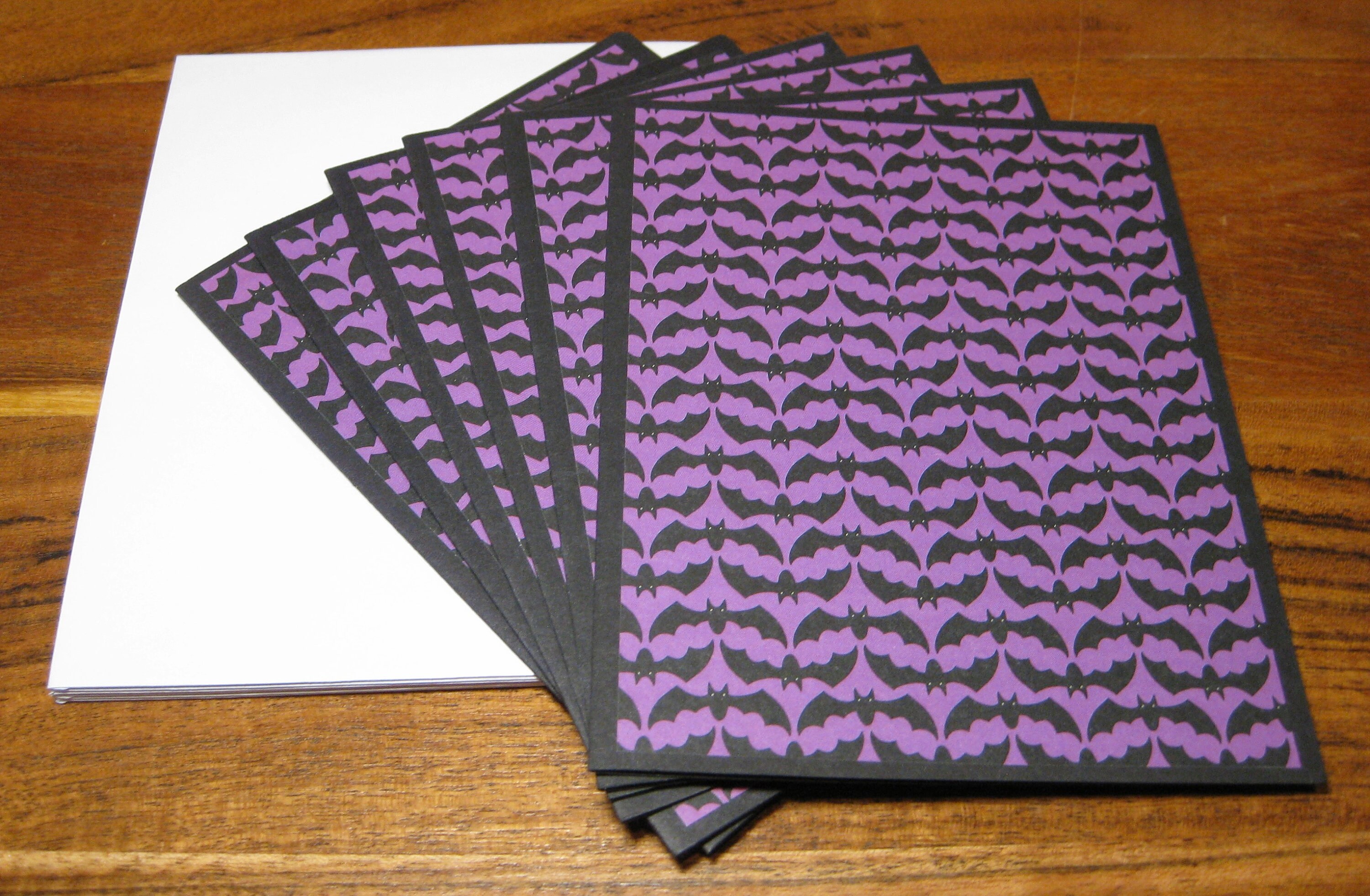 6 Bat note cards and 6 white envelopes. Purple background filled with black bats. The cardstock is black with white cardstock inside..