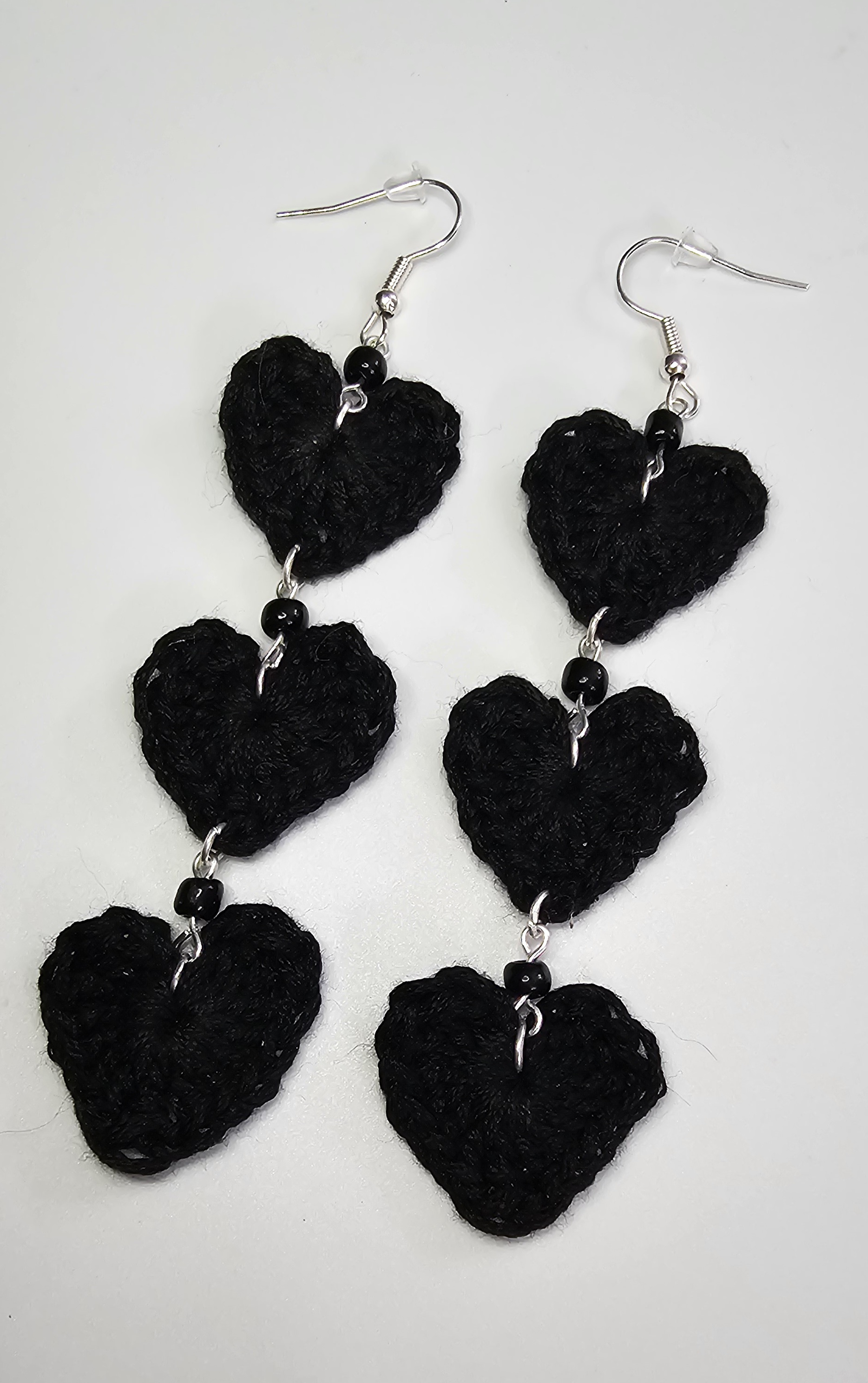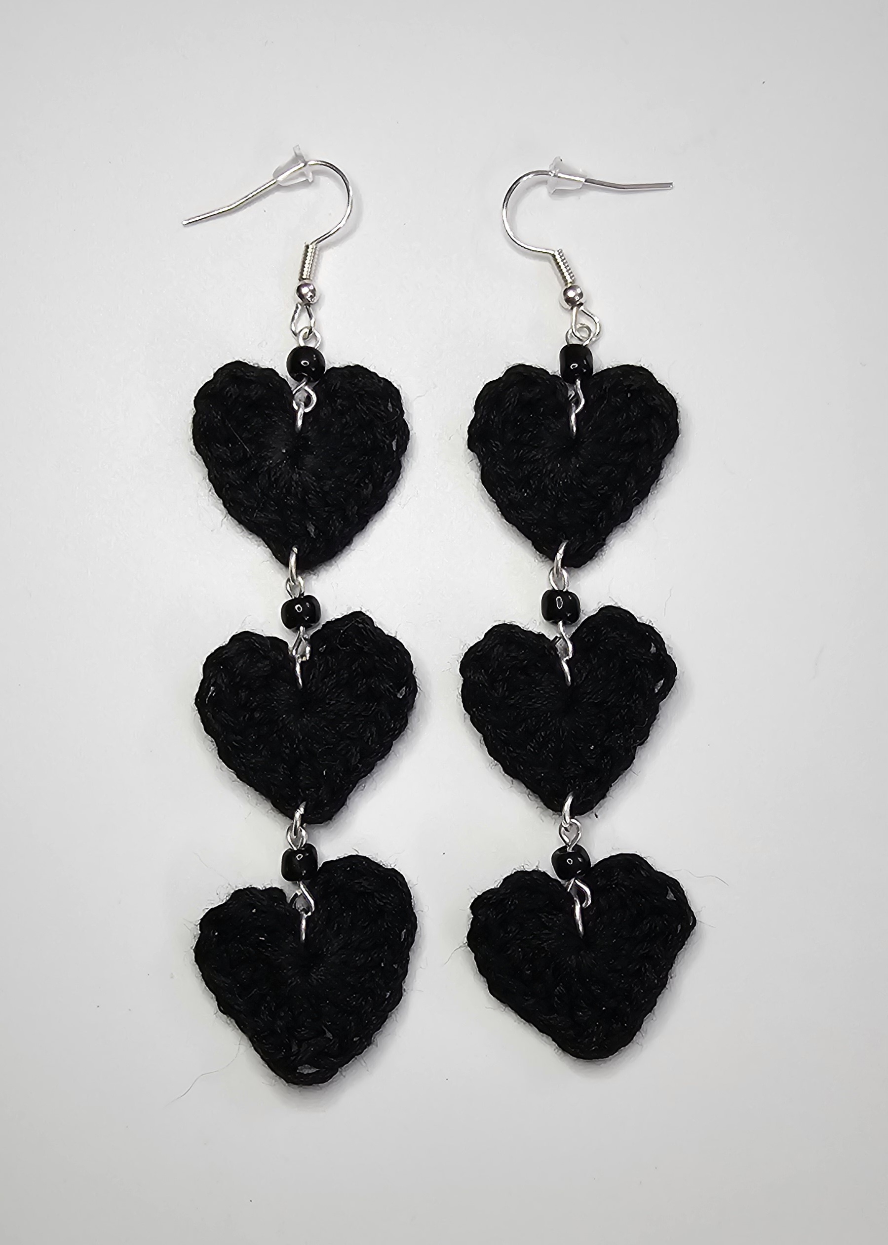 The hearts are lovingly hand crocheted with embroidery floss, then assembled together with black seed beads for extra pizzazz using jump rings.