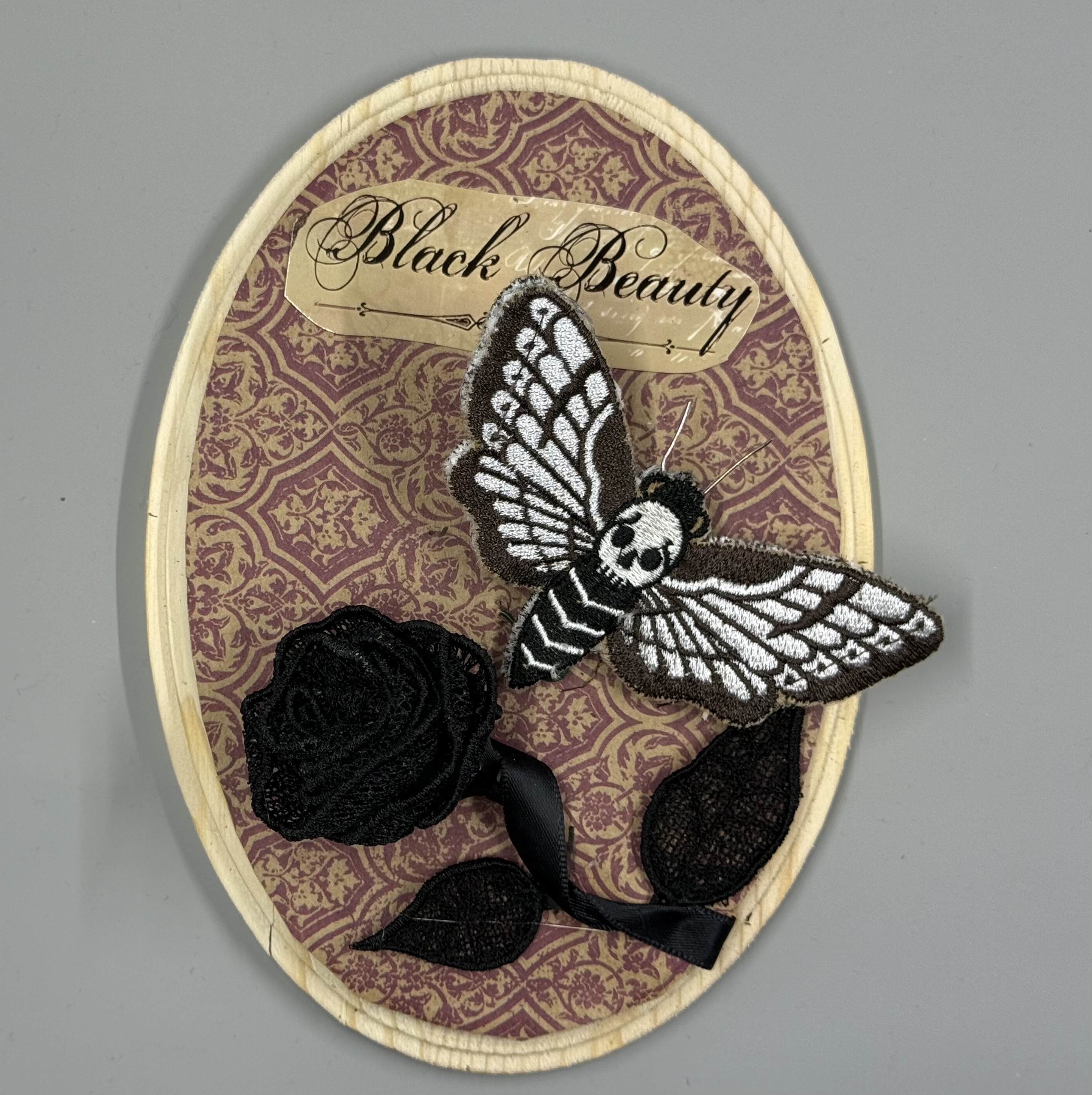 This artwork is displays an embroidered death, head, moth accompanied by a three-dimensional black embroidered, rose on display with the title black beauty on a wooden oval frame ready to be hung on the wall