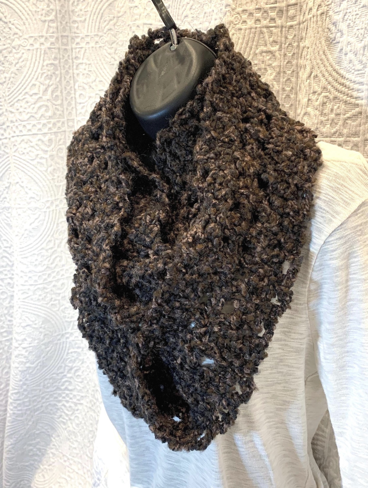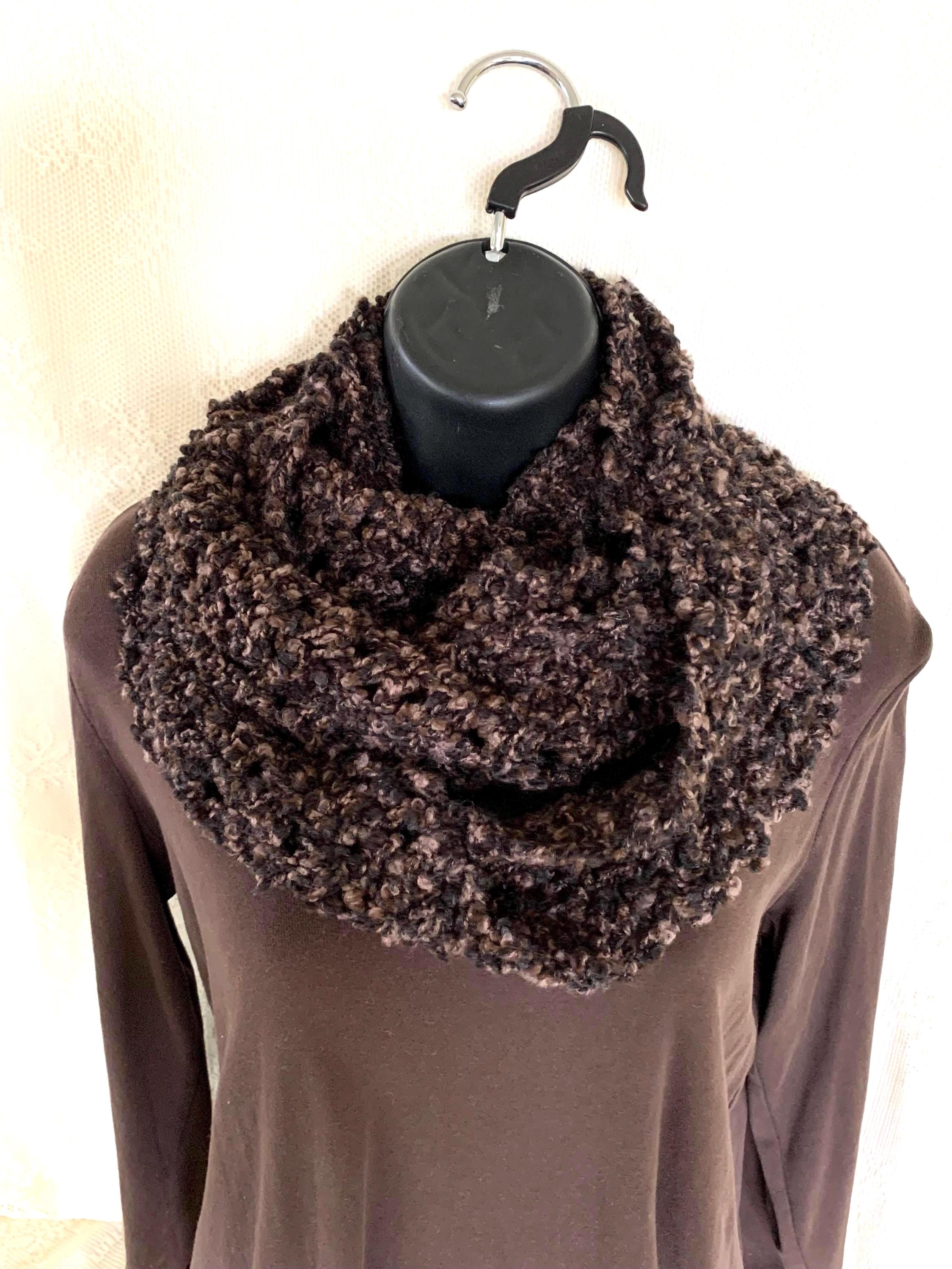 This is an original infinity scarf. I designed my own pattern and made it by hand with rare Bernat Soft Boucle yarn. It's an extra special and unique find gift!