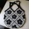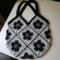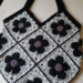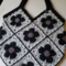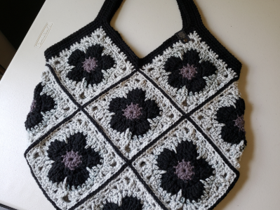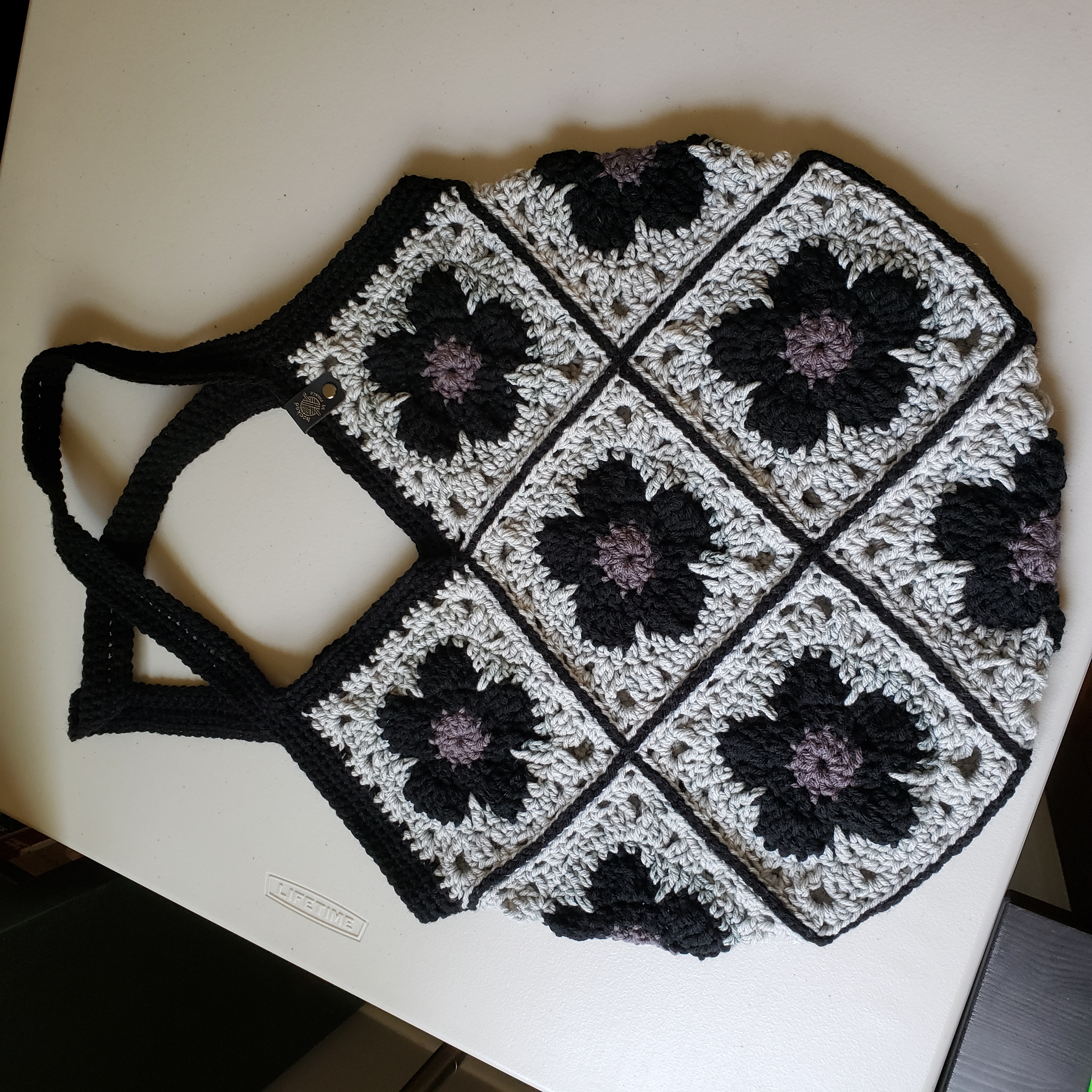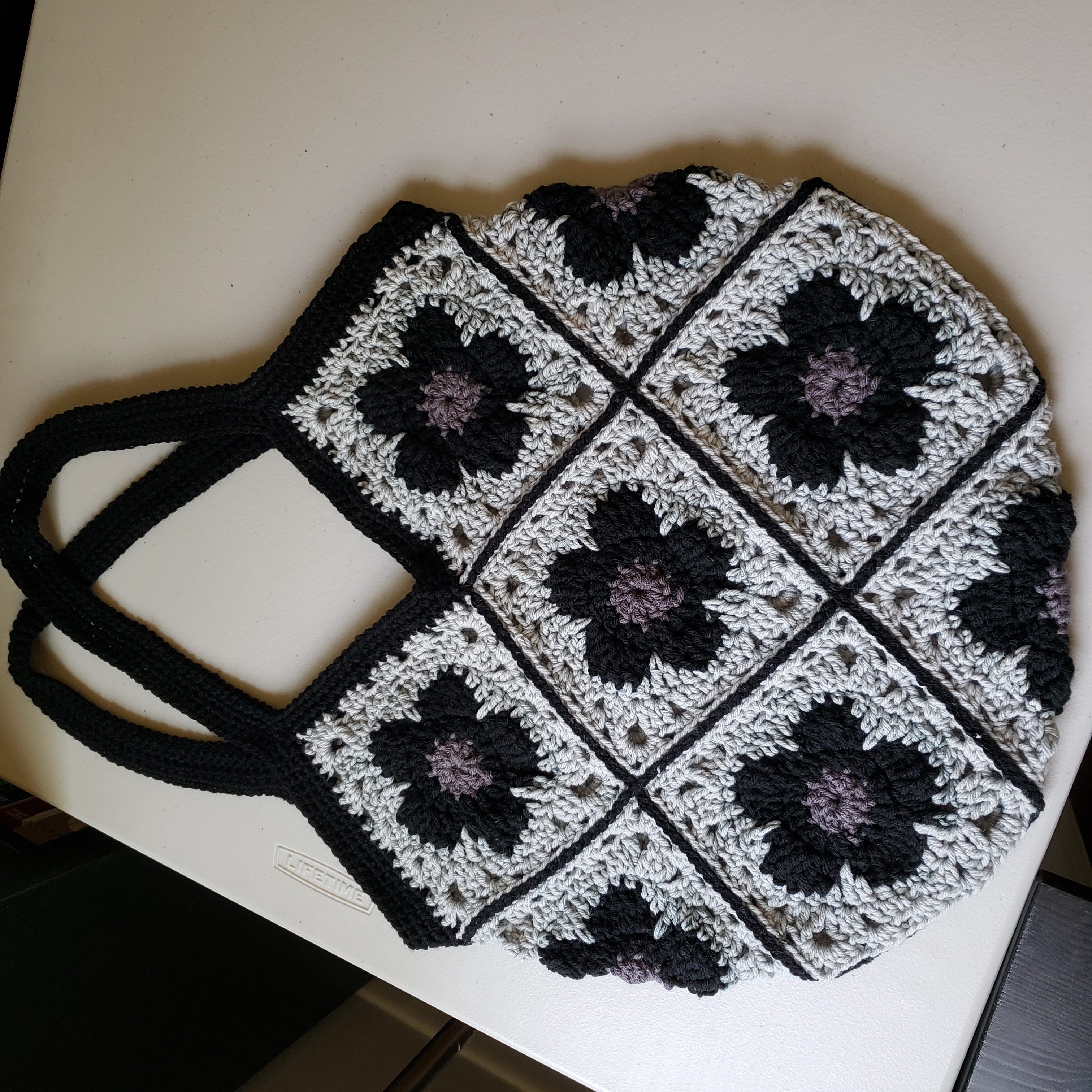 This is my handmade crochet tote bag. The bag is unlined and made with 100% acrylic yarn. The bag comes in many colorways, but this one is made with a yarn called All In One Flower Power in the colorway Black Dahlia. Includes faux leather Hooked By Ronald tag.