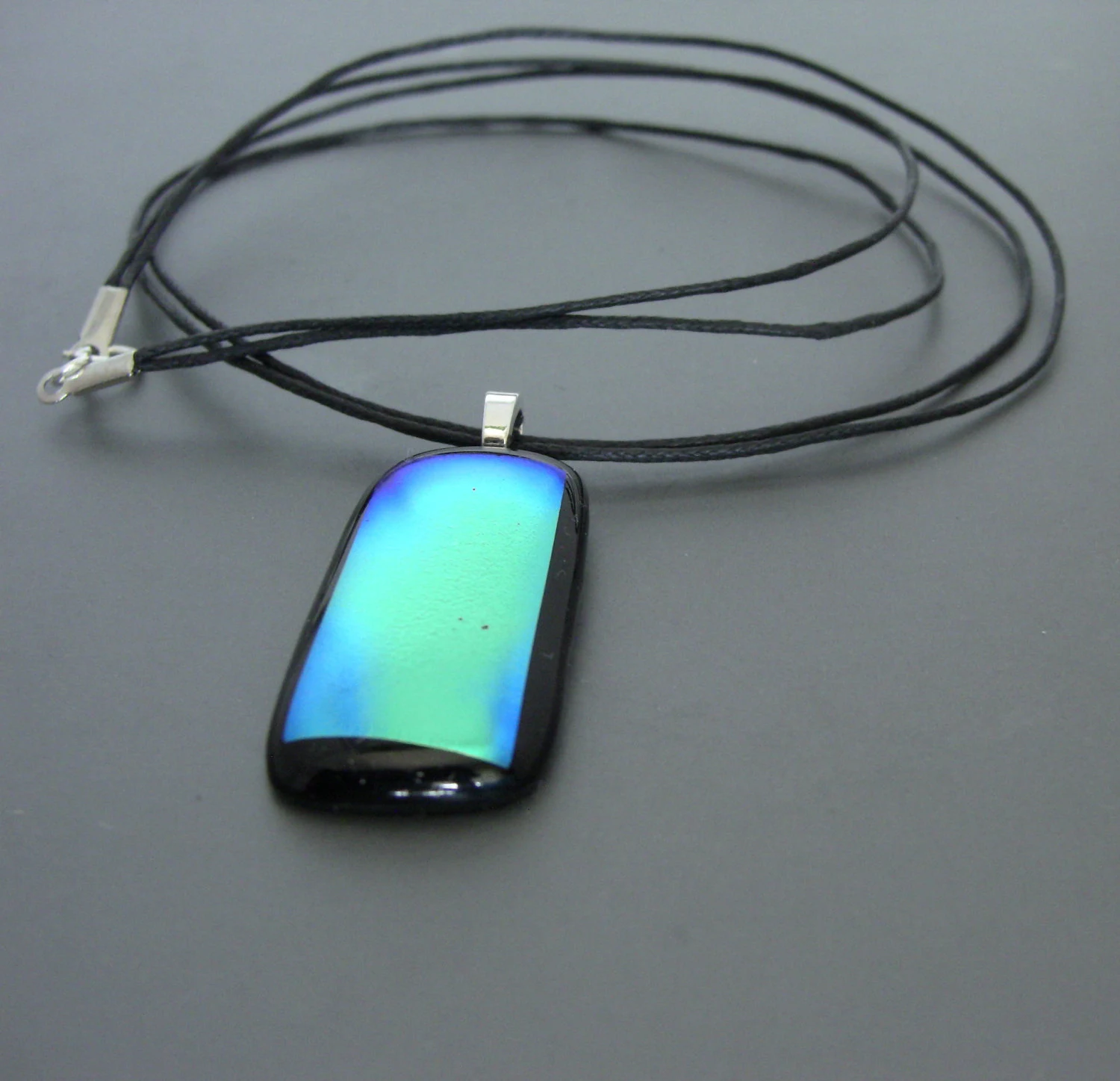 This medium pendant is very colorful and fun! It will definitely be noticed when you wear it. The layer of very colorful dichrotic glass is fused to black glass. The colors range from a deep blue to greens and yellow. The colors reflect the light beautifully. It is attached to a silver plated bail. It is on an 18" black cord with a sterling spring ring clasp. The pendant measures approx 1-1/2" tall by 3/4" wide.