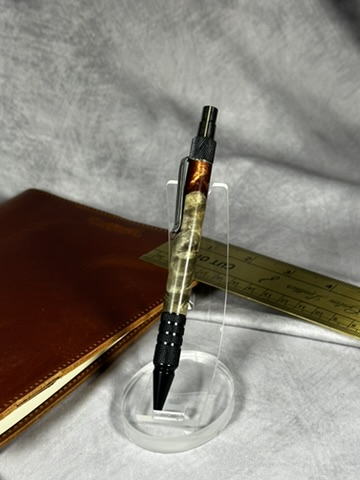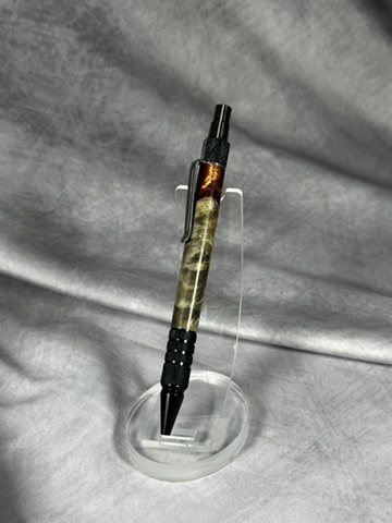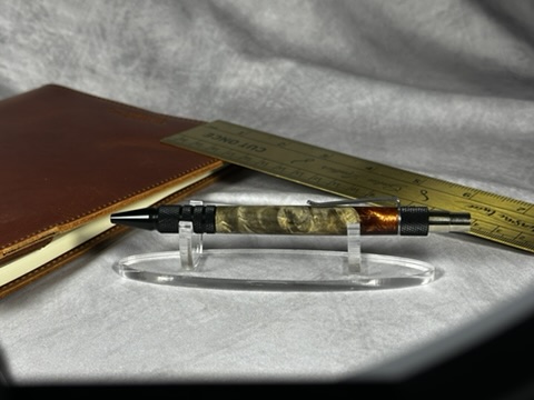 A sleek, weighty everyday carry click pen made from stabilized buckeye burl cast in shimmering copper-tinted epoxy. The natural figuring of the burl mixes with deep metallic highlights, giving the barrel a rugged, high-end look. The matte-black hardware keeps the overall theme clean and modern.