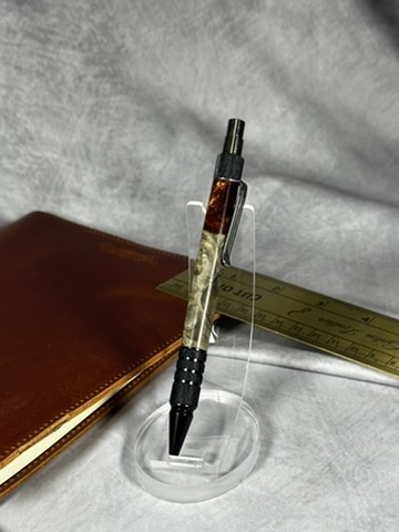The hybrid blank is cut, drilled, and precisely squared. The brass tube is epoxied inside, then the blank is turned on the lathe to final shape. After shaping, the barrel is sanded through a full grit progression and finished with a multi-stage polishing system that creates a durable, glassy gloss.Finally, the pen is assembled by hand and inspected for fit, finish, and smooth click action.