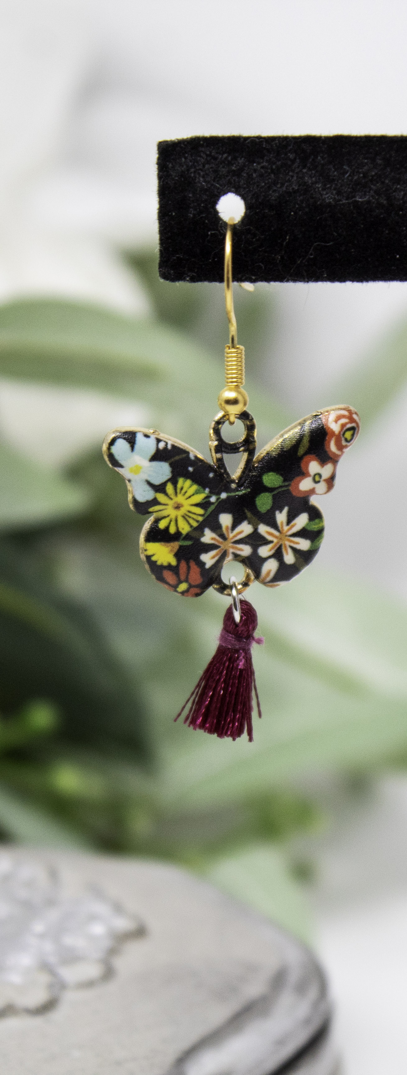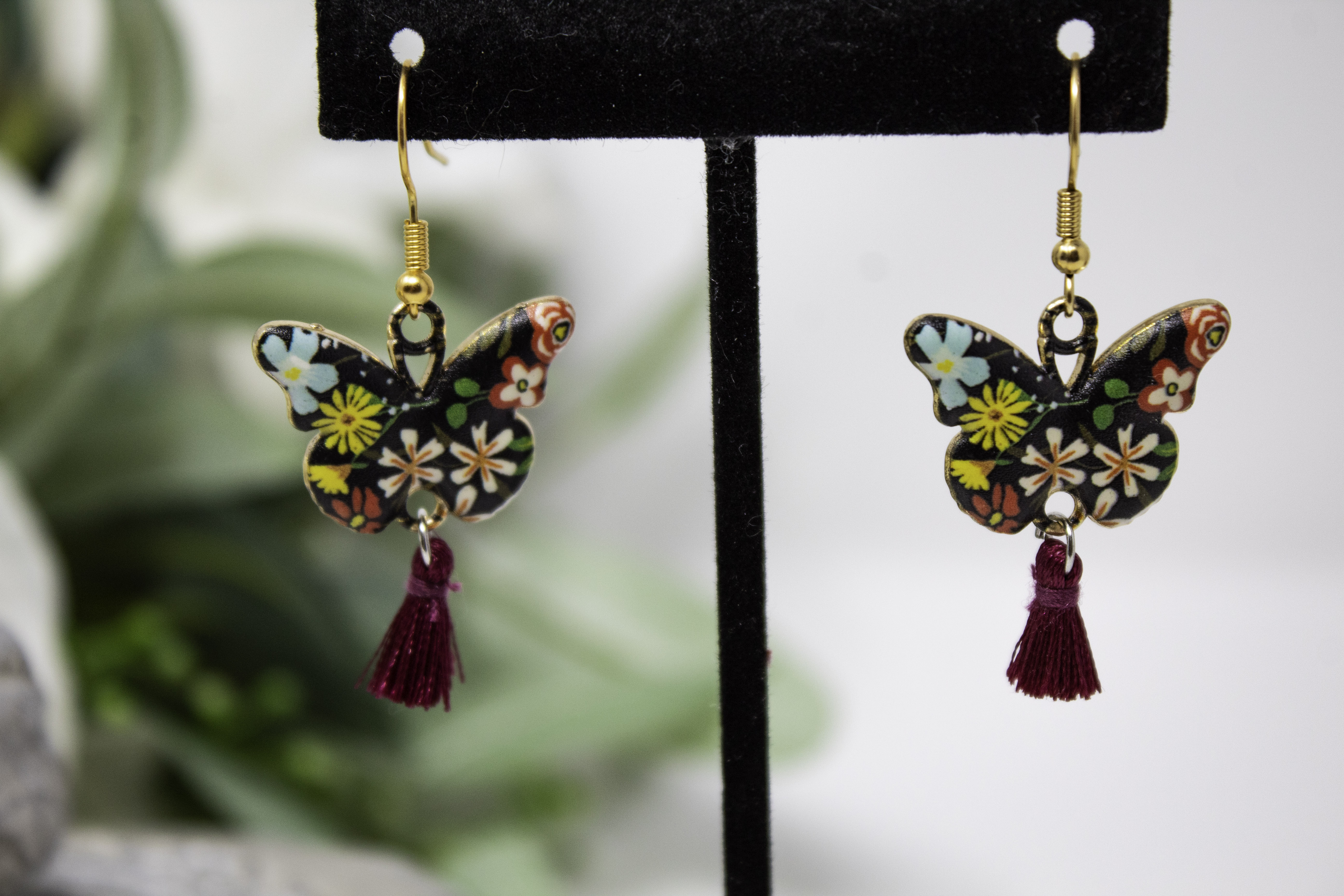 These stunning black floral butterfly tassel earrings are the perfect blend of elegance and whimsy. Each earring features a beautifully detailed butterfly charm adorned with a black floral pattern, finished with a soft maroon tassel that adds movement and charm. The gold-tone hardware gives them a touch of warmth and sophistication, making them easy to pair with both casual and dressy looks.