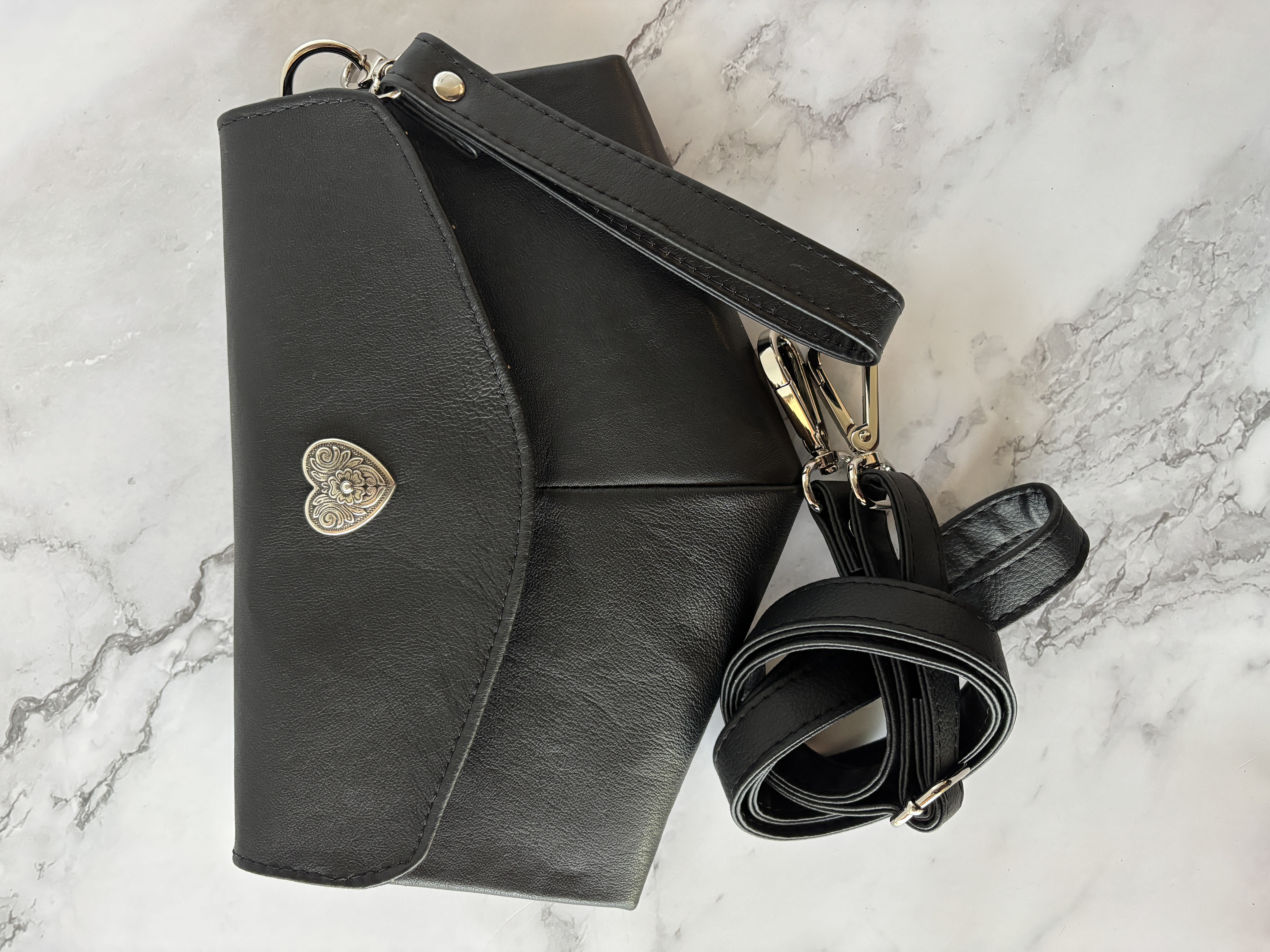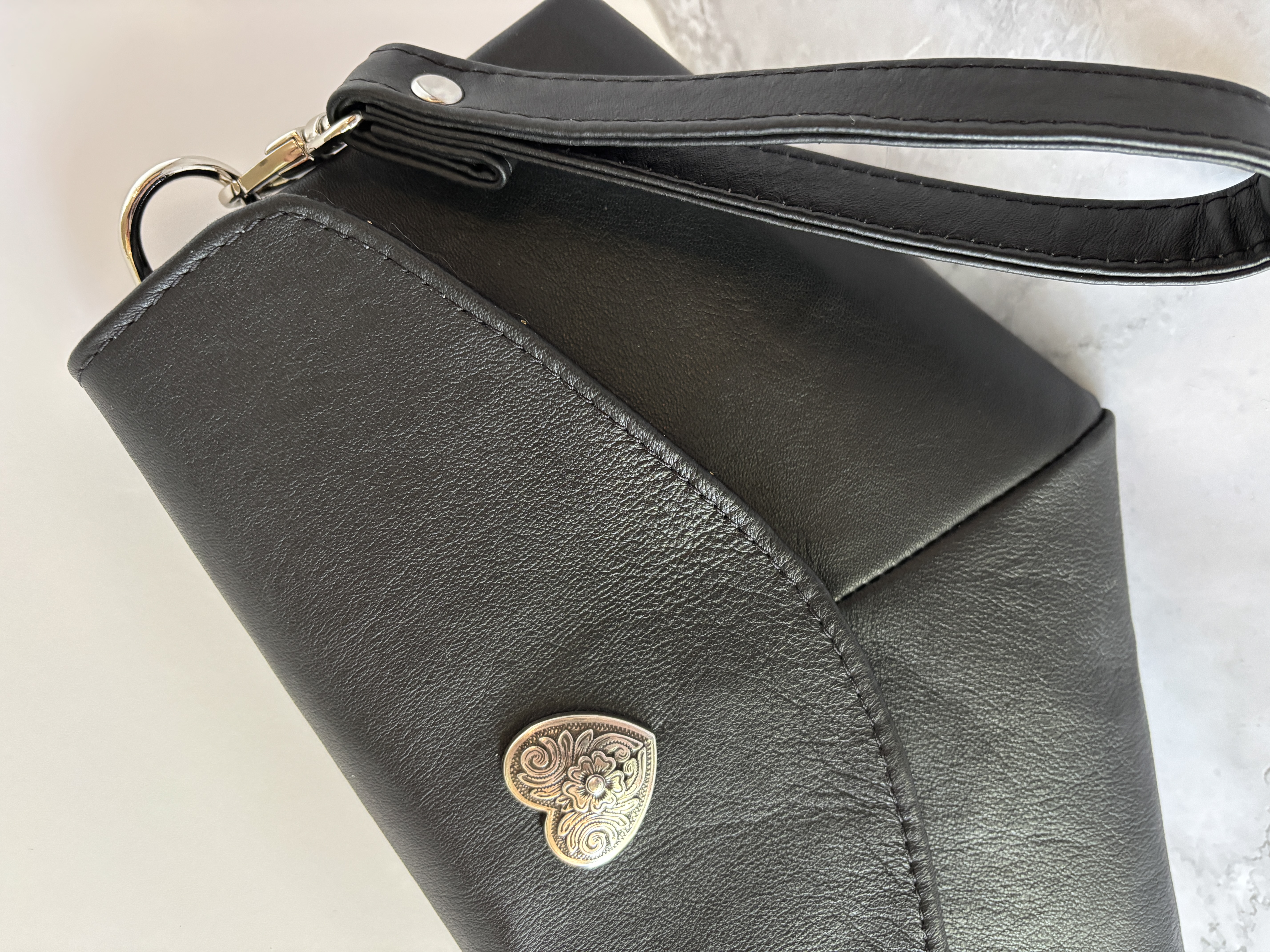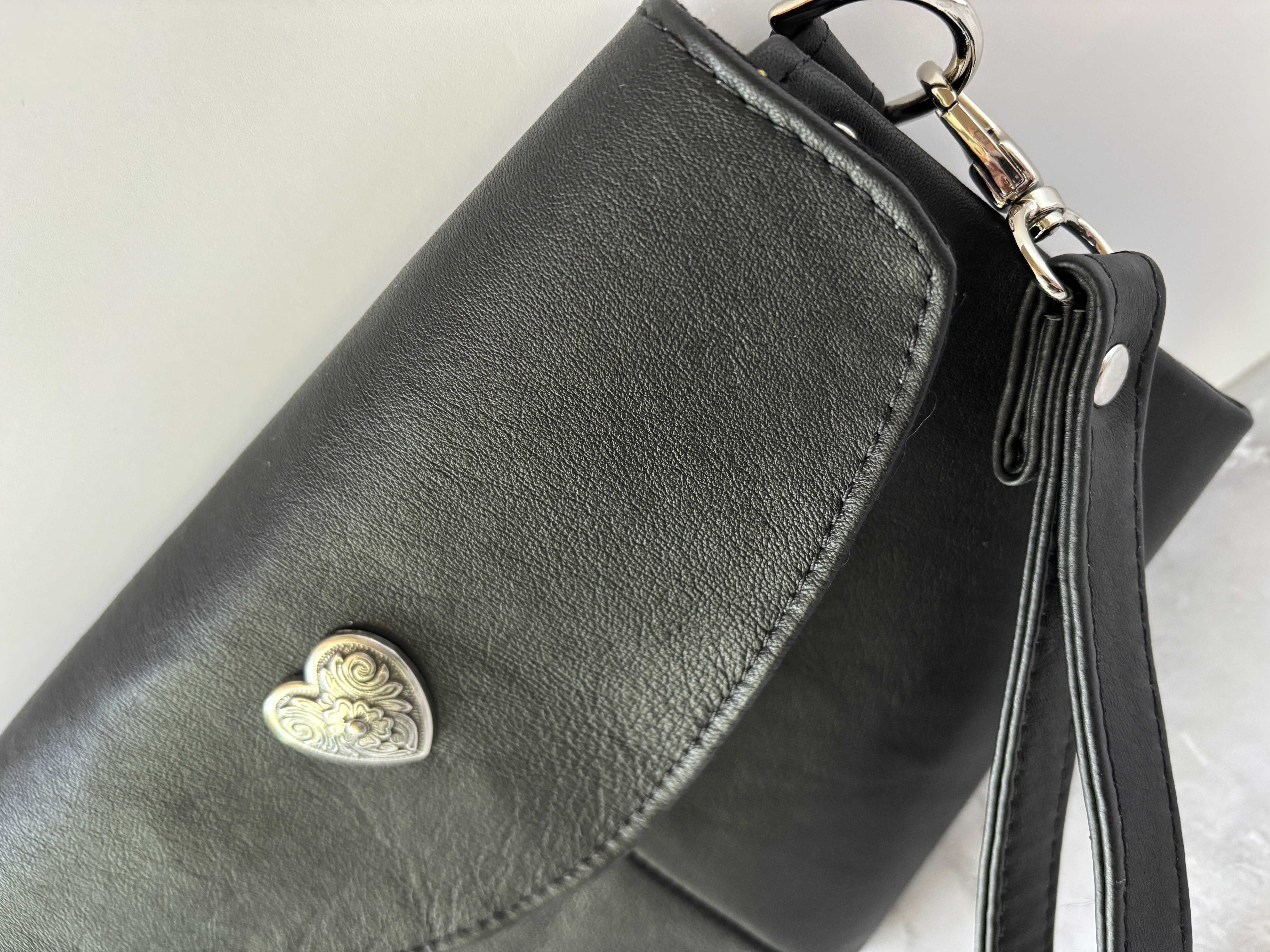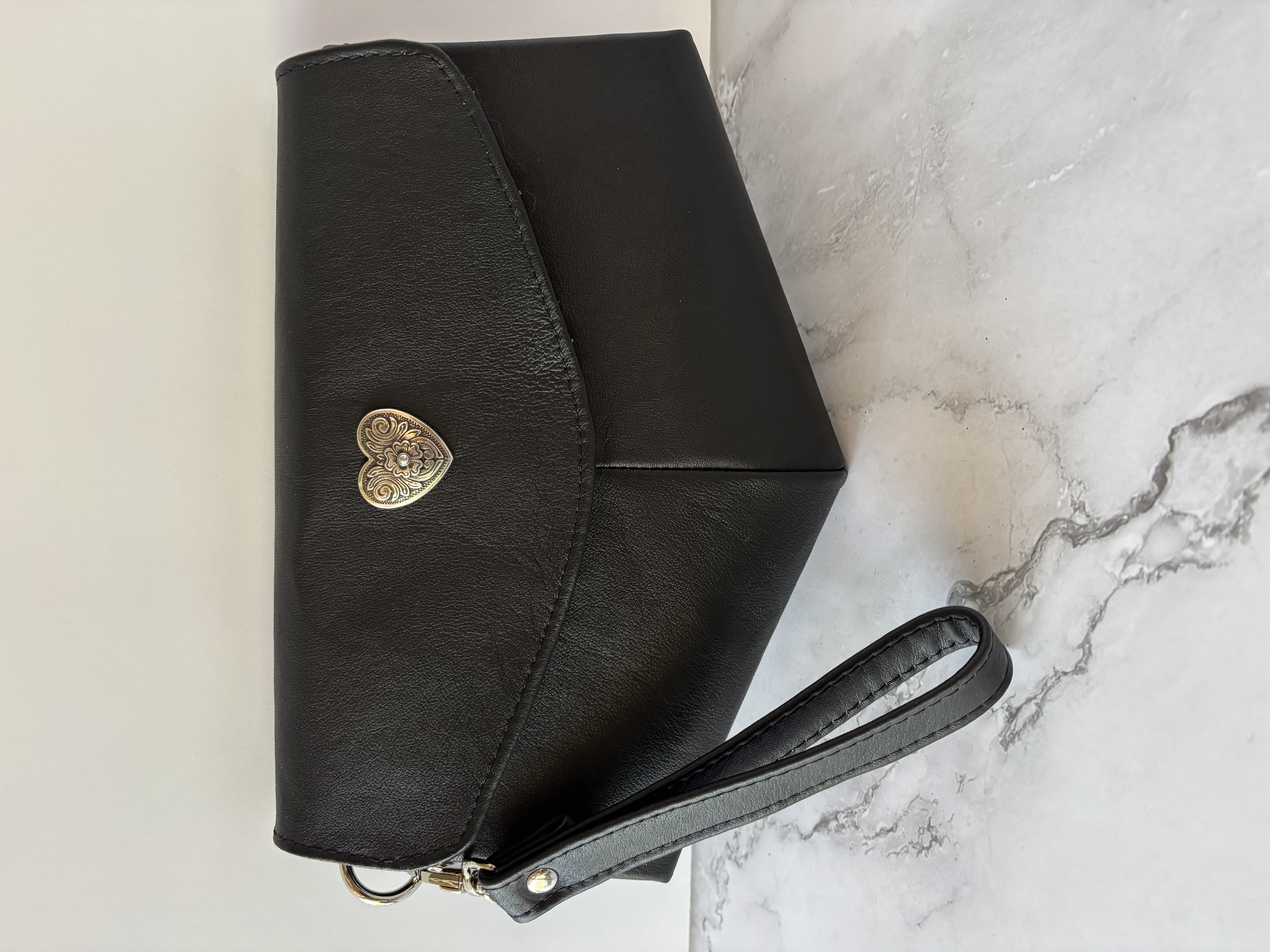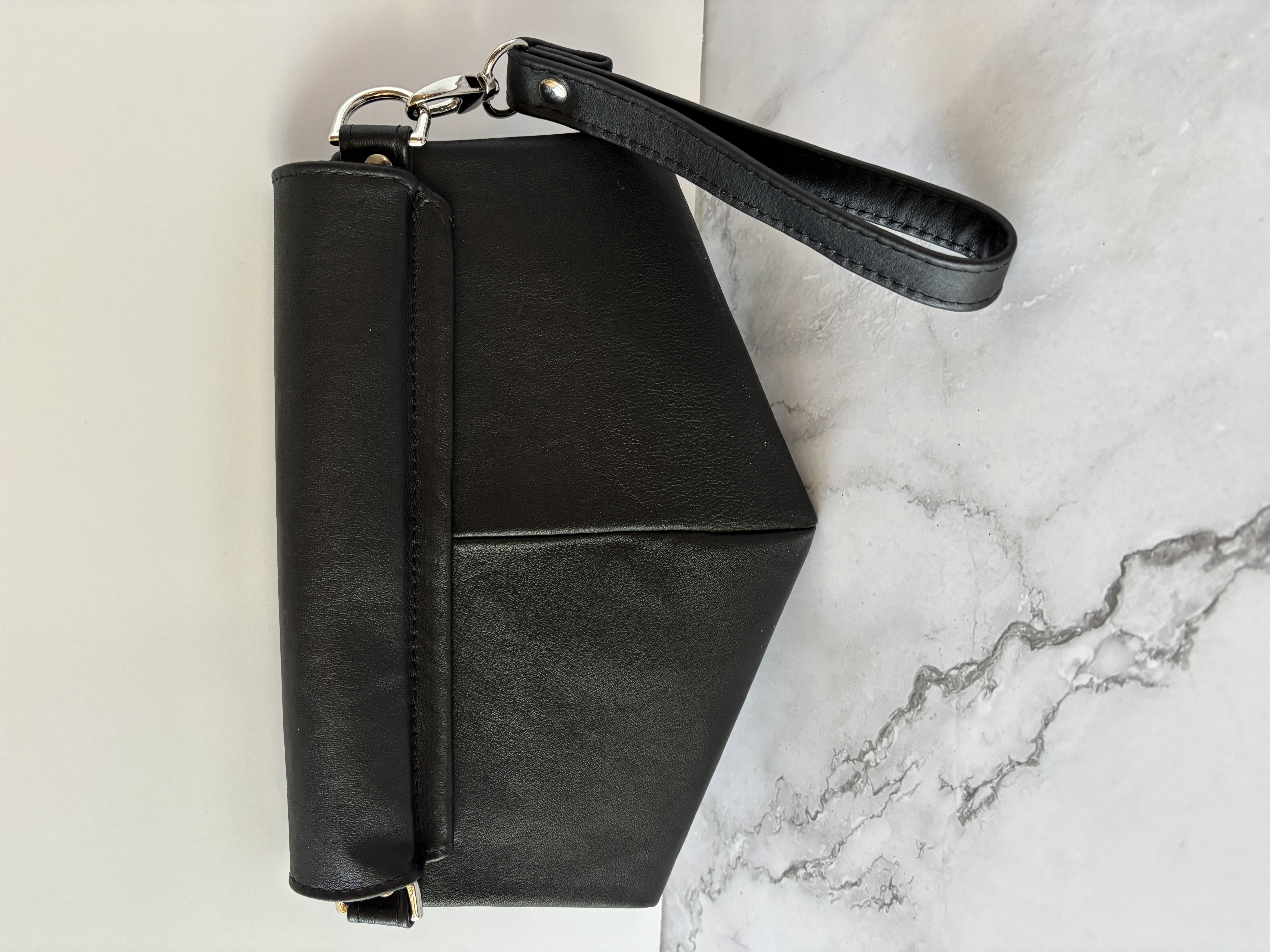 This Black Lambskin Leather Clutch Crossbody & Wristlet Handbag is crafted from luxuriously soft black lambskin leather, and is versatile enough to transition from day to night. This handbag is elegant, but also functional and it can be worn as a wristlet or styled as a crossbody with the removable, adjustable strap.