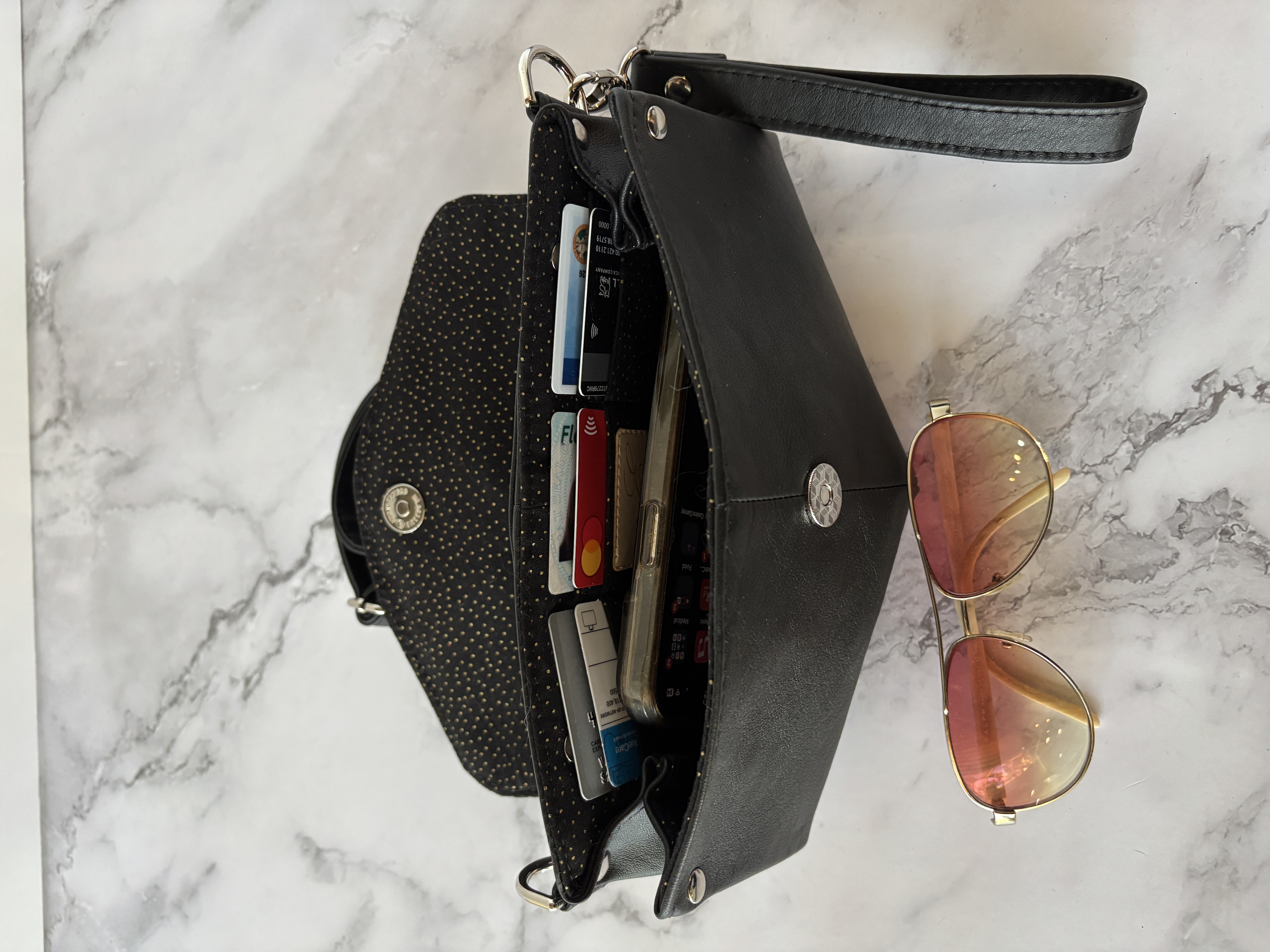 The interior is just the right size — featuring built-in credit card slots so you can ditch a bulky wallet and keep essentials neatly in place. The spacious main compartment comfortably holds your phone, keys, sunglasses, and daily must-haves, all secured with a magnetic snap closure.