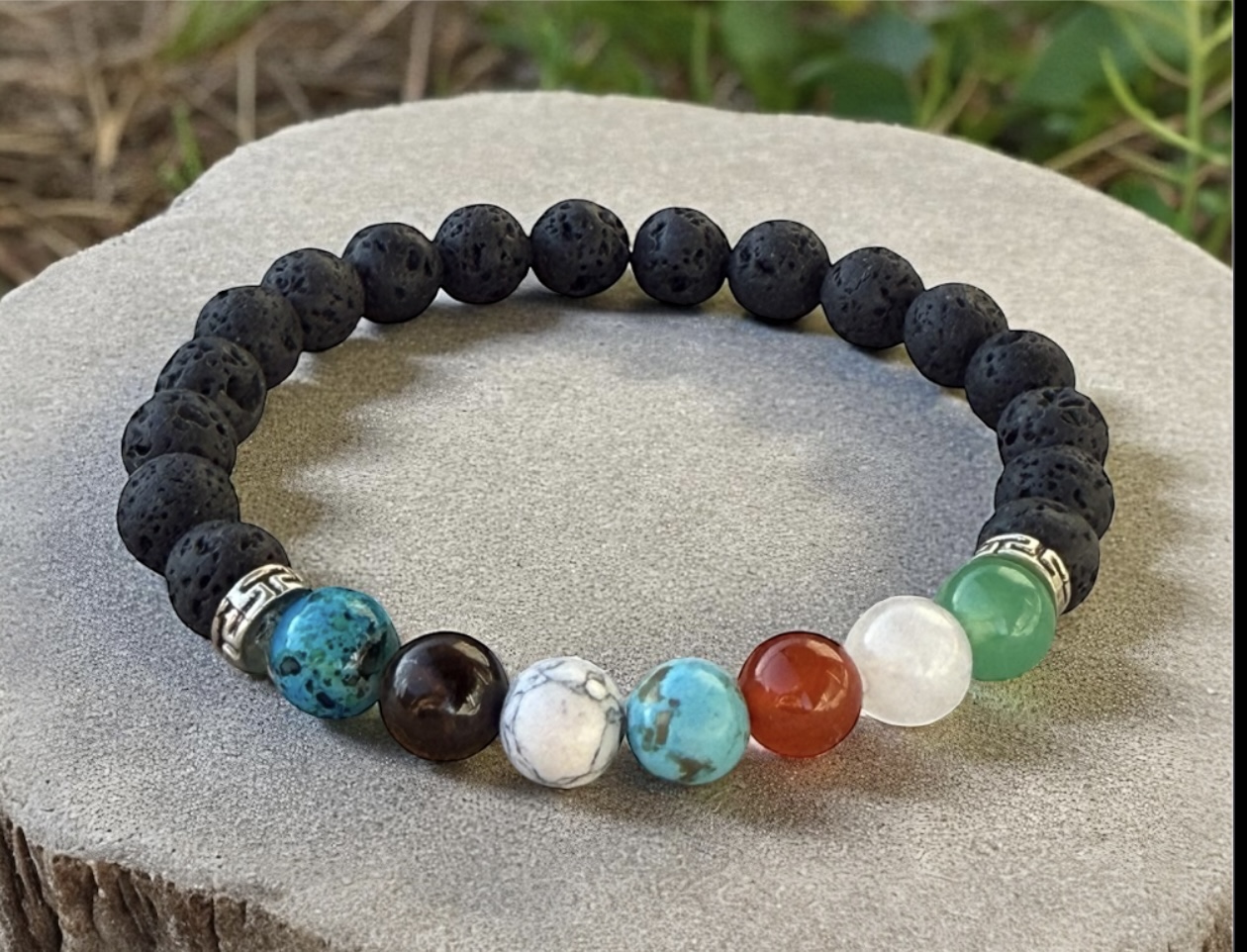 The colored agate beads add to the contrasting black lava stones. The beads are 8mm in size.