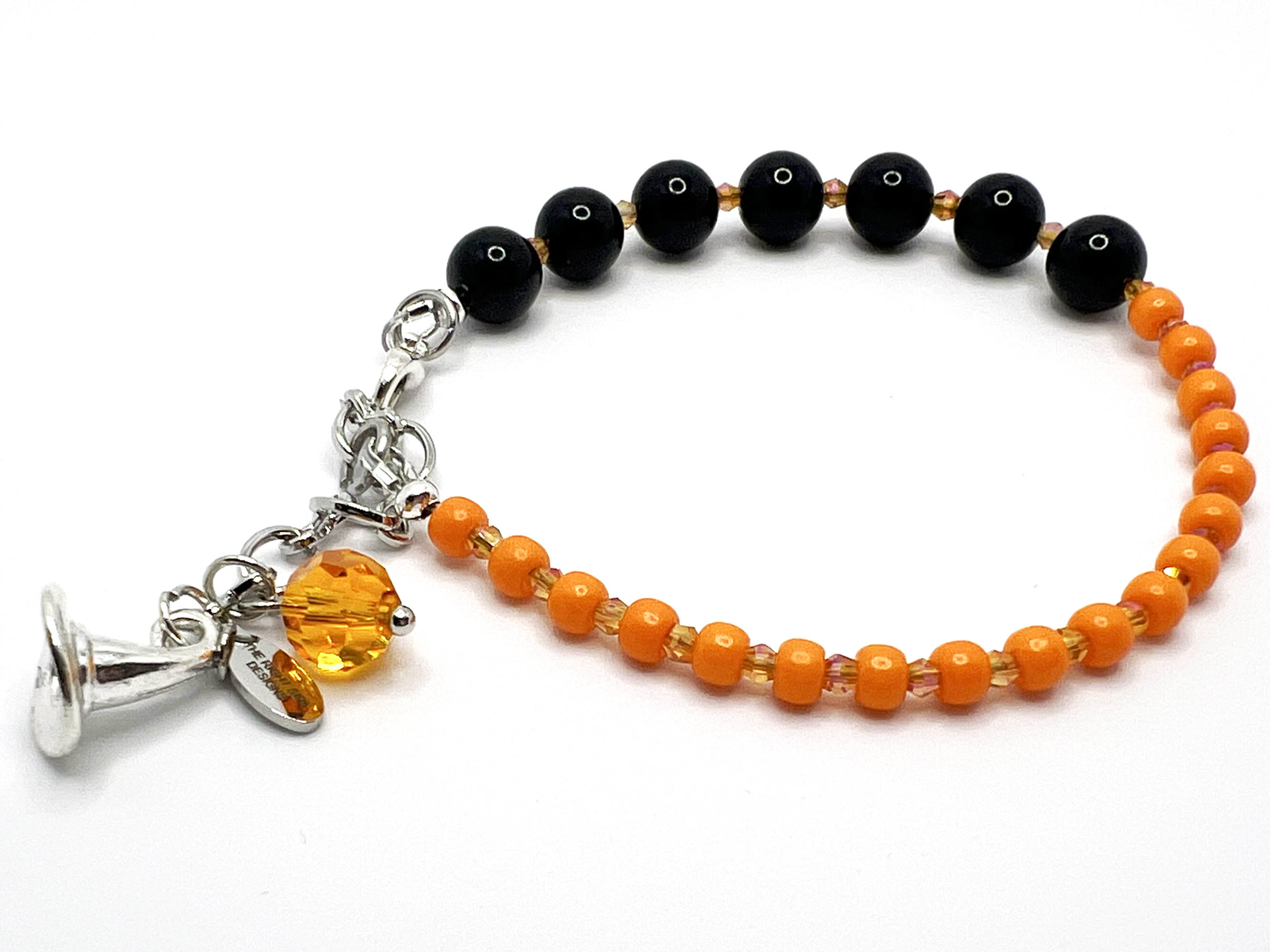 Celebrate spooky season in style with this festive handcrafted bracelet! Featuring a striking mix of 6mm black glass beads and 6/0 orange seed beads, accented with 2mm orange crystals for extra sparkle. The design is finished with a whimsical silver-toned witch’s hat charm and an orange crystal dangle, adding just the right amount of Halloween magic.