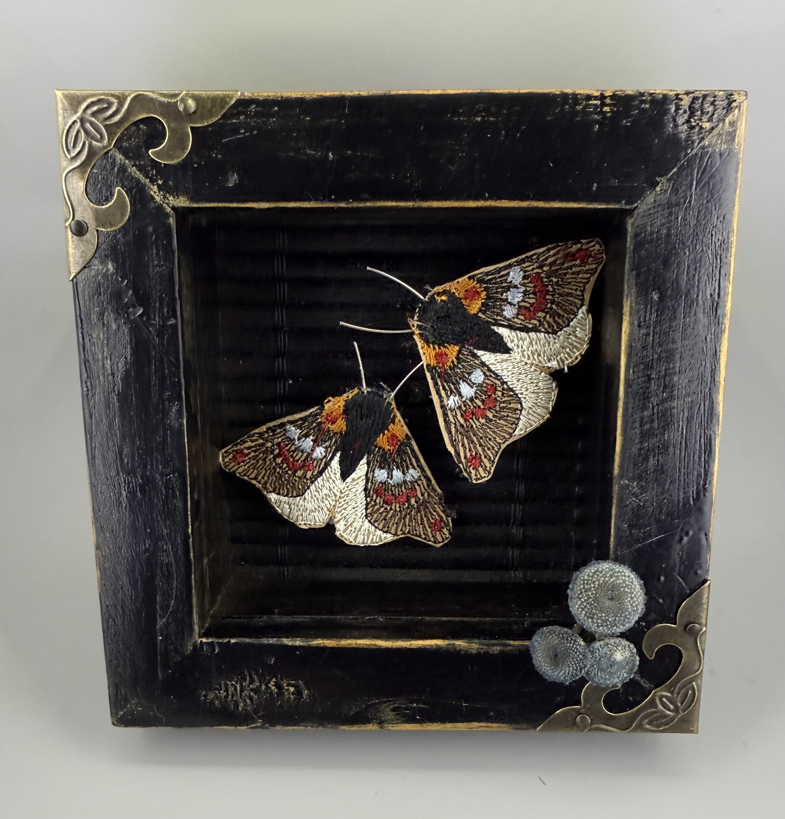 This is a 4 1/4” x 4 1/4” distressed, and ornamental shadowbox. The moths are embroidered and set on display along with moss ready to be hung on your wall.
