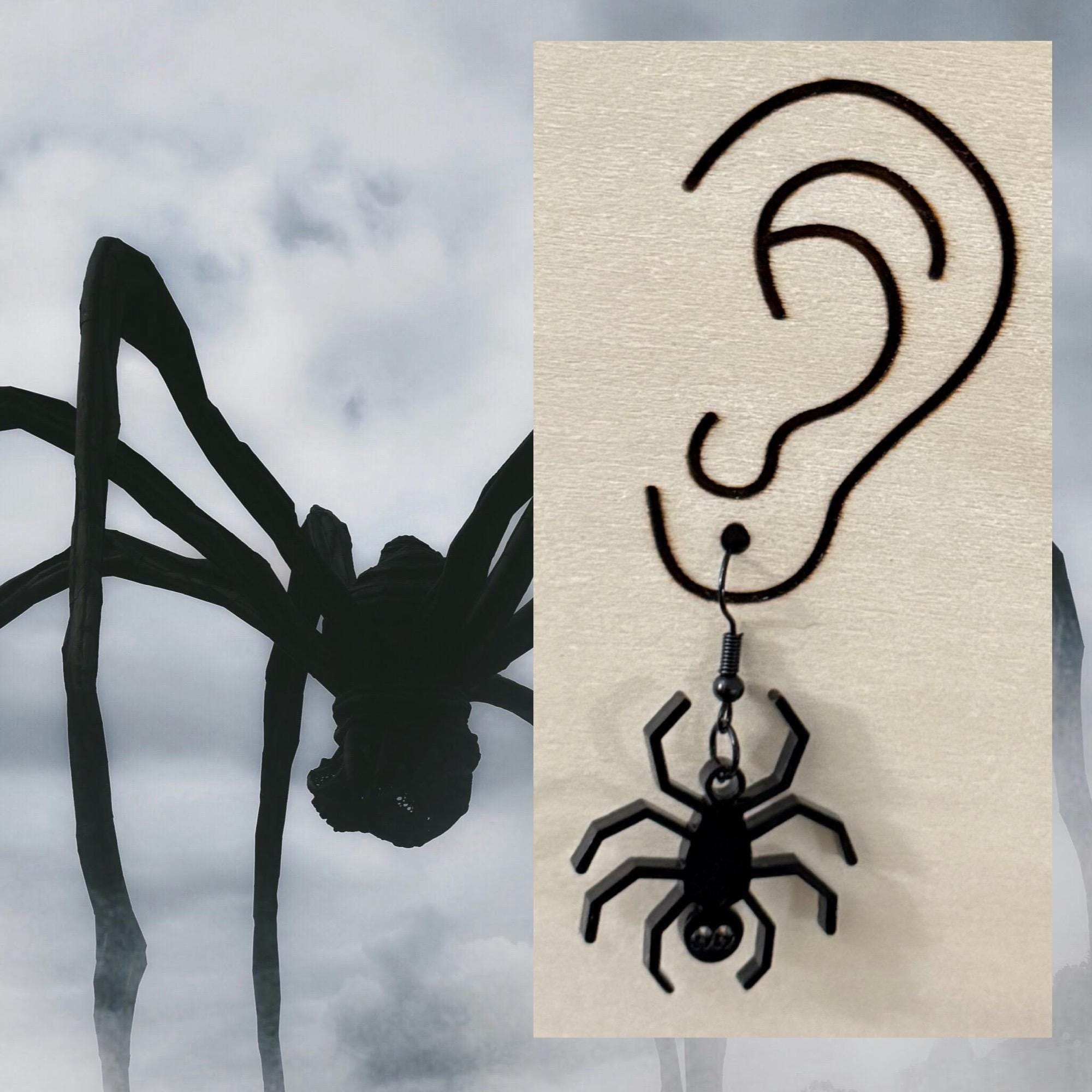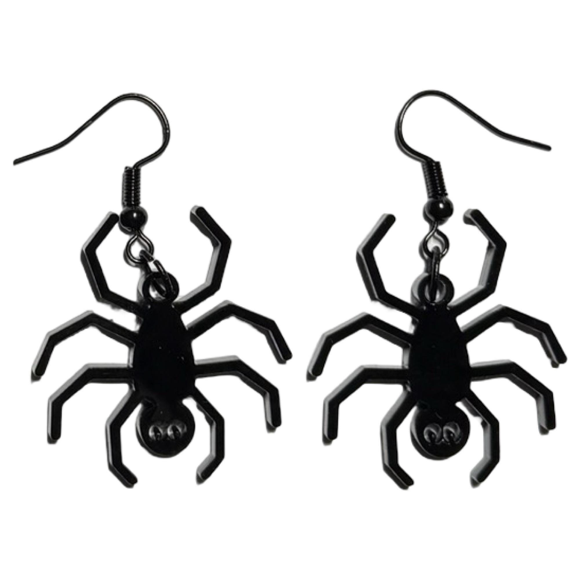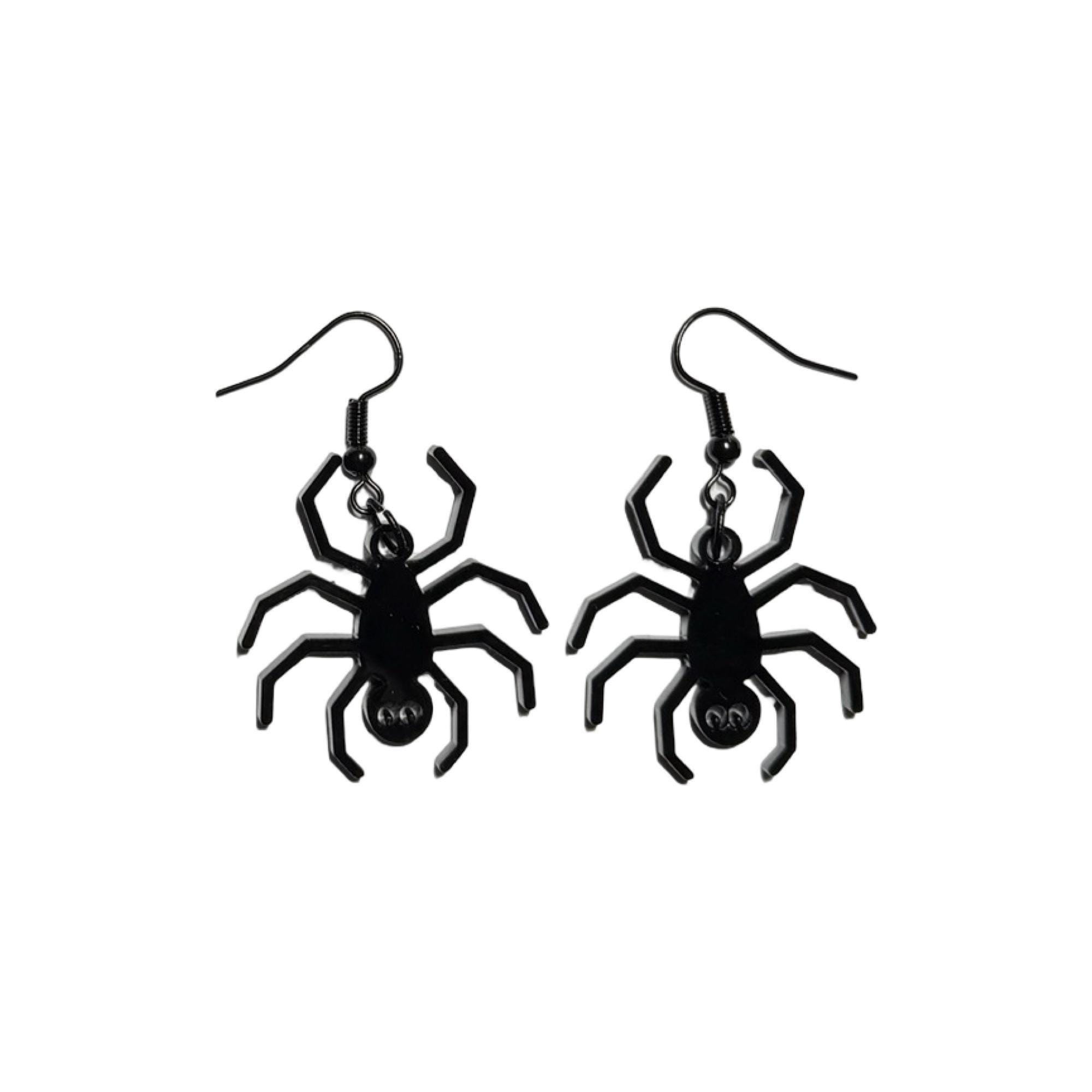 These are a pair of black spider laser cut lightweight acrylic earrings. They are made from 1/8 in thick medium black acrylic. They are on ear wires. All metal components are silver, gold, or brass plated, or black alloy, nickel & lead free, and hypoallergenic. They are approx. 1.25" long. Backs not included but available upon request.