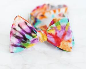 • velcro straps are sewn onto the backside side of the bow tie on each side • wrap around to secure it to a pet’s collar.