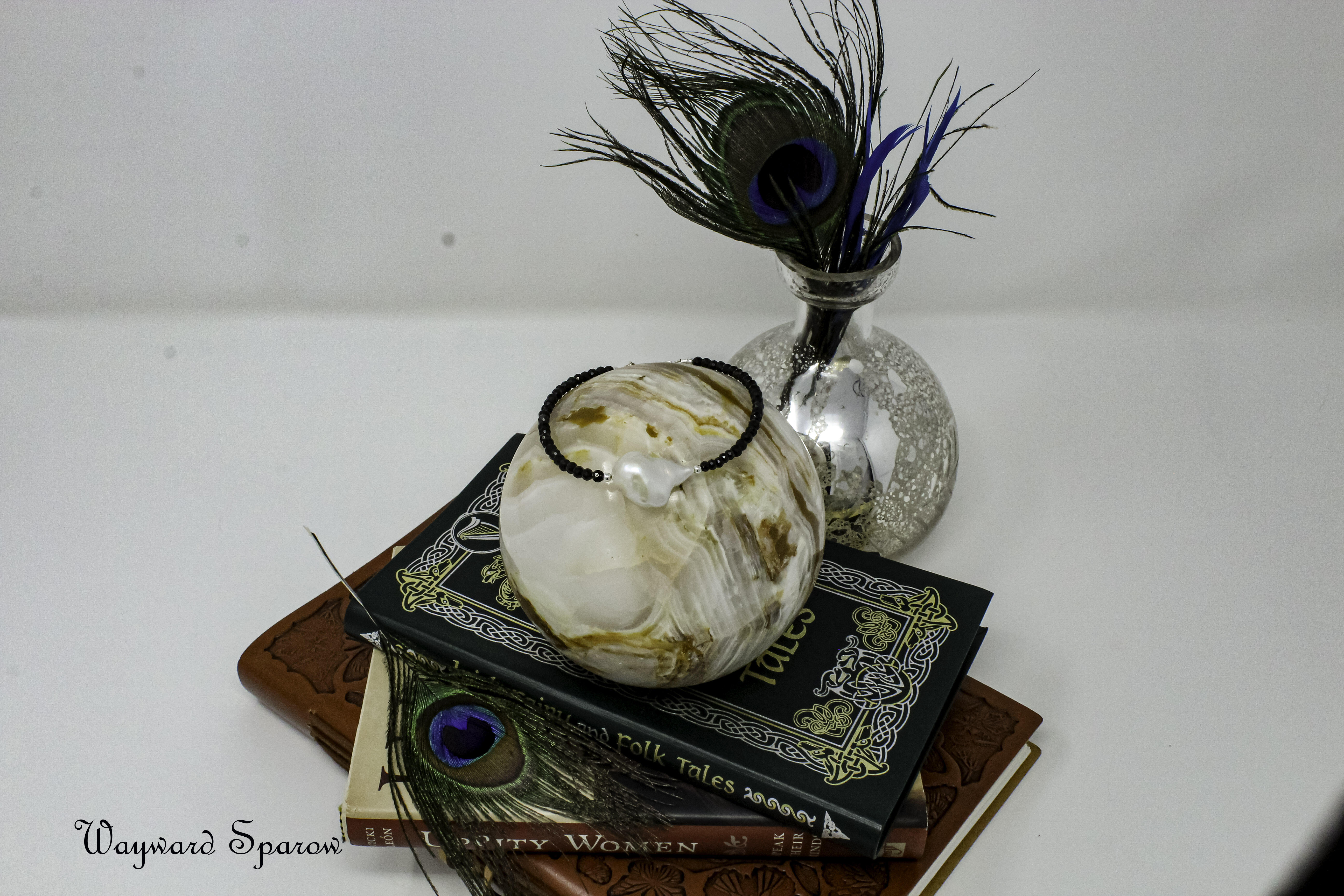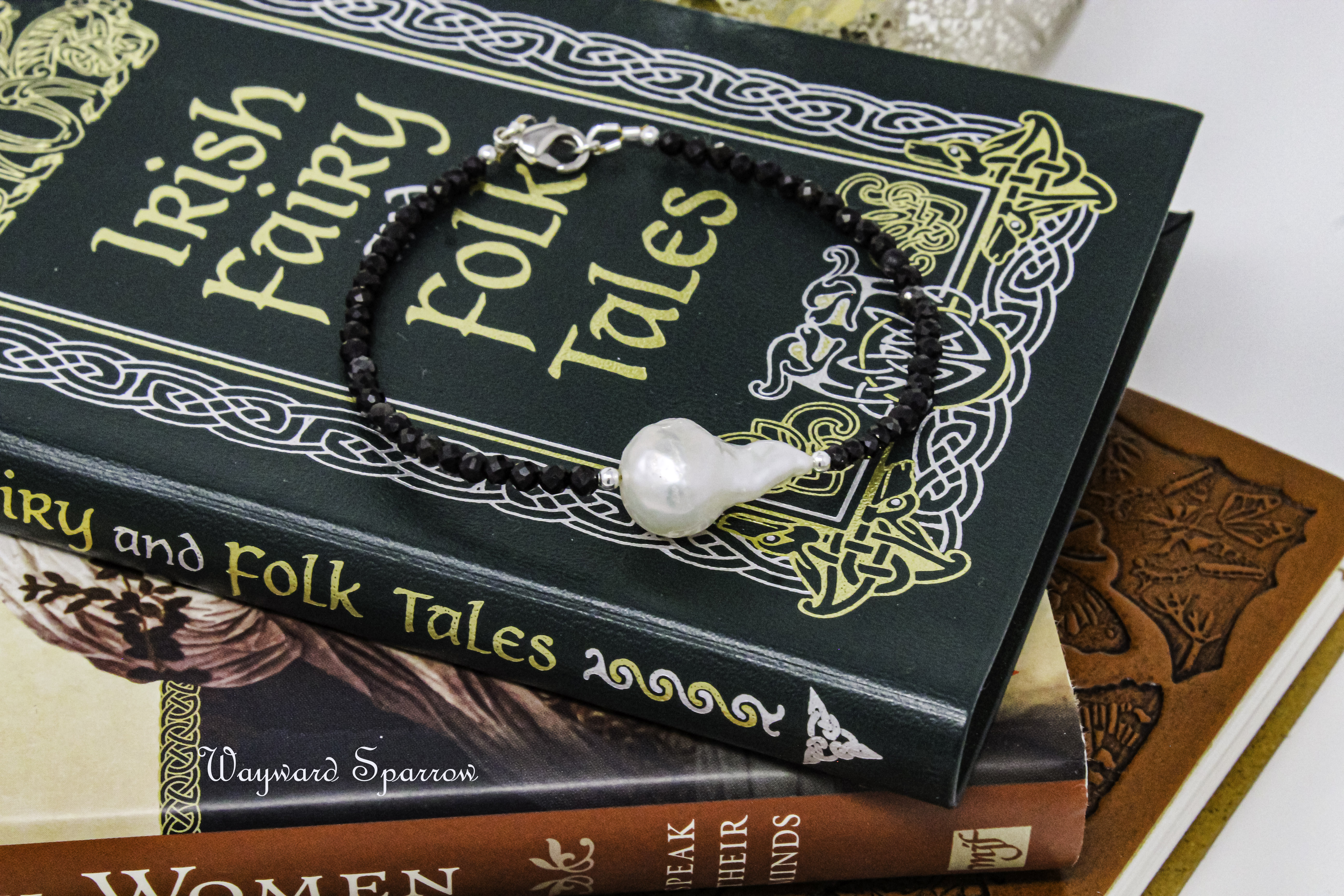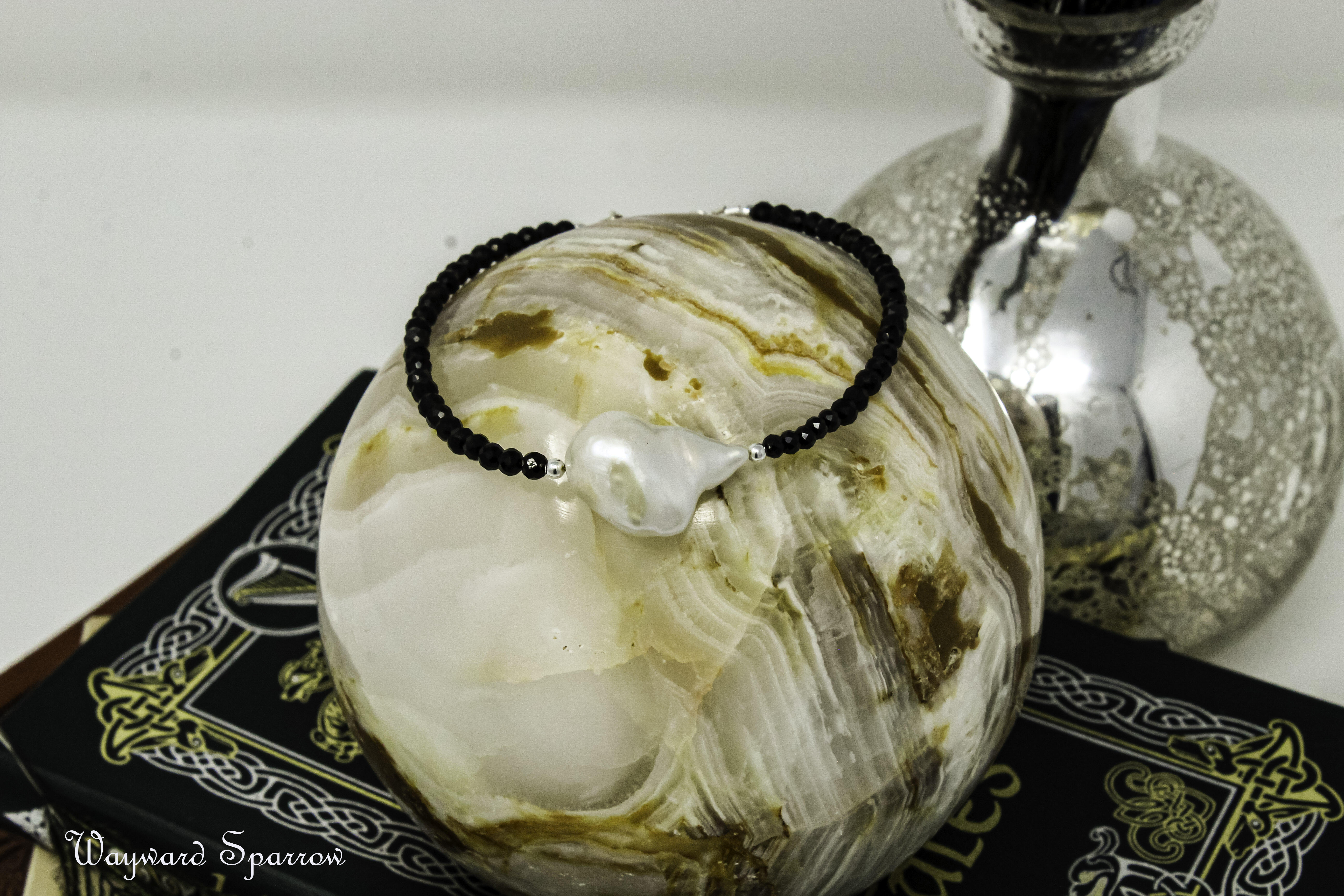 Micro-faceted black tourmaline with a uniquely shape baroque freshwater pearl. Bracelet measures 8.5 inches.