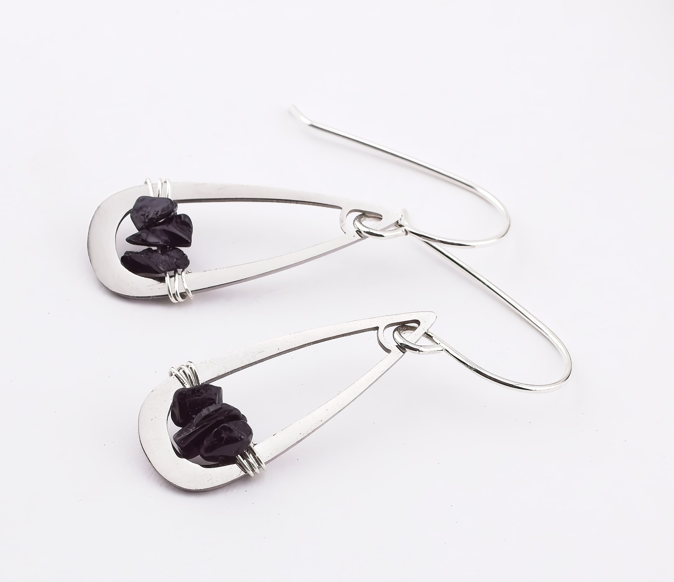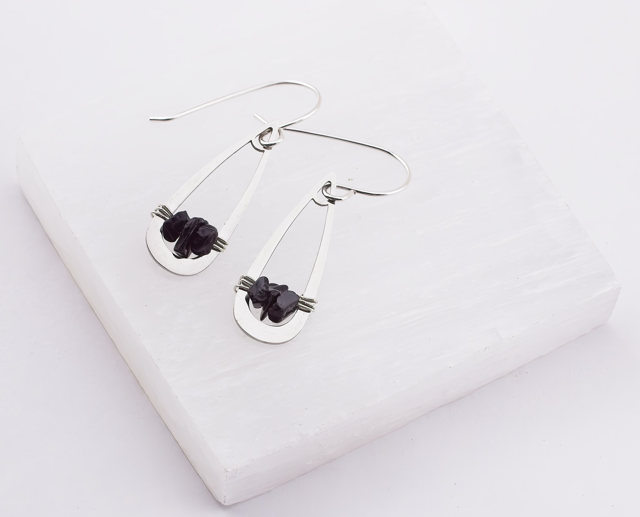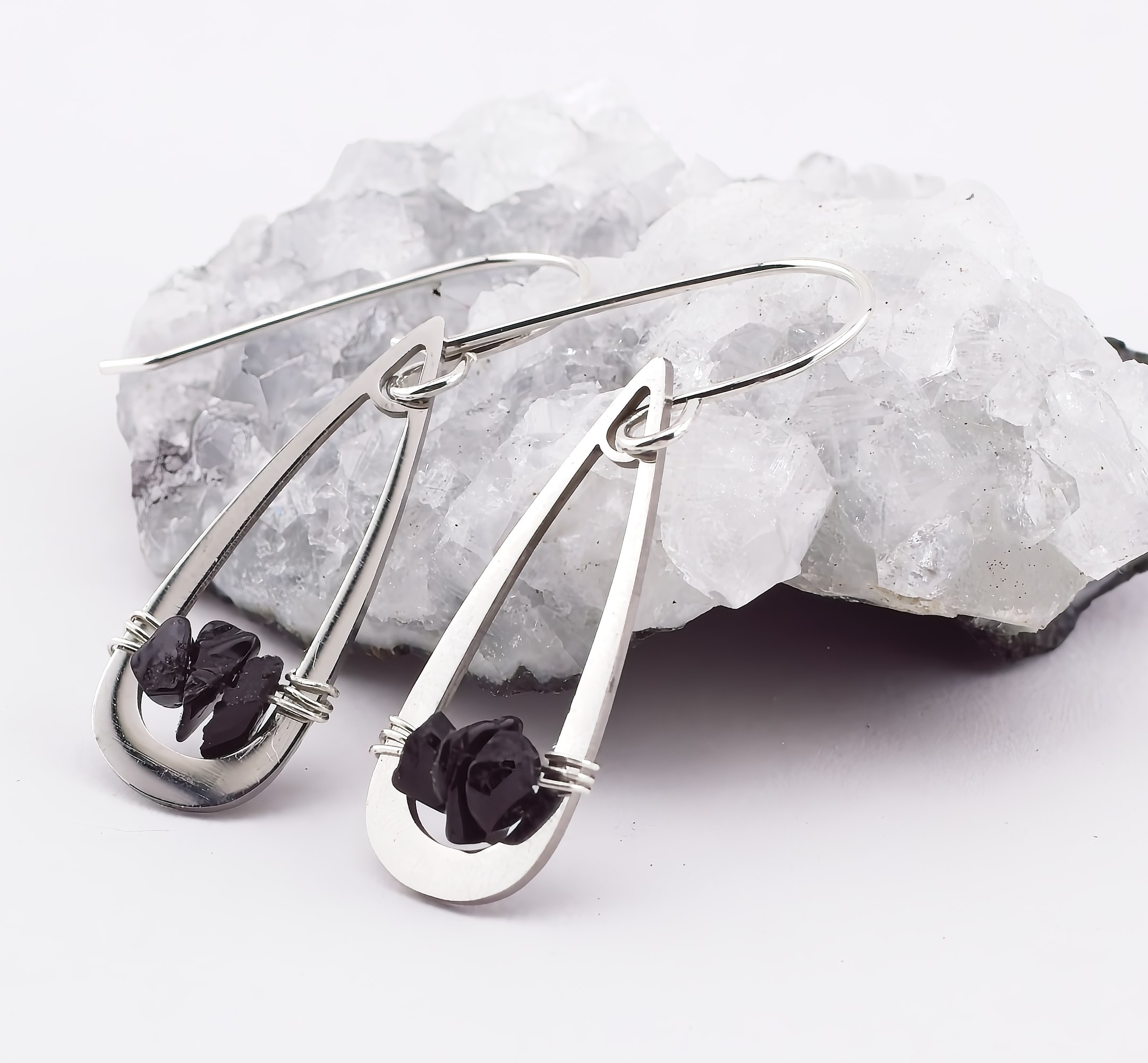 A charming gift to yourself or a loved one, these striking teardrop-shaped raw black tourmaline earrings have alluring shape and natural beauty. Modern and bold, the teardrops are very flattering in sturdy stainless steel. The contrast of the deep black tourmaline against the silver frame allow its organic qualities to shine through.