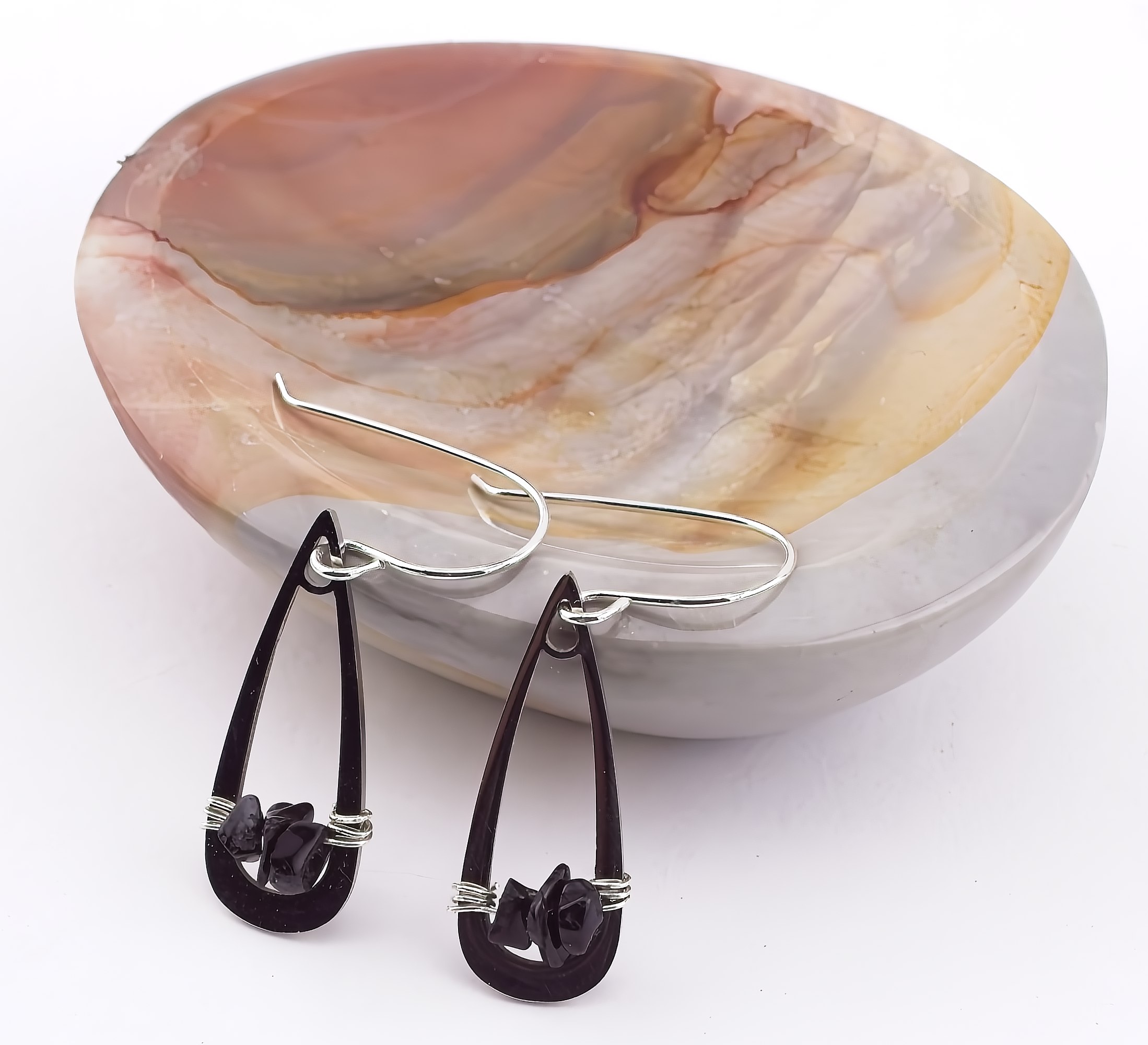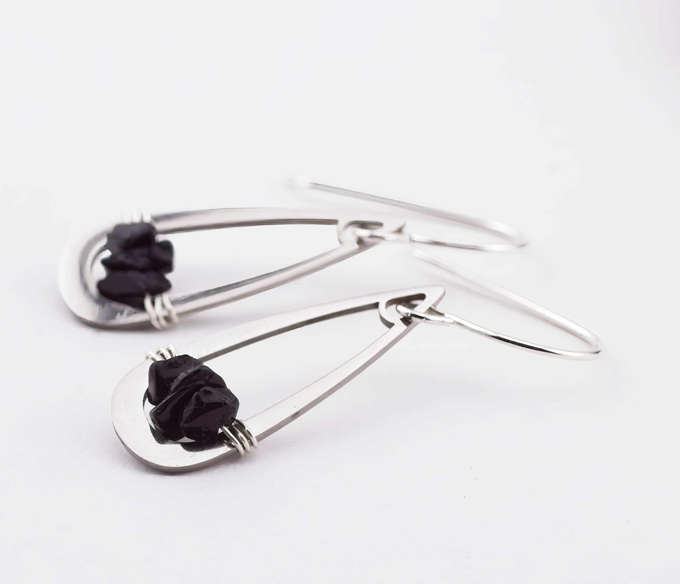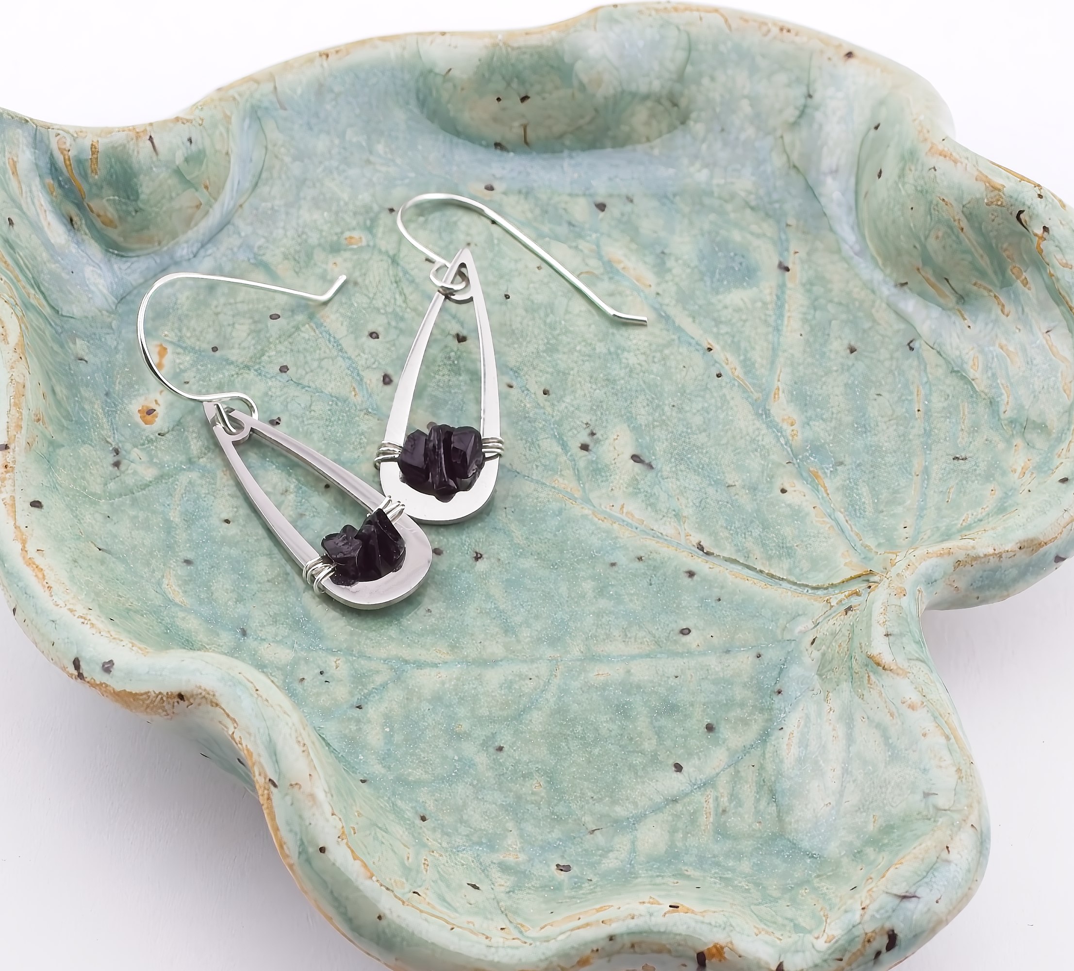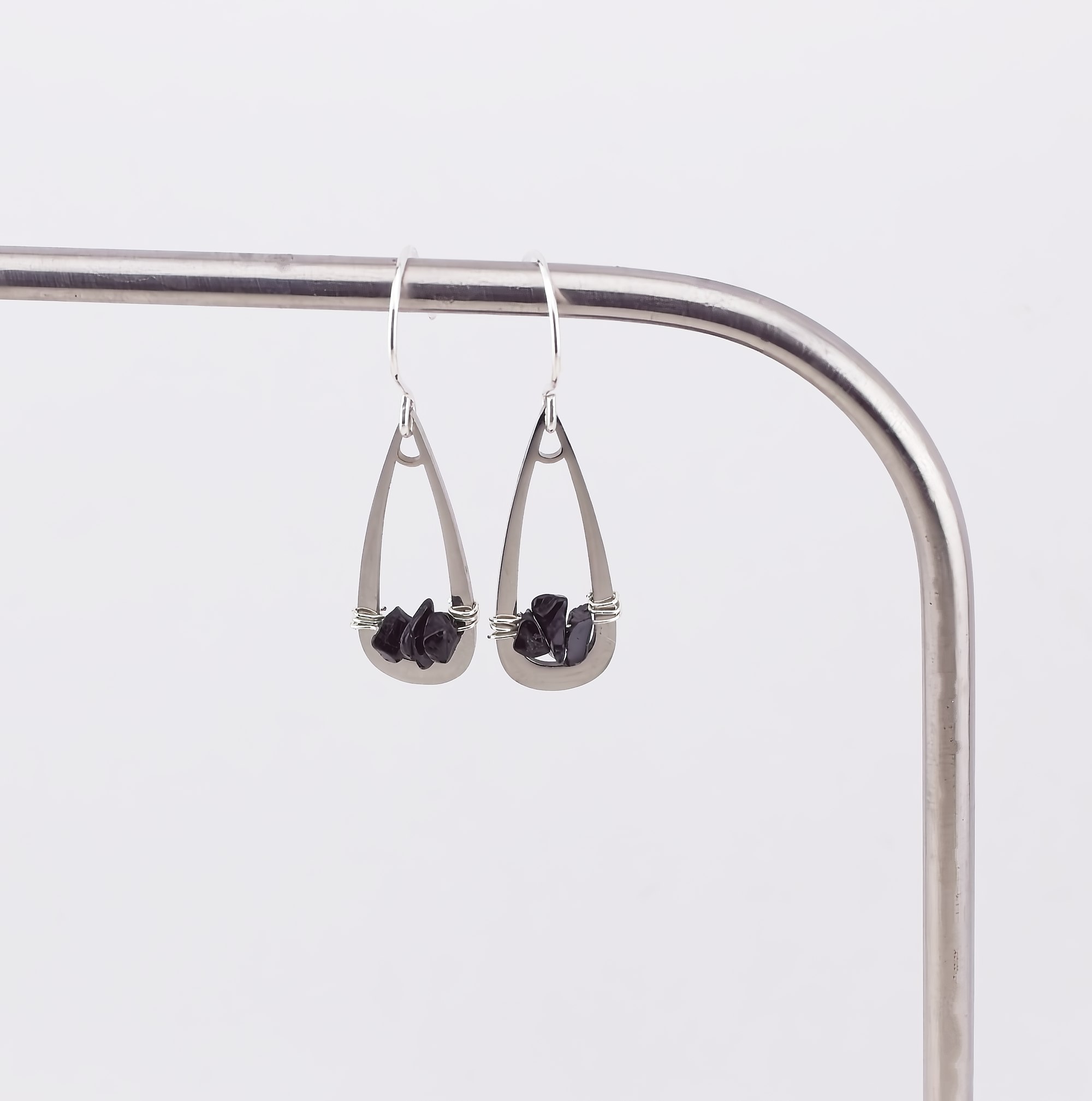 A charming gift to yourself or a loved one, these striking teardrop-shaped raw black tourmaline earrings have alluring shape and natural beauty. Modern and bold, the teardrops are very flattering in sturdy stainless steel. The contrast of the deep black tourmaline against the silver frame allow its organic qualities to shine through.