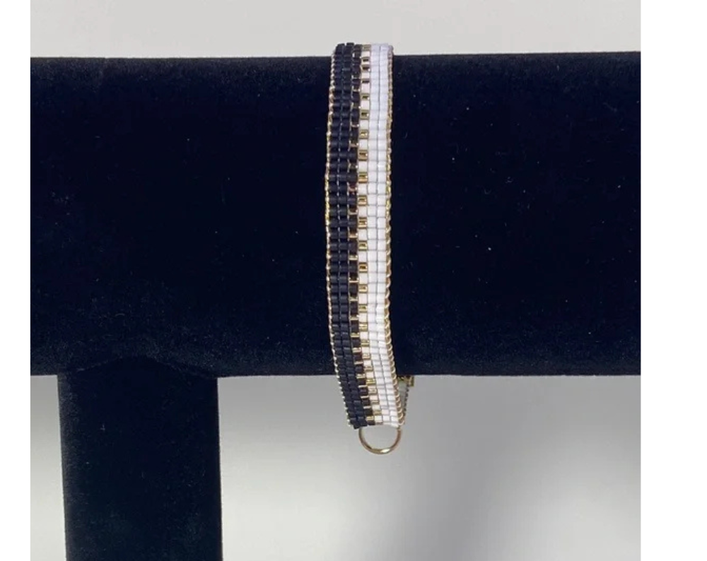 Perfect for adding a touch of sophistication to any outfit. Chic bracelet featuring intricate Black and white beadwork. Stylish and versatile accessory.